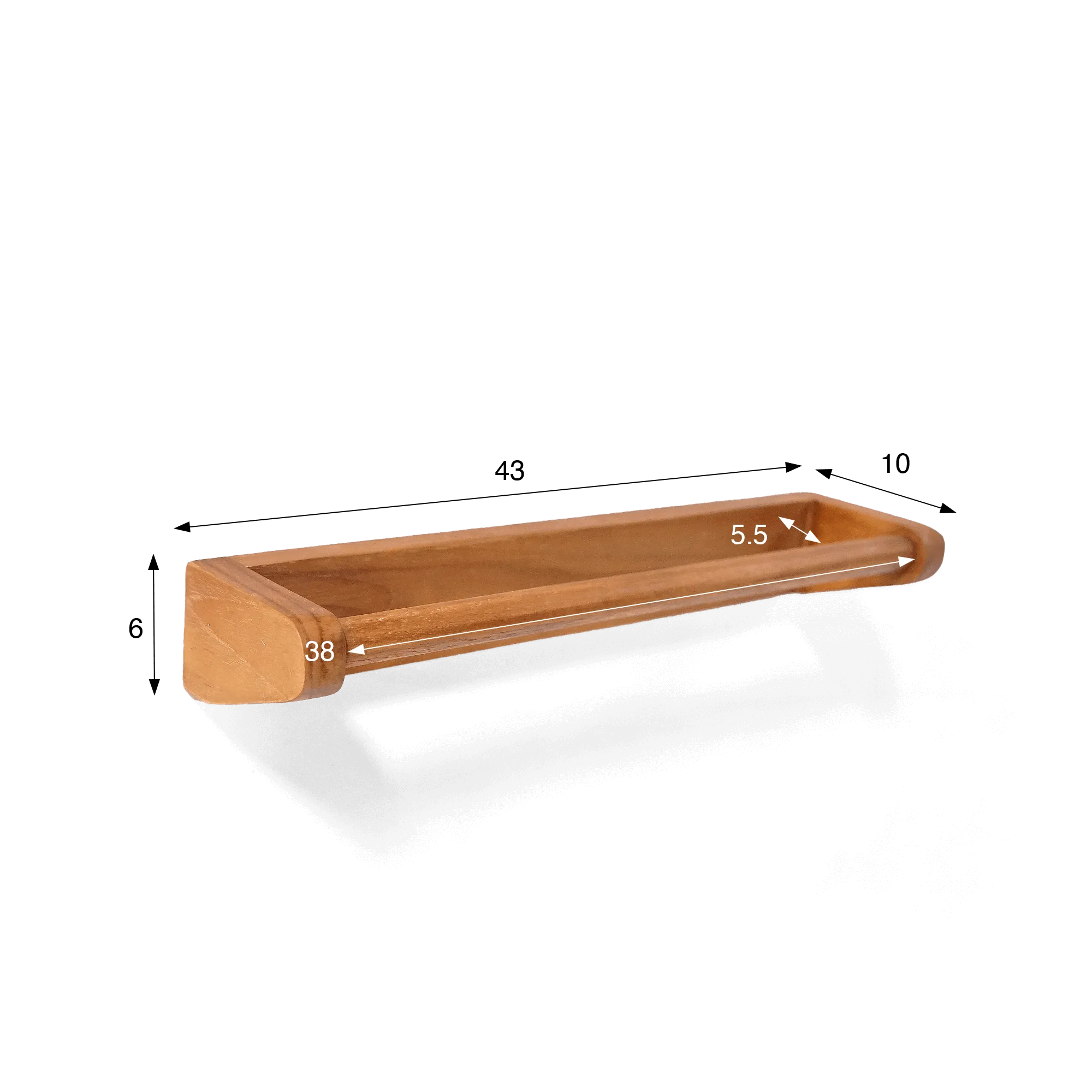 Avec une longueur de 43 cm, une profondeur de 10 cm et une hauteur de 6 cm, ce porte servivettes en bois de teck offre une parfaite proportion pour accueillir une serviette de bain ou un linge de toilette plié. Son design compact et léger permet de le fixer aisément sur tout type de mur, tout en conservant une impression de légèreté et d’harmonie visuelle.