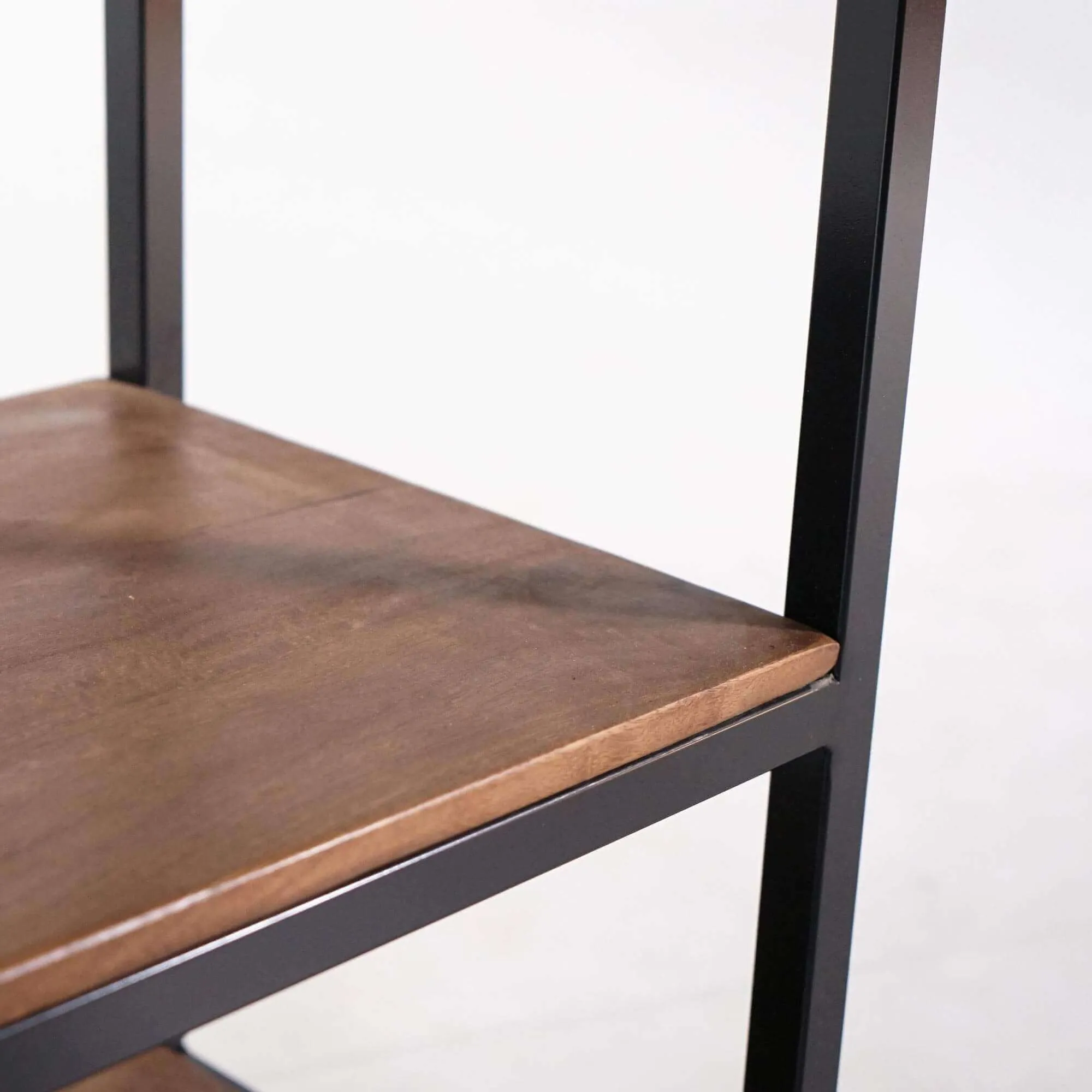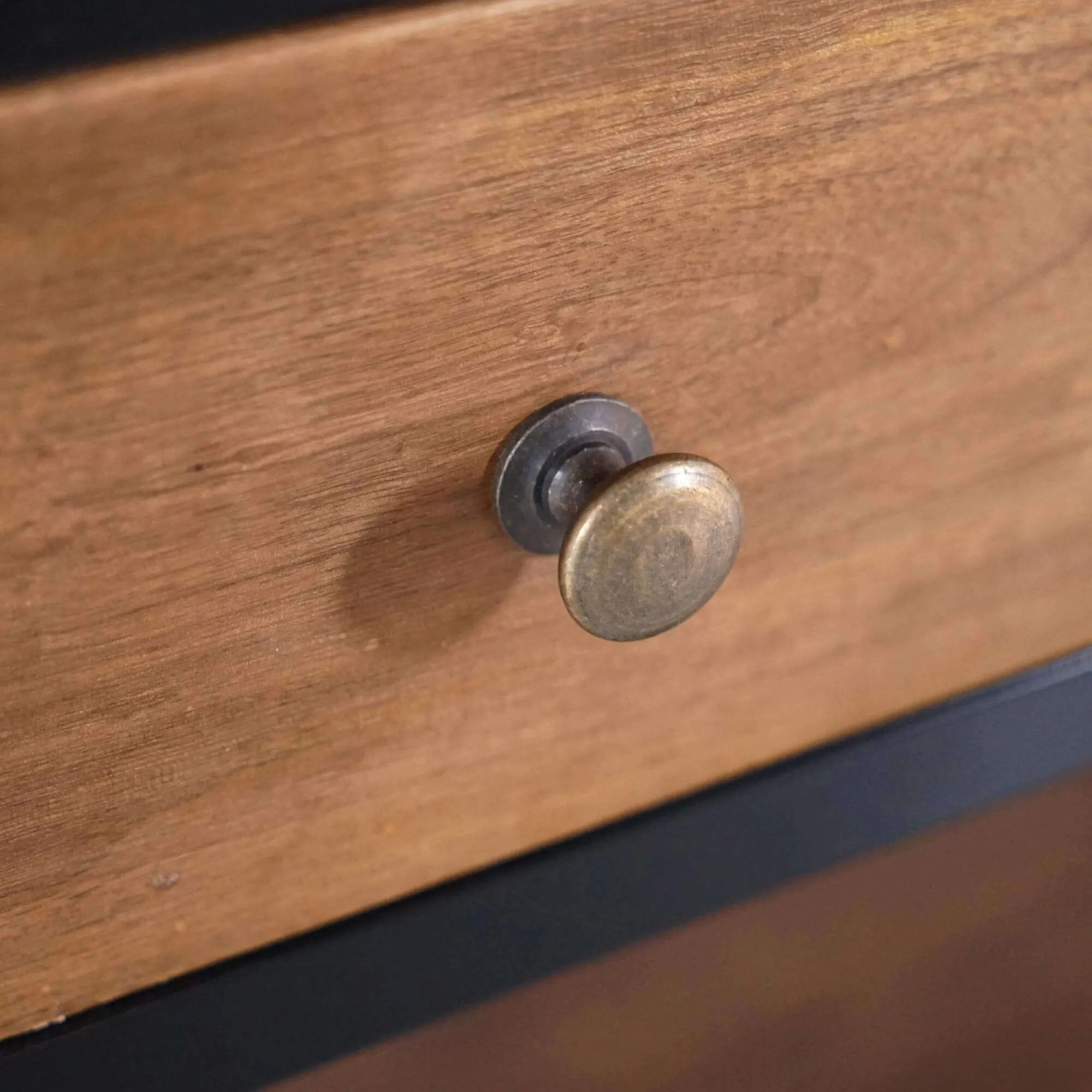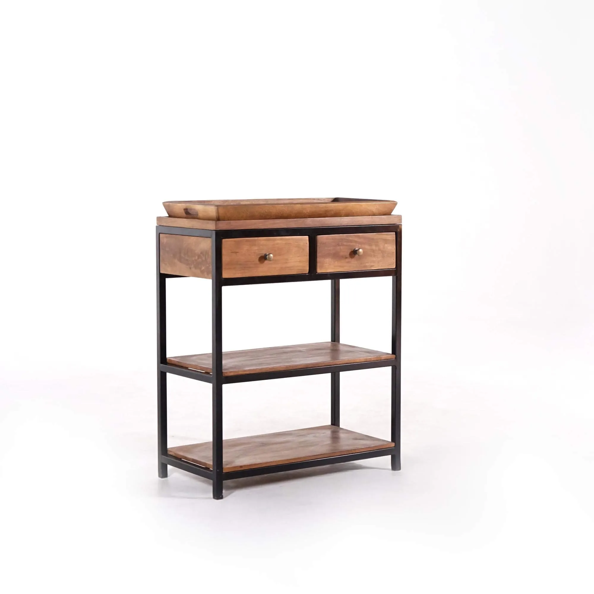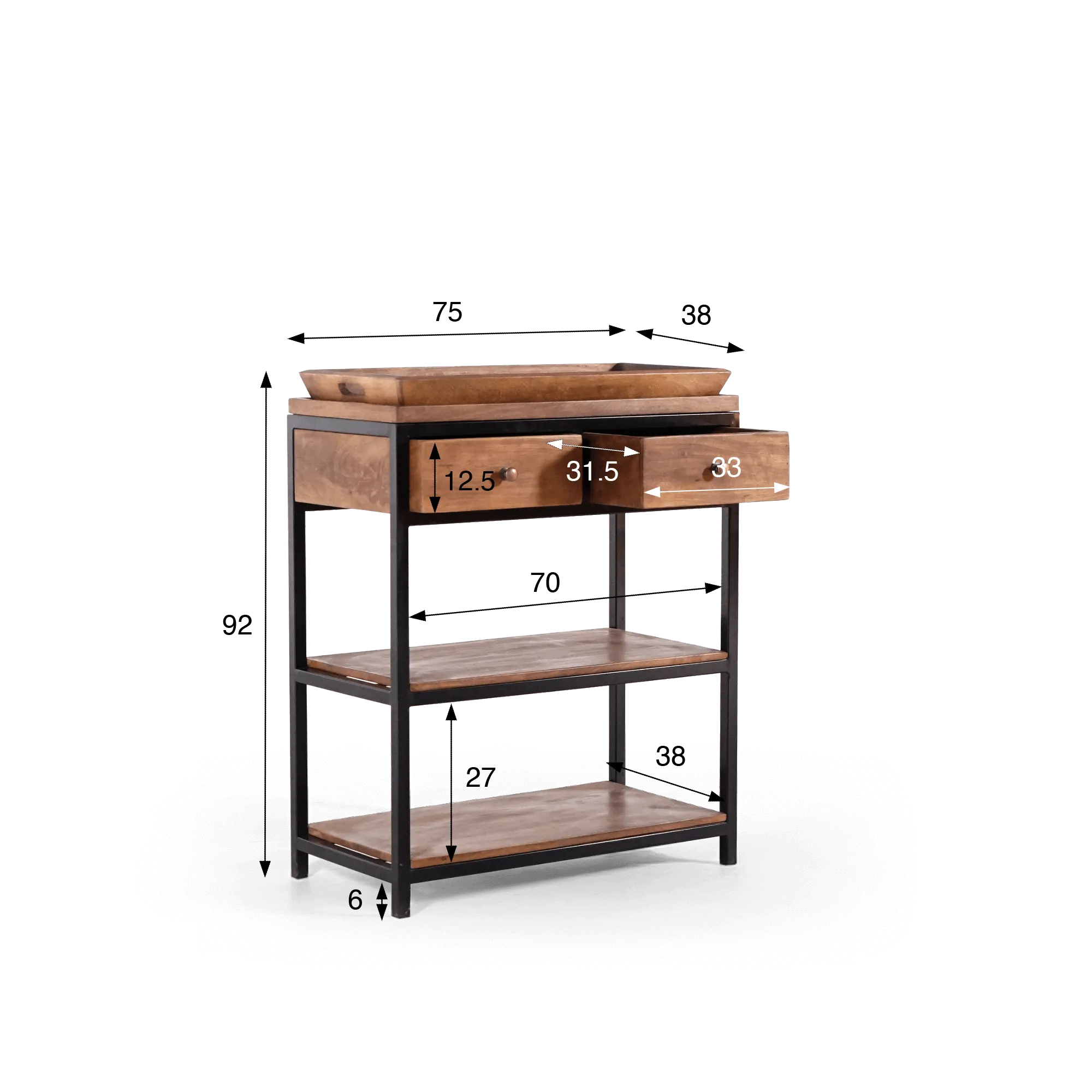 Les deux tiroirs qui composent l'étage inférieur de cette console en bois naturel et pieds en métal, d’une largeur de 33 cm et d’une hauteur de 12,5 cm chacun, offrent un espace discret pour ranger les petits accessoires, tandis que les deux étagères inférieures, espacées de 27 cm, accueillent livres, paniers ou vaisselle. L’ensemble repose sur une structure en métal tubulaire fine et solide, dont la finition mate souligne l’élégance naturelle du bois recyclé, marqué par ses veinures et légères irrégularités — autant de traces d’une matière authentique à laquelle nous tenions.