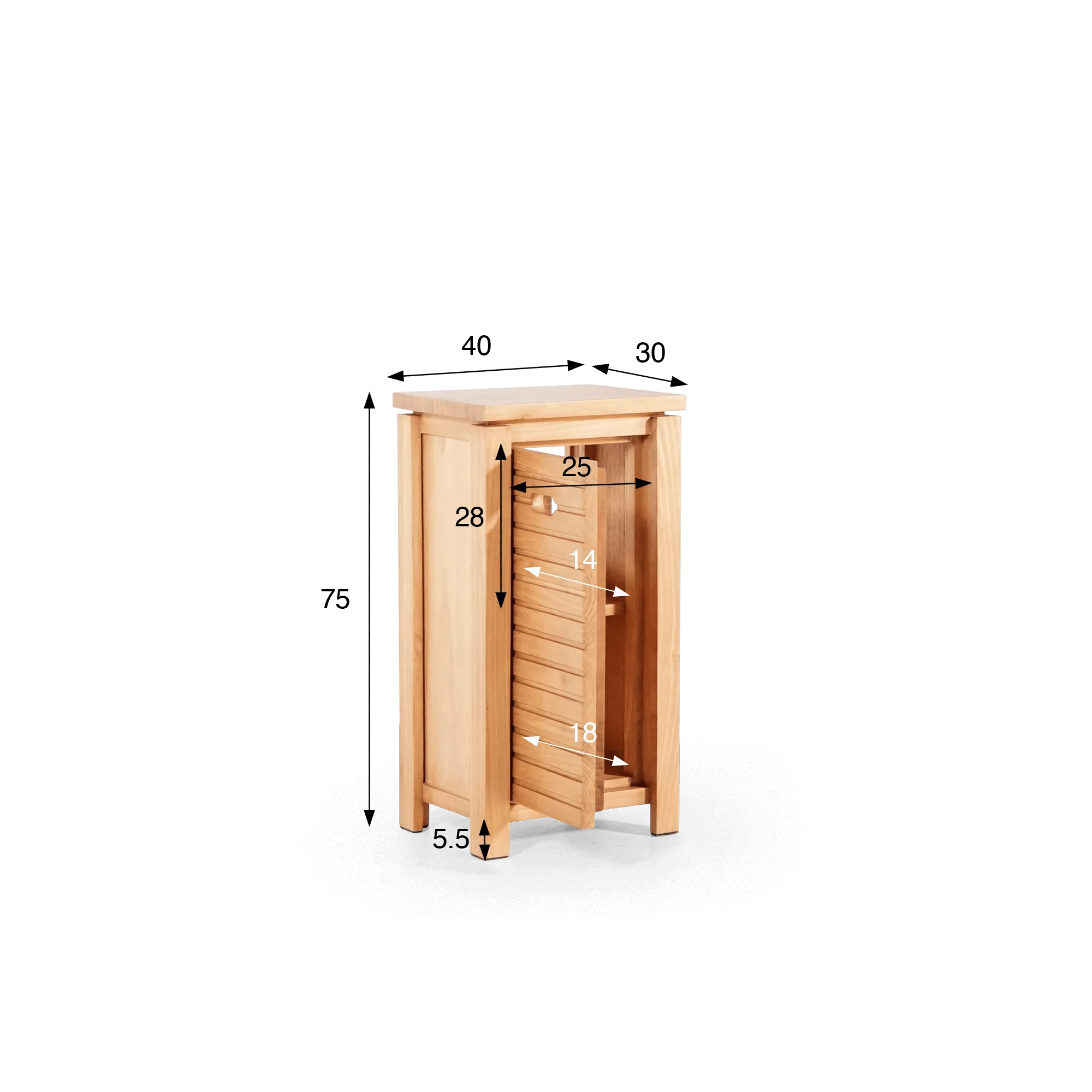 La silhouette élancée de ce meuble lave mains en bois massif – haute de 75 cm et large de 40 cm – a été pensée pour optimiser l’espace sans jamais perdre en confort. Derrière la porte battante, nos designers ont intégré deux niveaux de rangement (28 cm de haut pour chaque compartiment), permettant d’accueillir facilement produits de toilette, petites serviettes ou accessoires du quotidien. La profondeur intérieure de 14 à 18 cm en fonction des compartiments offre des solutions de rangement pratiques au regard de l’encombrement minimal. L’ouverture discrète, sculptée directement dans le bois, complète l’ensemble avec une simplicité fonctionnelle qui nous tenait à cœur.