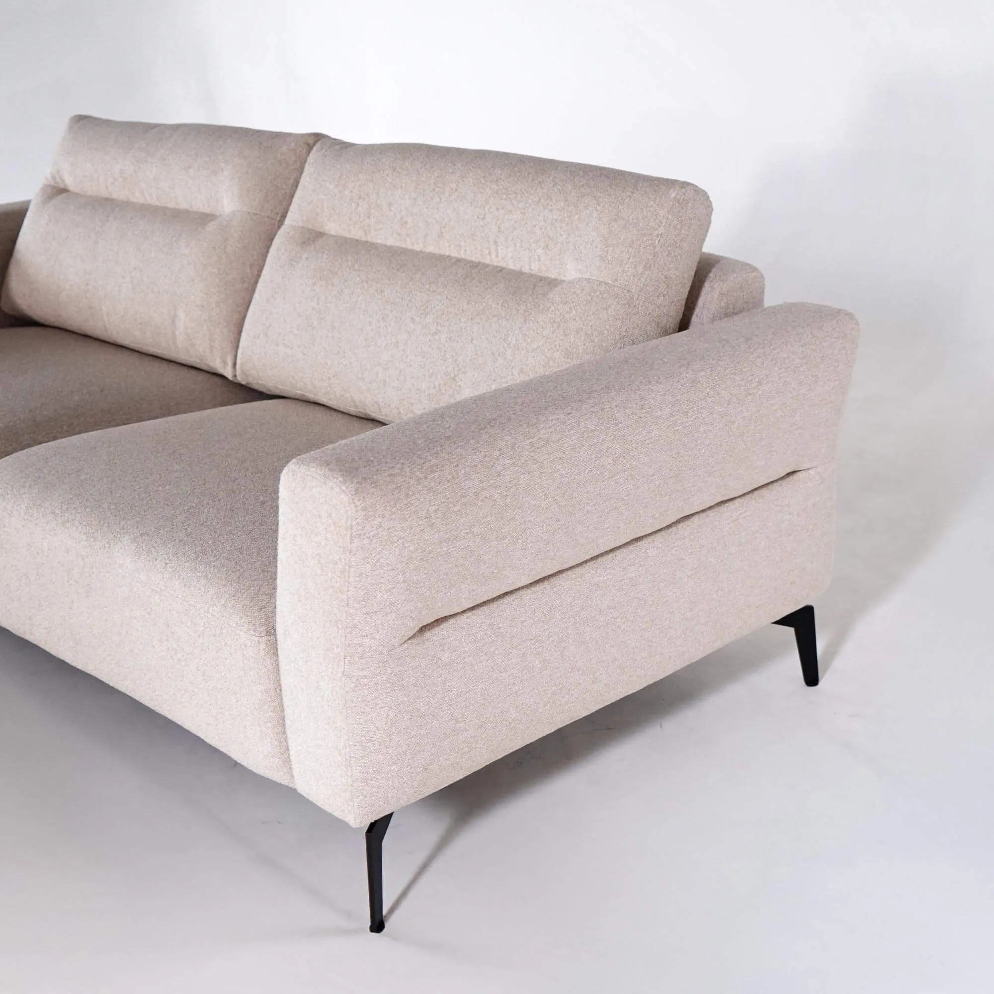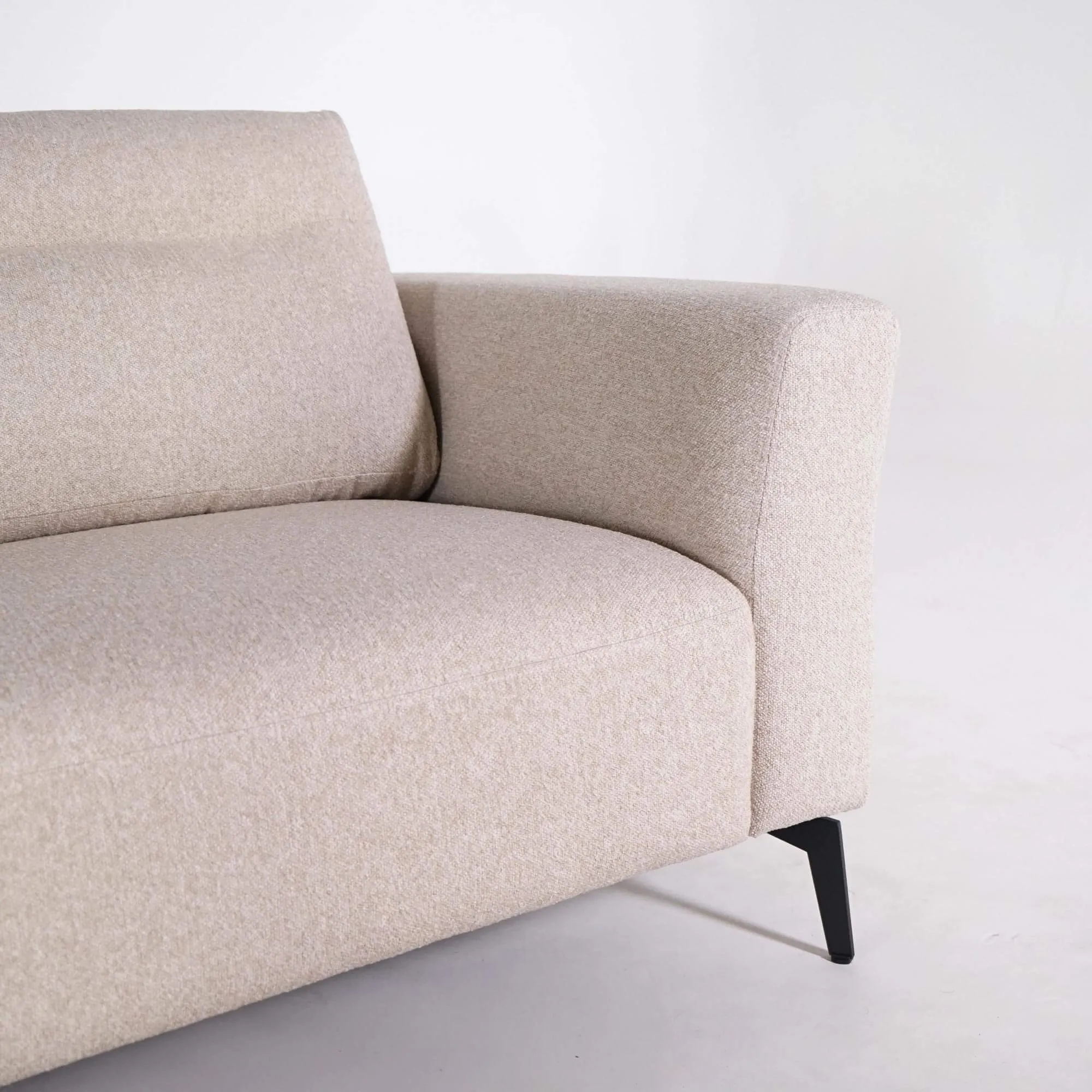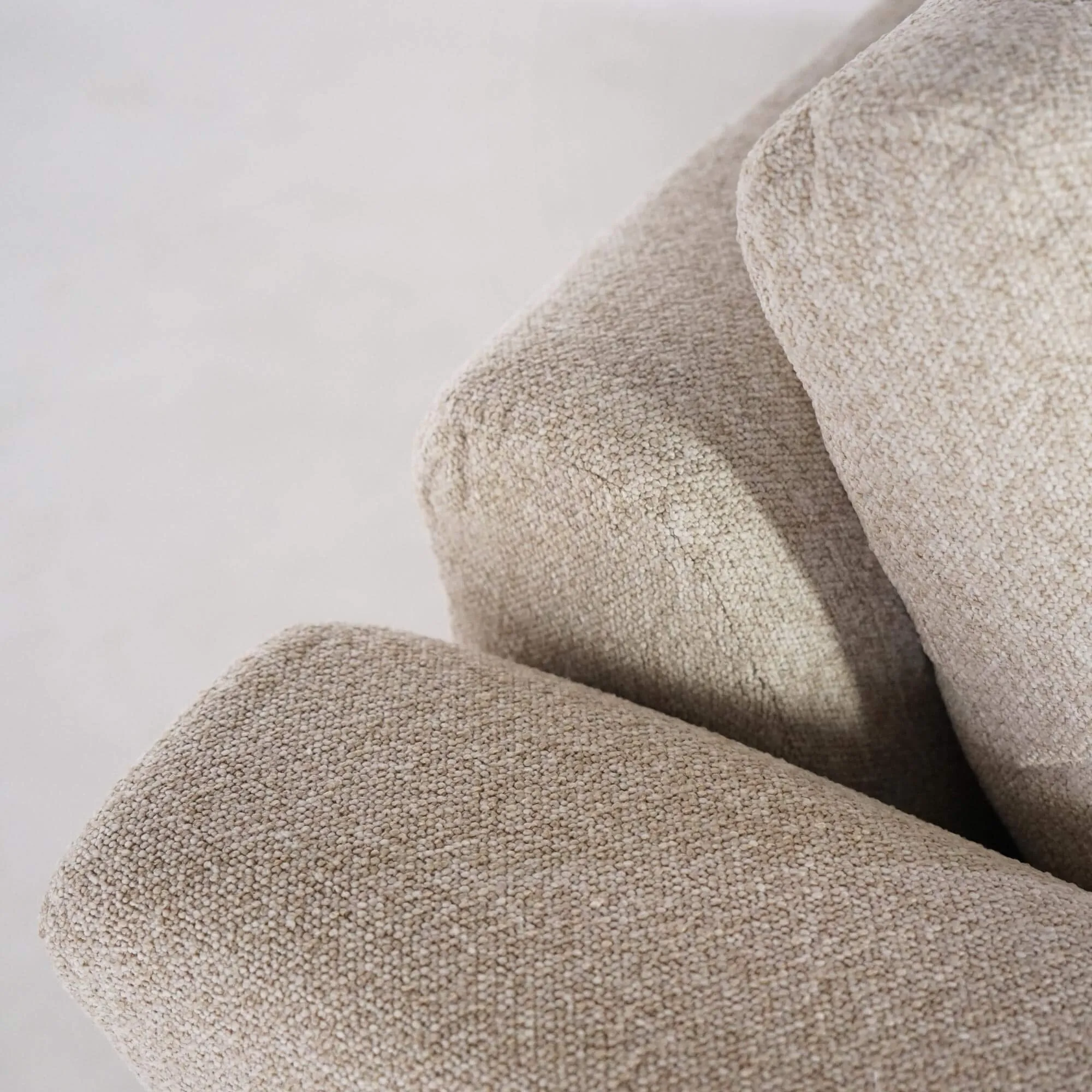 Le tissu bouclé de la collection Adventure qui habille ce canapé moderne 3 places a été sélectionné pour sa texture chaleureuse et sa résistance éprouvée. Sa composition 100 % polyester, testée selon des normes exigeantes, lui confère une excellente tenue dans le temps, avec une résistance à l’abrasion supérieure à 70 000 cycles Martindale. Ce choix de matière reflète notre exigence en matière de qualité, tout en offrant un toucher agréable et une élégance intemporelle dans des tons neutres qui s’harmonisent avec tout style d’intérieur. Les pieds en métal noir de 17 cm de hauteur apportent une note contemporaine et renforcent la légèreté visuelle de l’ensemble, tout en assurant une grande stabilité.