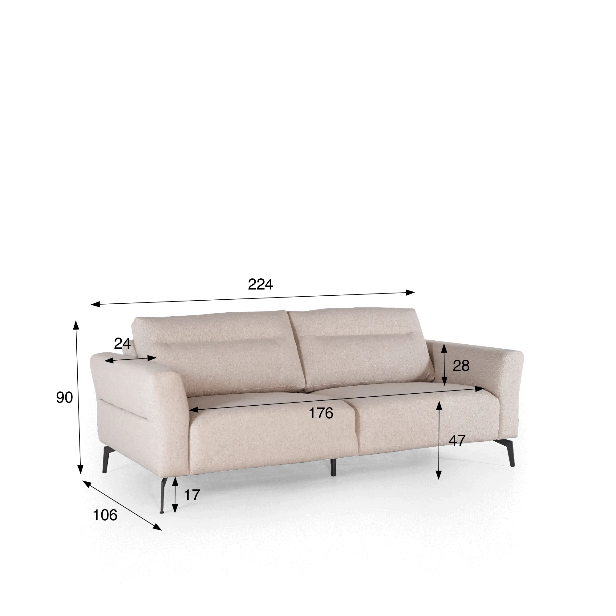 Nous avons particulièrement travaillé l’ergonomie de ce canapé moderne 3 places : l’assise profonde d'une hauteur de 47 cm garantit un confort optimal, soutenu par un rembourrage en mousses de différentes densités et des coussins de dossier enrichis en fibres de silicone. L’ensemble offre un accueil souple et généreux, pensé pour accompagner aussi bien les moments conviviaux que les instants de repos. Ce canapé moderne 3 places mesure 224 cm de largeur sur 90 cm de hauteur et 106 cm de profondeur, ce qui en fait une pièce adaptée aux espaces de vie modernes recherchant confort et élégance.