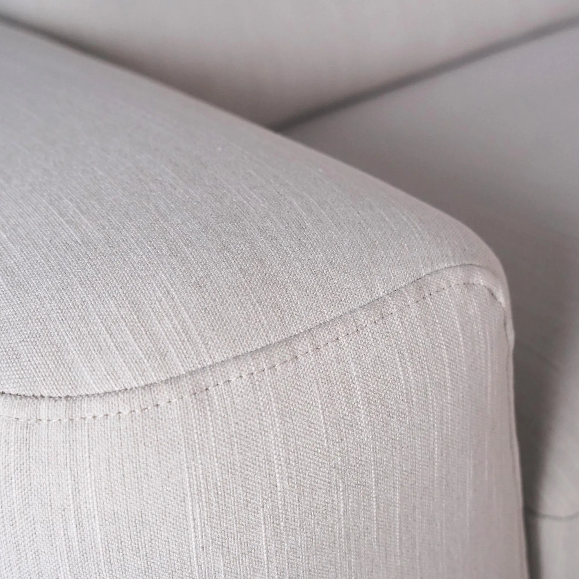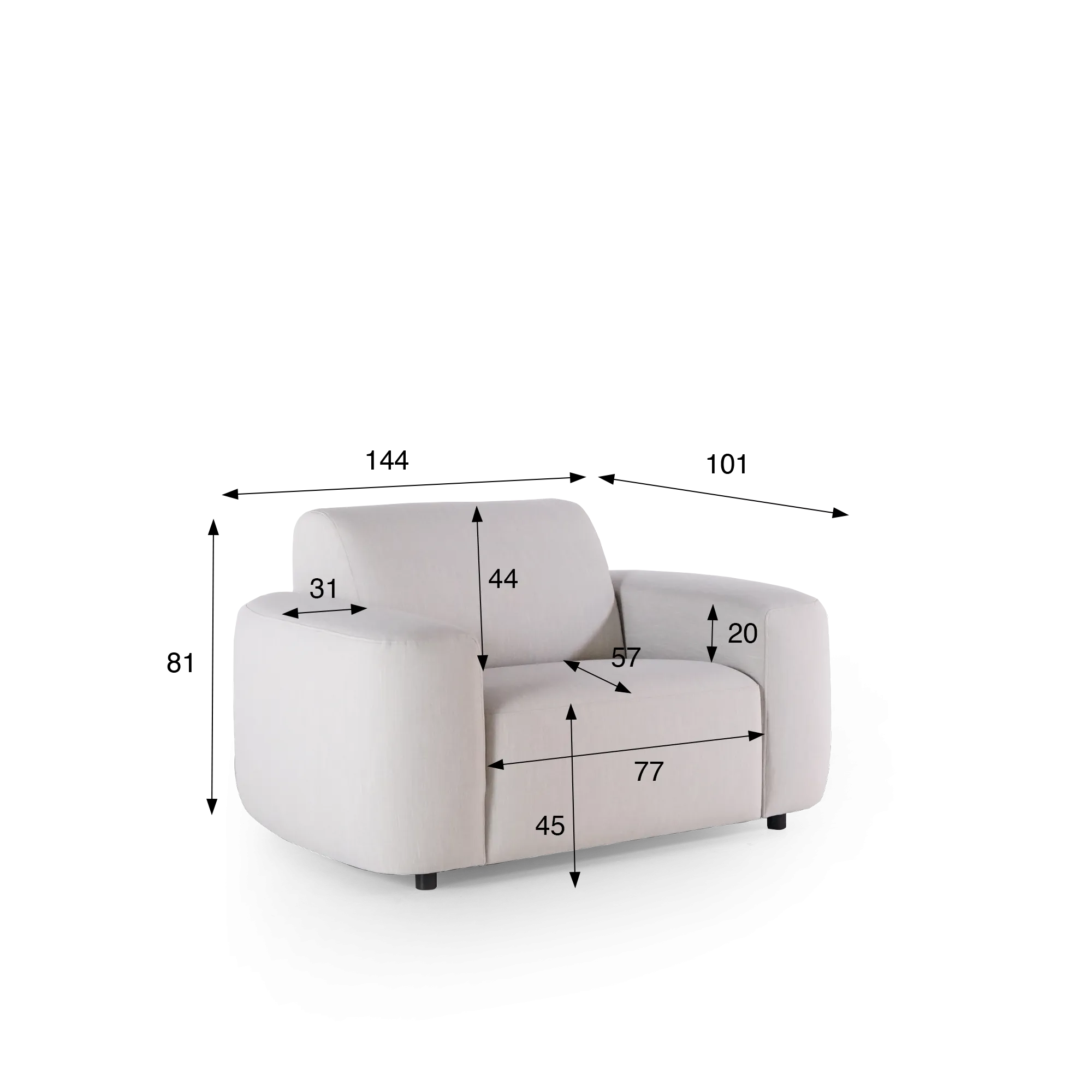La structure interne de ce fauteuil en tissu repose sur un assemblage robuste de bois de pin et de hêtre, renforcé par des panneaux de fibres et des ressorts ondulés de type A. Ce choix d’ossature assure une stabilité exemplaire et une longévité supérieure. L’assise, composée d’une mousse polyuréthane haute résilience (HR 3534) et de ressorts ensachés, garantit un confort durable et un maintien optimal. Le dossier, garni d’une mousse T2520, offre un soutien souple et agréable. Les pieds techniques, discrets et stables, surélèvent le canapé de 3 cm, facilitant l’entretien et contribuant à sa légèreté visuelle.