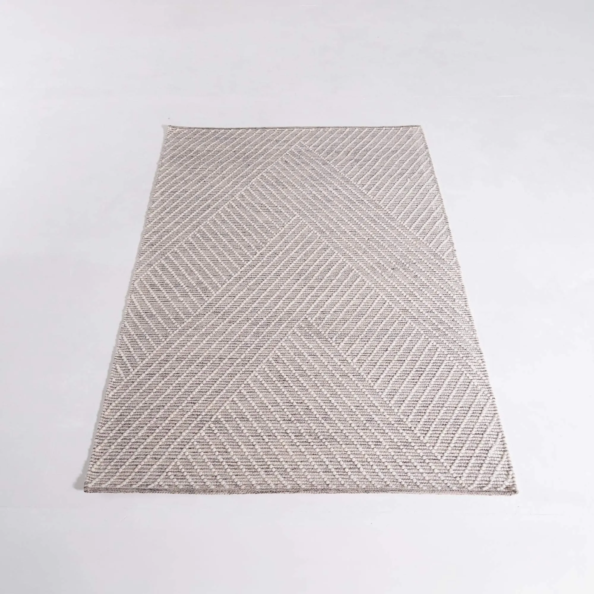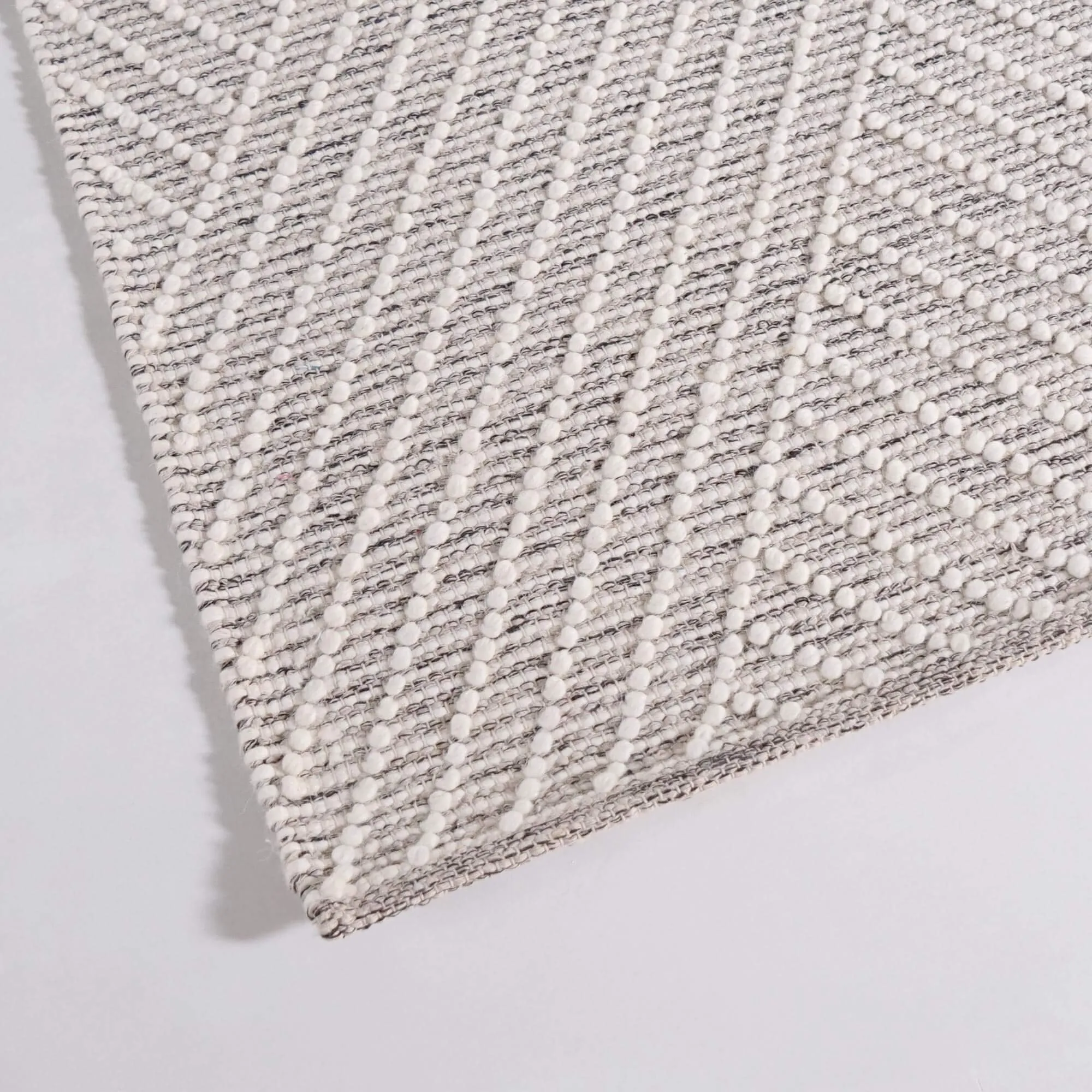 Entièrement confectionné à la main, le tapis en laine Arvo est réalisé en laine 100 % naturelle. Ce choix s’est imposé pour sa douceur immédiate, mais aussi pour sa résistance dans le temps. Sous les pieds, le toucher est souple, légèrement texturé, avec ce relief délicat qui accroche la lumière et fait vibrer les nuances de blanc et de noir. L’épaisseur d’environ 4 mm a été volontairement pensée pour offrir un confort agréable sans créer de surépaisseur, ce qui permet de glisser facilement le tapis sous une table basse ou au pied d’un fauteuil.