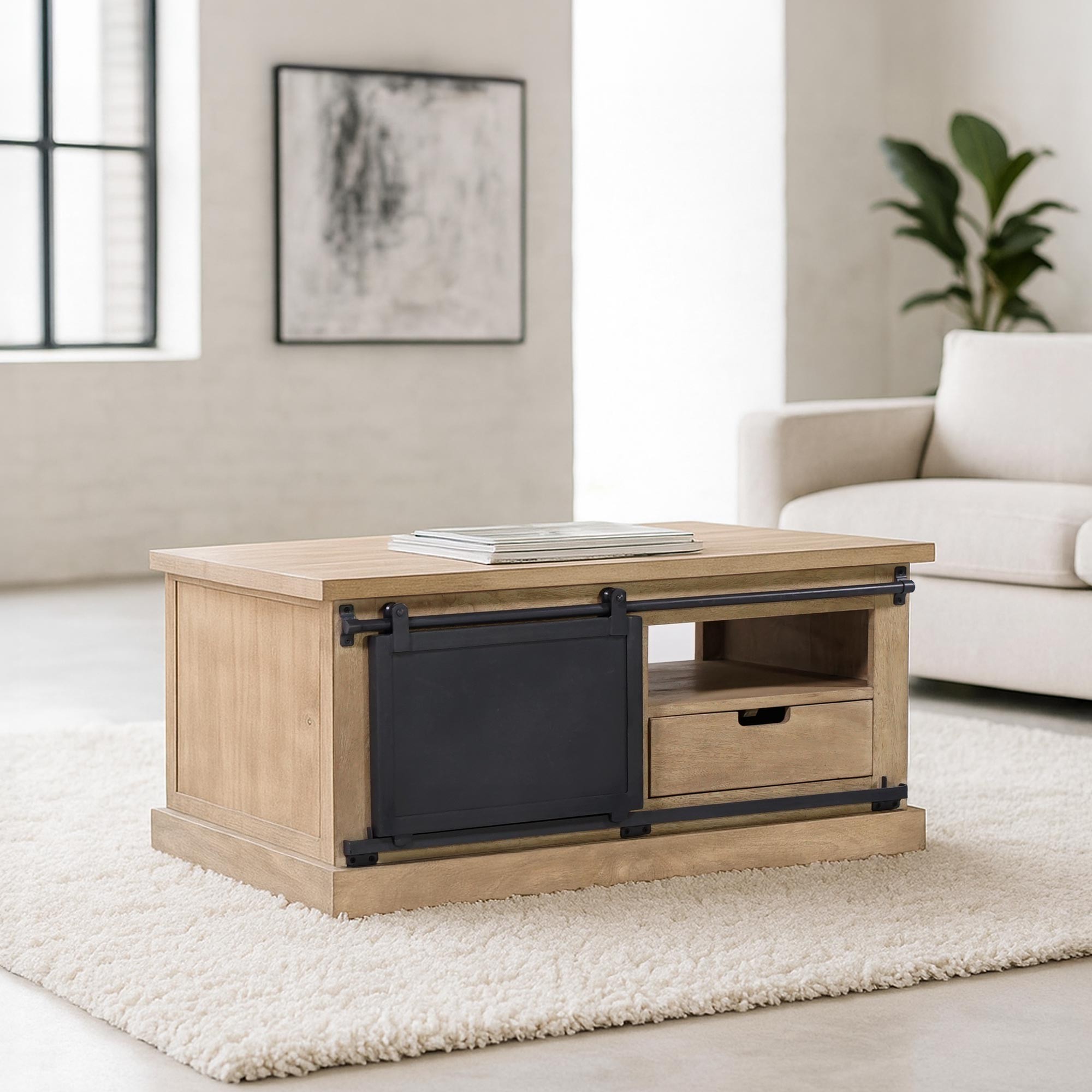Cette table basse offre une solution de rangement astucieuse sans sacrifier la ligne esthétique. Elle intègre un tiroir en bois (L35 x P44,5 x H11,5 cm) parfaitement intégré à la structure, un compartiment ouvert au-dessus (H11 x L55 x P39 cm) pour y glisser livres ou accessoires du quotidien, et un espace de rangement dissimulé derrière la porte coulissante (L39 x H24,5 x P49 cm) pour conserver un salon toujours ordonné. Le plateau supérieur de 100 x 55 cm repose à 45 cm de hauteur, une proportion idéale pour accompagner un canapé de salon.