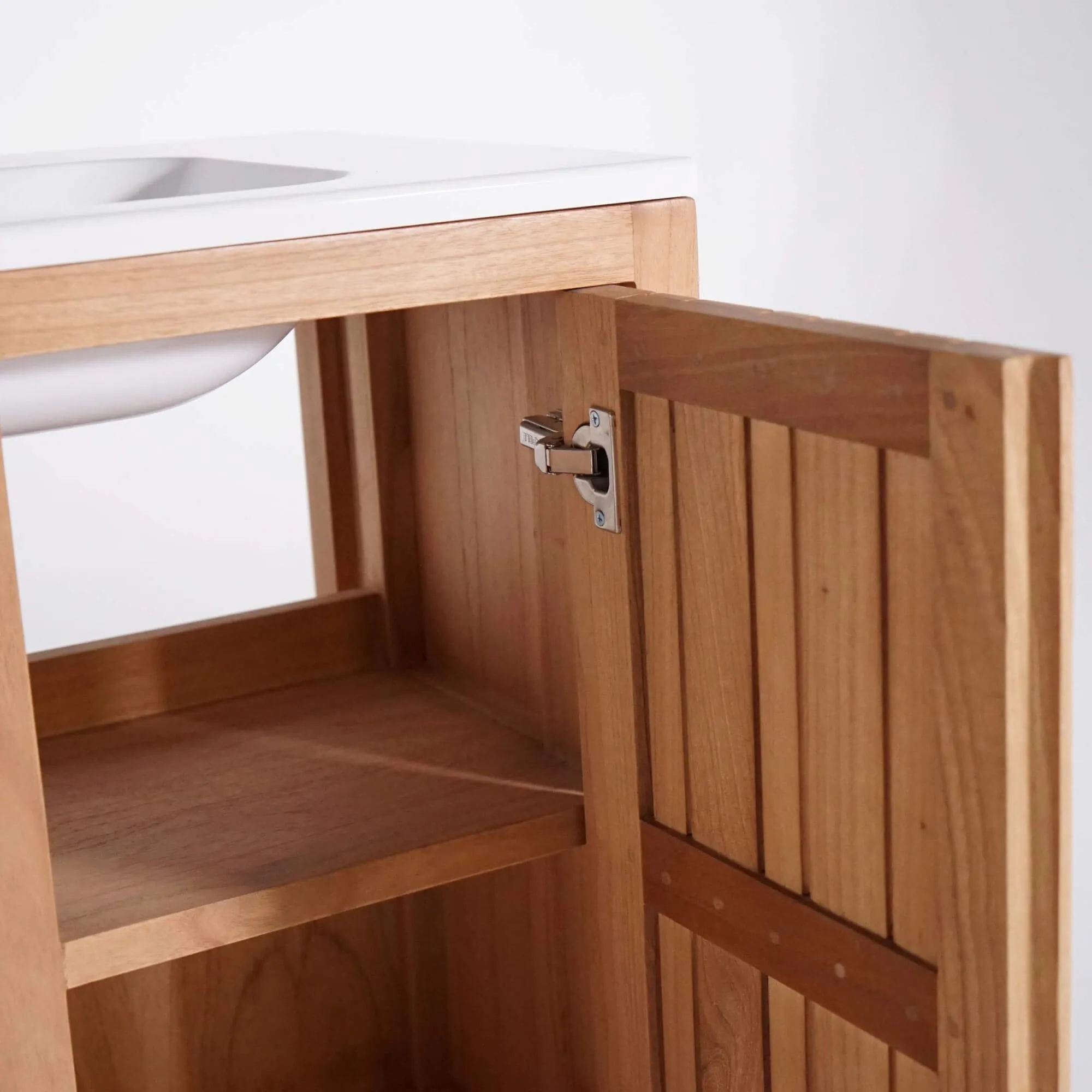 Le plateau de notre meuble de salle de bain avec vasque encastrée Satya accueille une vasque en résine minérale, sélectionnée pour son rendu brillant et soyeux au toucher. Elle s’intègre parfaitement dans l’ensemble et crée un contraste délicat avec le bois massif, renforçant cette impression d’harmonie qui nous tenait tant à cœur lors de la conception. Avec une largeur totale de 80 cm et une hauteur de 91 cm, le meuble trouve facilement sa place dans une salle de bain lumineuse, qu’elle soit d’inspiration naturelle, contemporaine ou minimaliste.