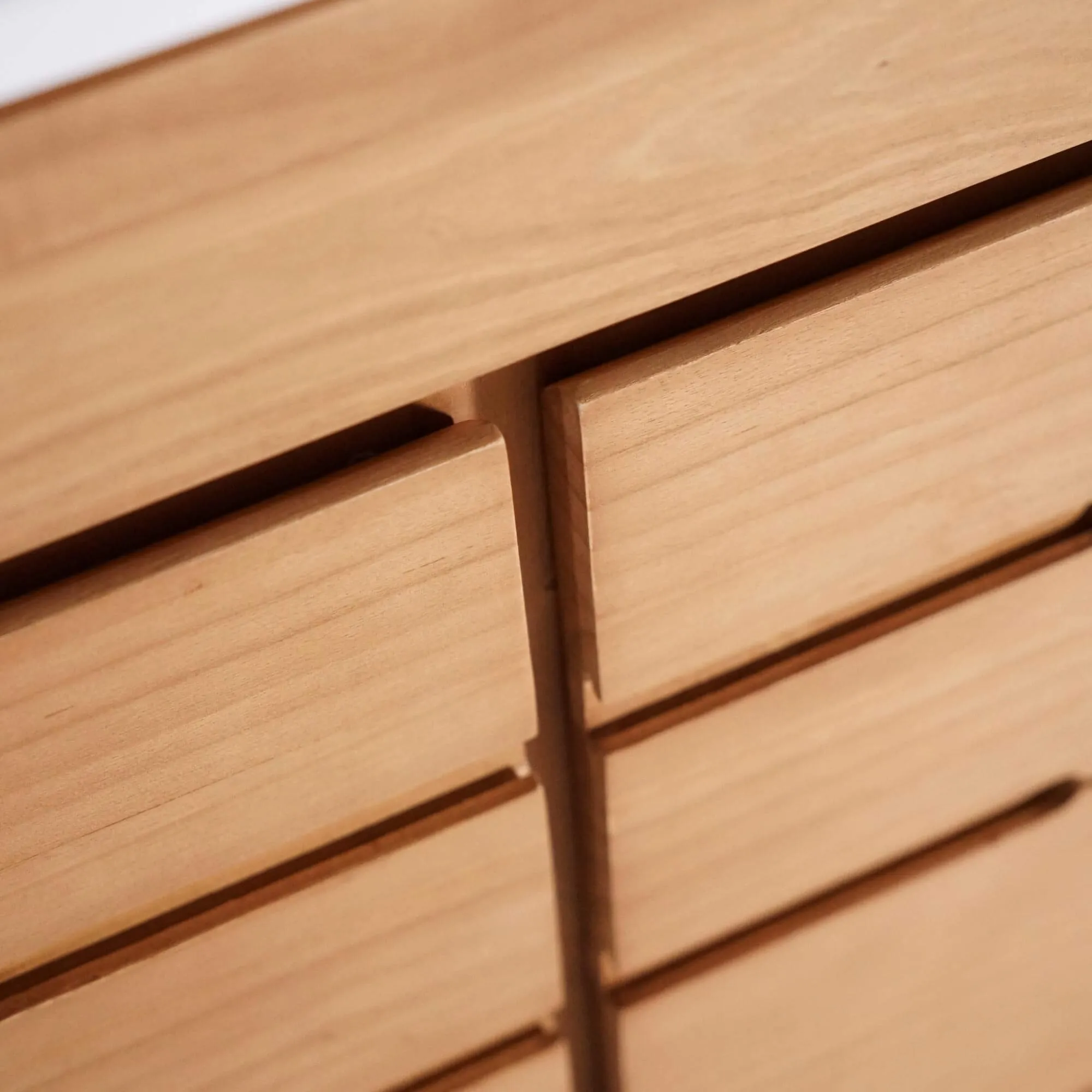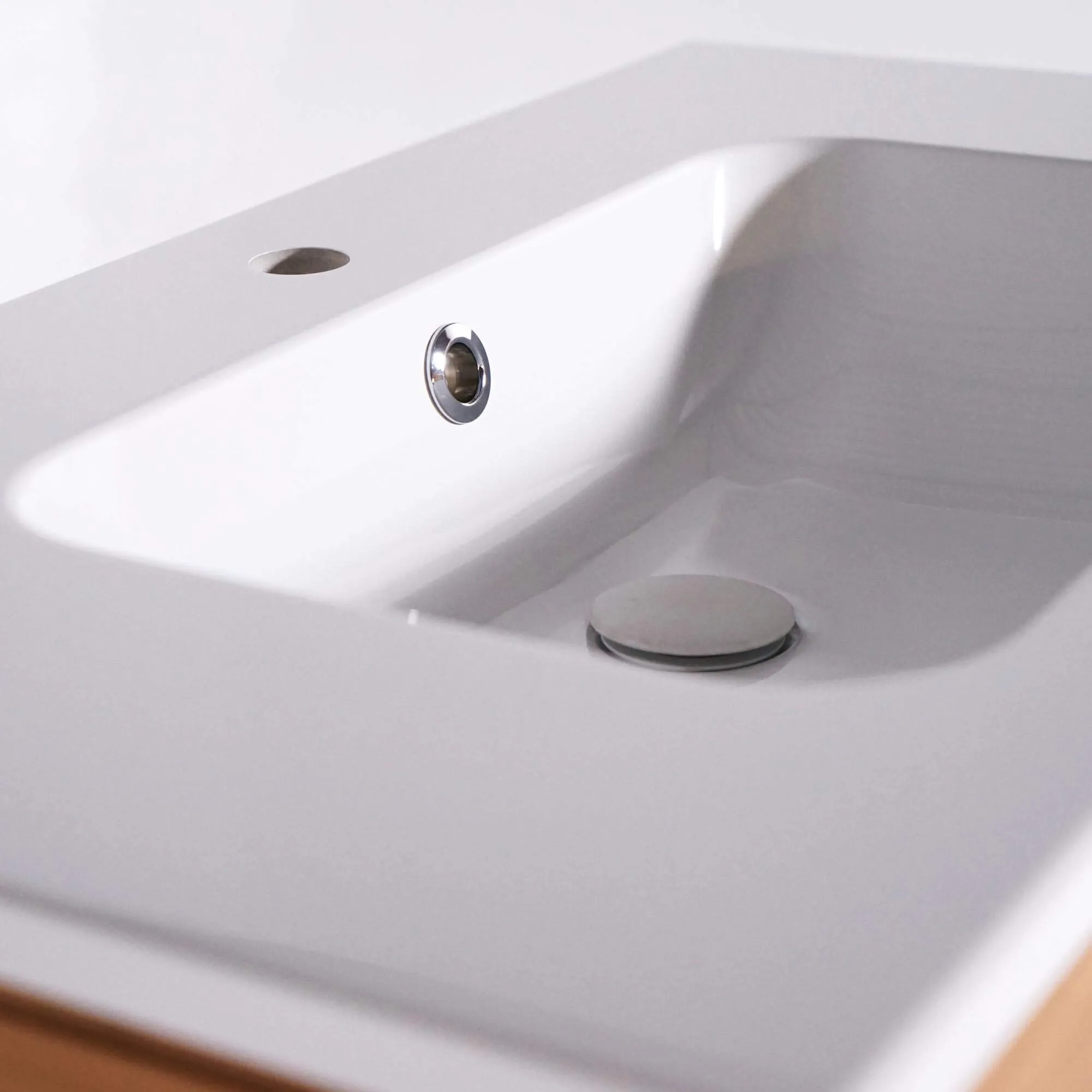 Entièrement façonné en bois massif de mindi, le meuble de salle de bain avec vasque encastrée Ashwini met en valeur une essence que nous affectionnons pour sa stabilité, son grain délicat et la lumière qu’elle diffuse dans la pièce. Le toucher satiné du bois contraste subtilement avec la vasque encastrée en résine minérale, dont la surface lisse et immaculée accroche la lumière sans jamais s’imposer. Cette association crée un équilibre visuel qui nous tenait à cœur : une base chaleureuse, un plateau clair et sobre, une silhouette nette qui respire la sérénité.