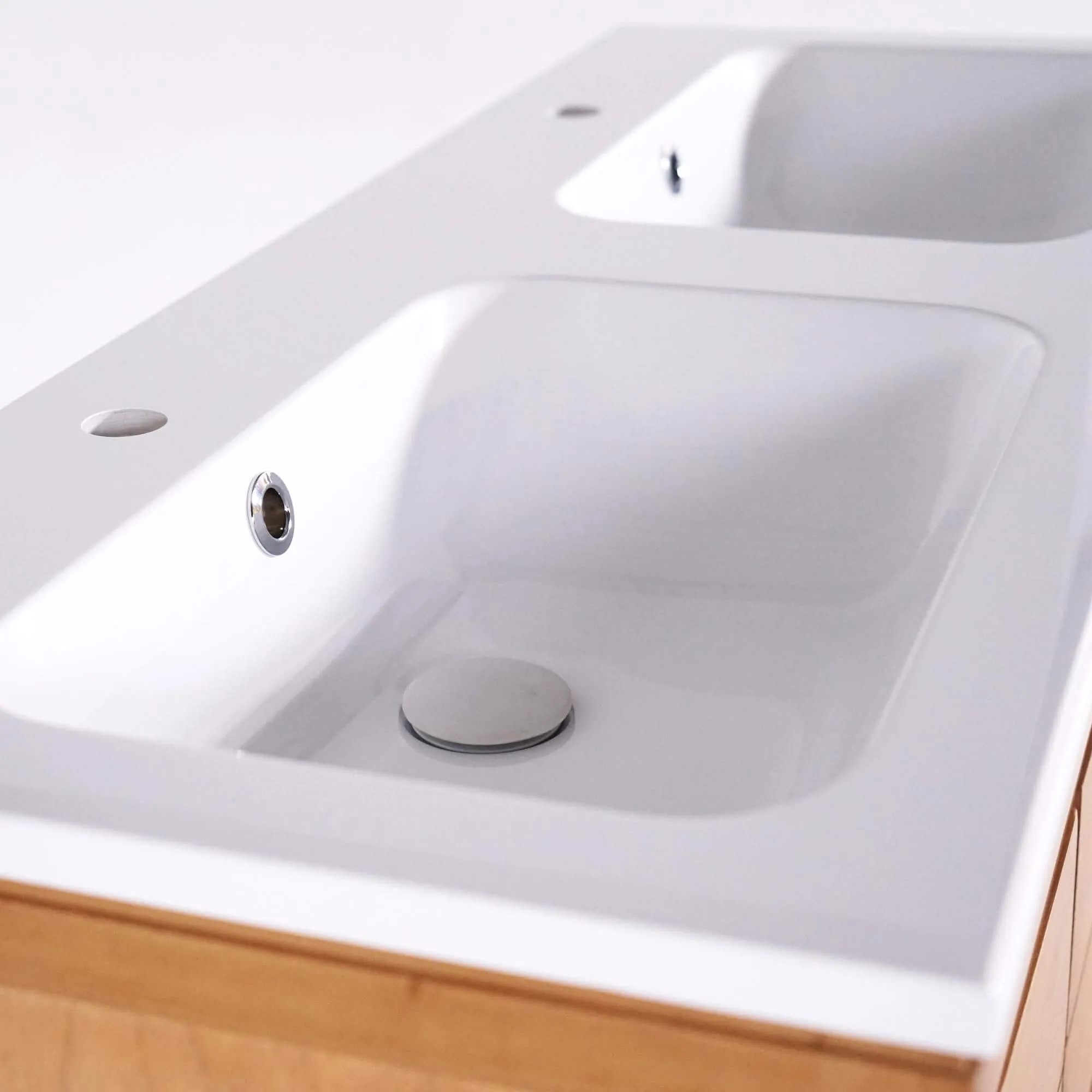 La double vasque encastrée, d’un blanc brillant, apporte un confort appréciable dans une salle de bain partagée. Ses contours arrondis, son rebord fin et son toucher velouté s’accordent parfaitement au ton chaleureux du mindi. Le plateau de ce meuble de salle de bain avec vasque encastrée se fixe simplement, et le meuble arrive déjà monté : une installation fluide, fidèle à notre volonté de créer un design accessible et bien pensé.