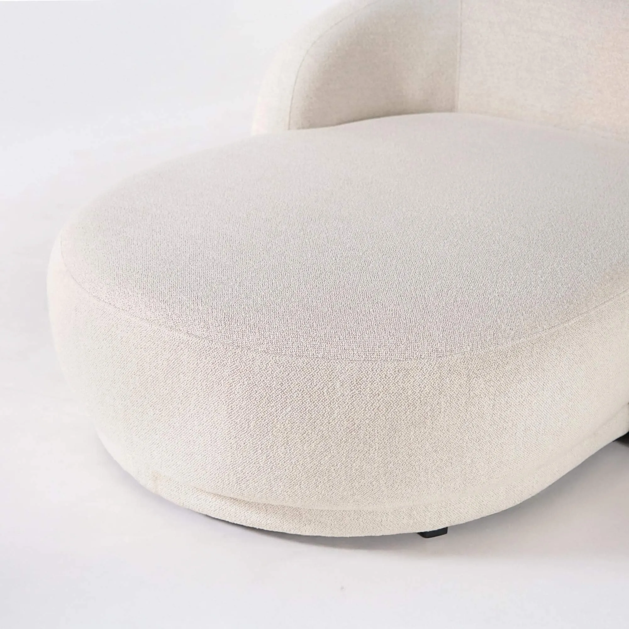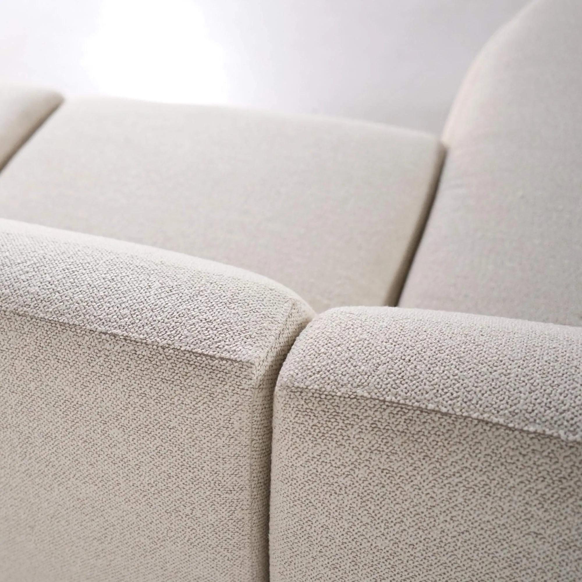 Son tissu clair, subtilement texturé, apporte une douceur visuelle qui rehausse la luminosité d’un intérieur tout en soulignant l’élégance de ses formes arrondies. Les accoudoirs de ce canapé d'angle 4 places avec méridienne gauche, dessinés comme une continuité naturelle du dossier, viennent envelopper l’espace d’assise pour offrir un confort rassurant. En observant les détails, on retrouve cette recherche d’harmonie dans la jonction des coutures, pensées pour se faire discrètes et souligner la pureté des courbes.