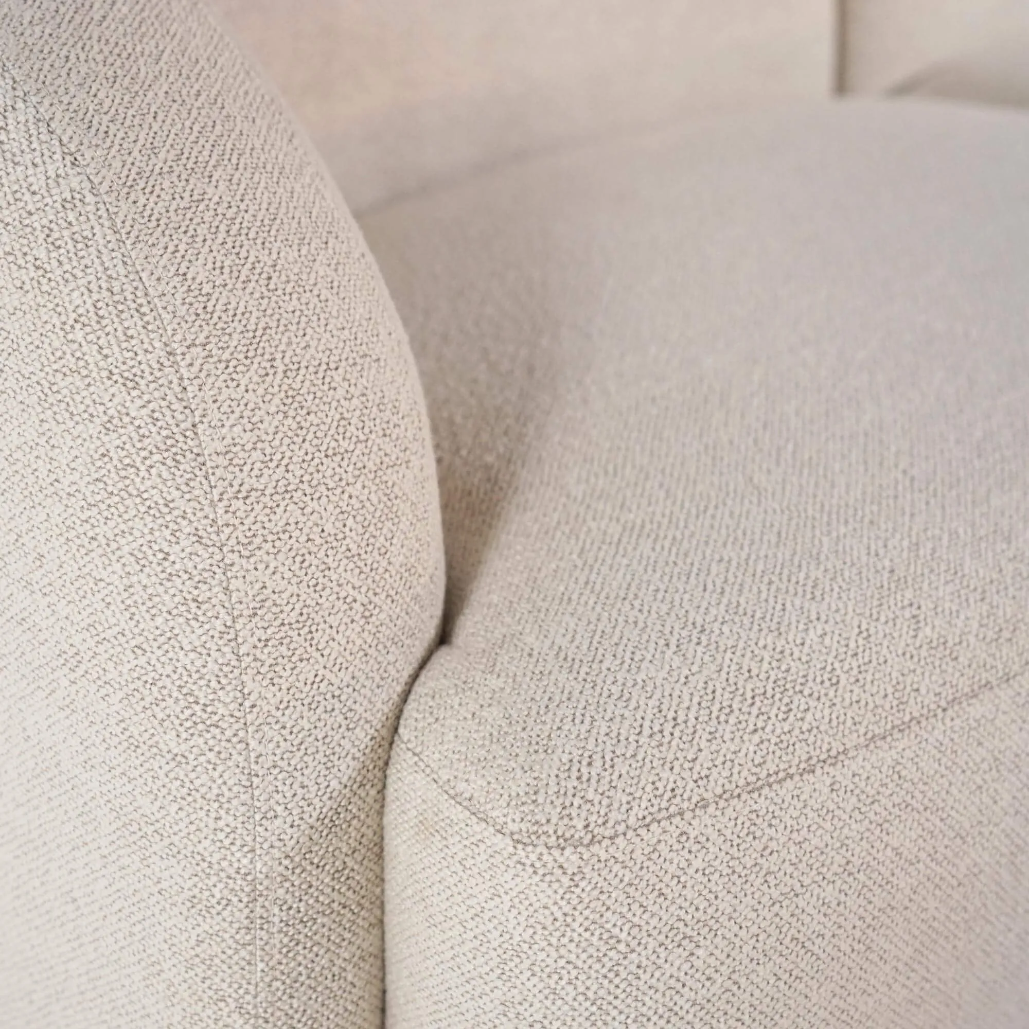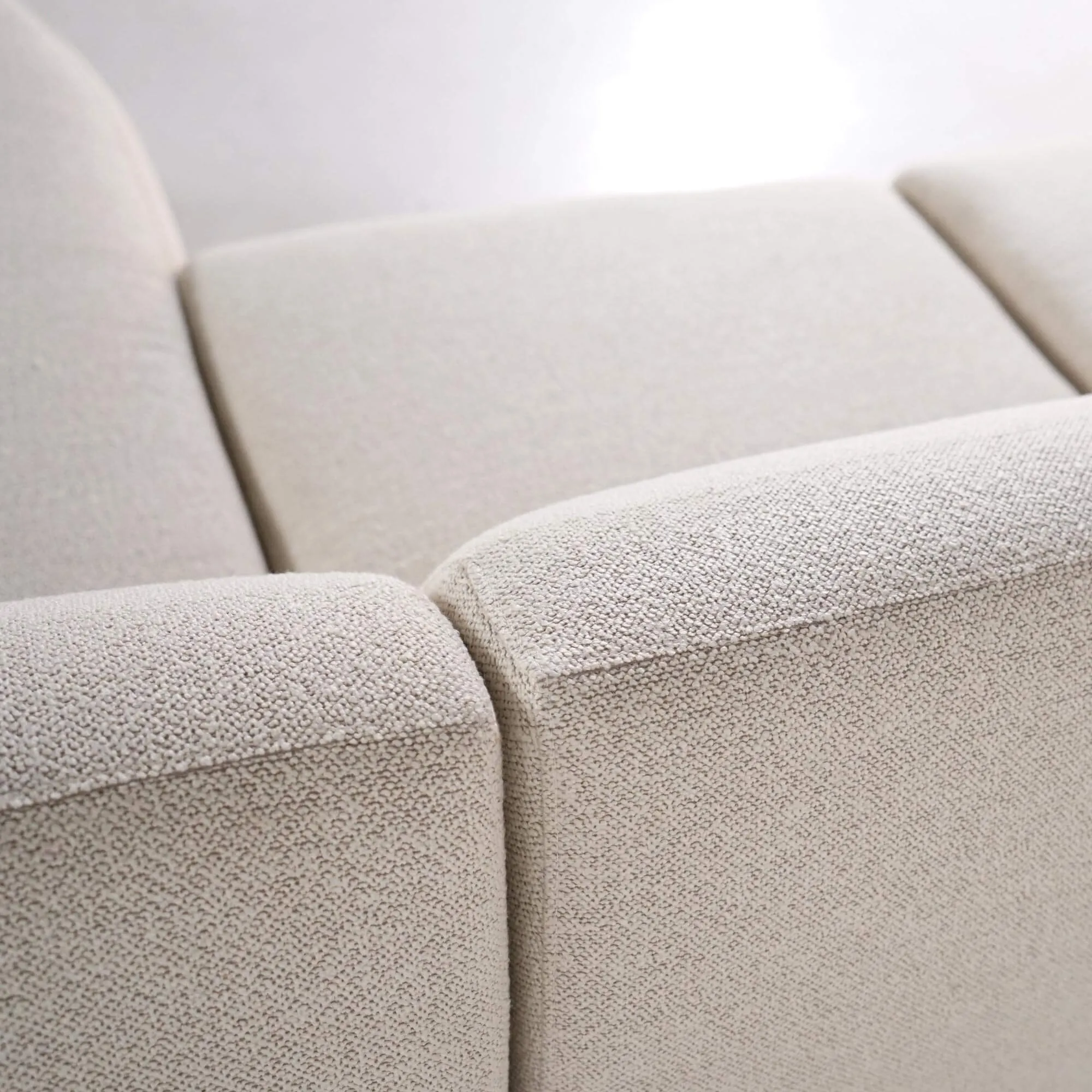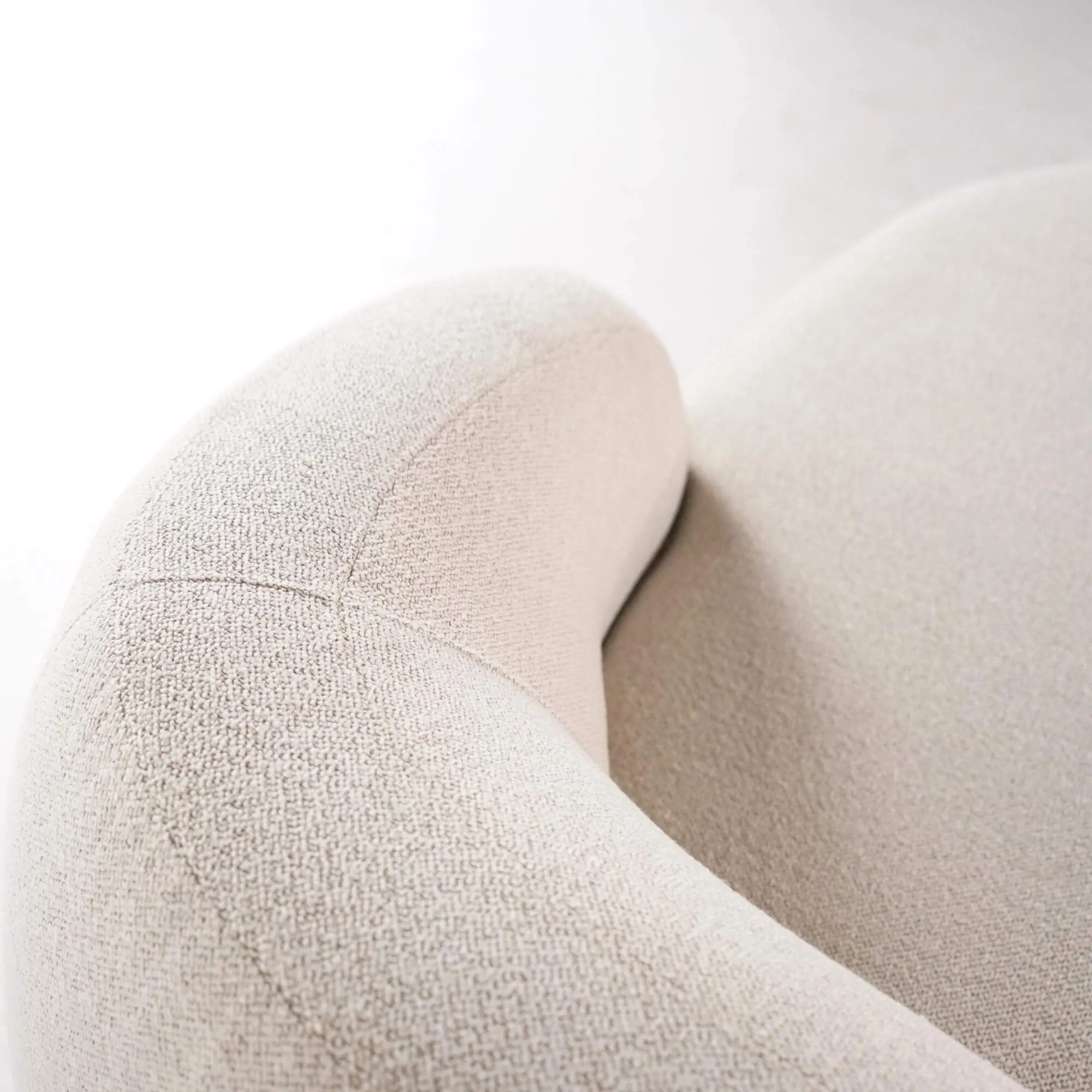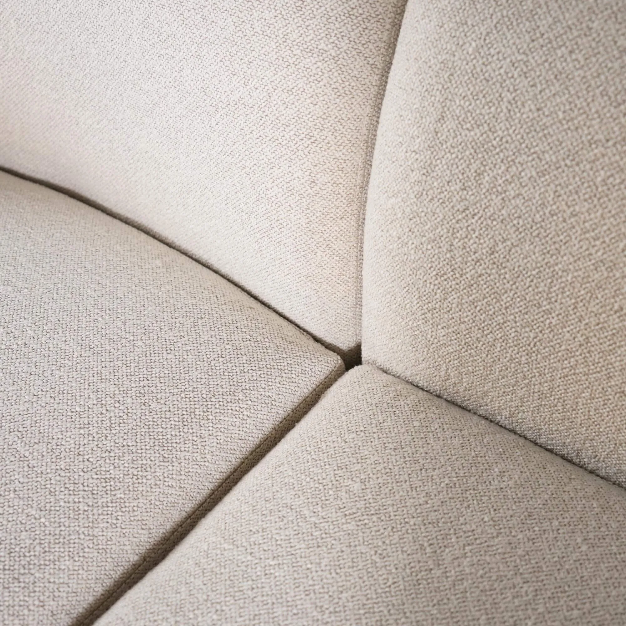 Nous avons choisi pour ce modèle de un tissu bouclé certifié Oeko-Tex®, apprécié pour son toucher texturé et son élégance discrète. Résistant à plus de 45 000 cycles Martindale, il garantit une tenue remarquable au quotidien. Sous son revêtement, le confort se révèle grâce à une structure intérieure combinant ressorts ensachés, mousse HR et couches de mousse PU, qui assurent à la fois souplesse et maintien. L’ensemble repose sur des pieds discrets en plastique noir, permettant de conserver la fluidité des lignes sans rompre l’harmonie visuelle.