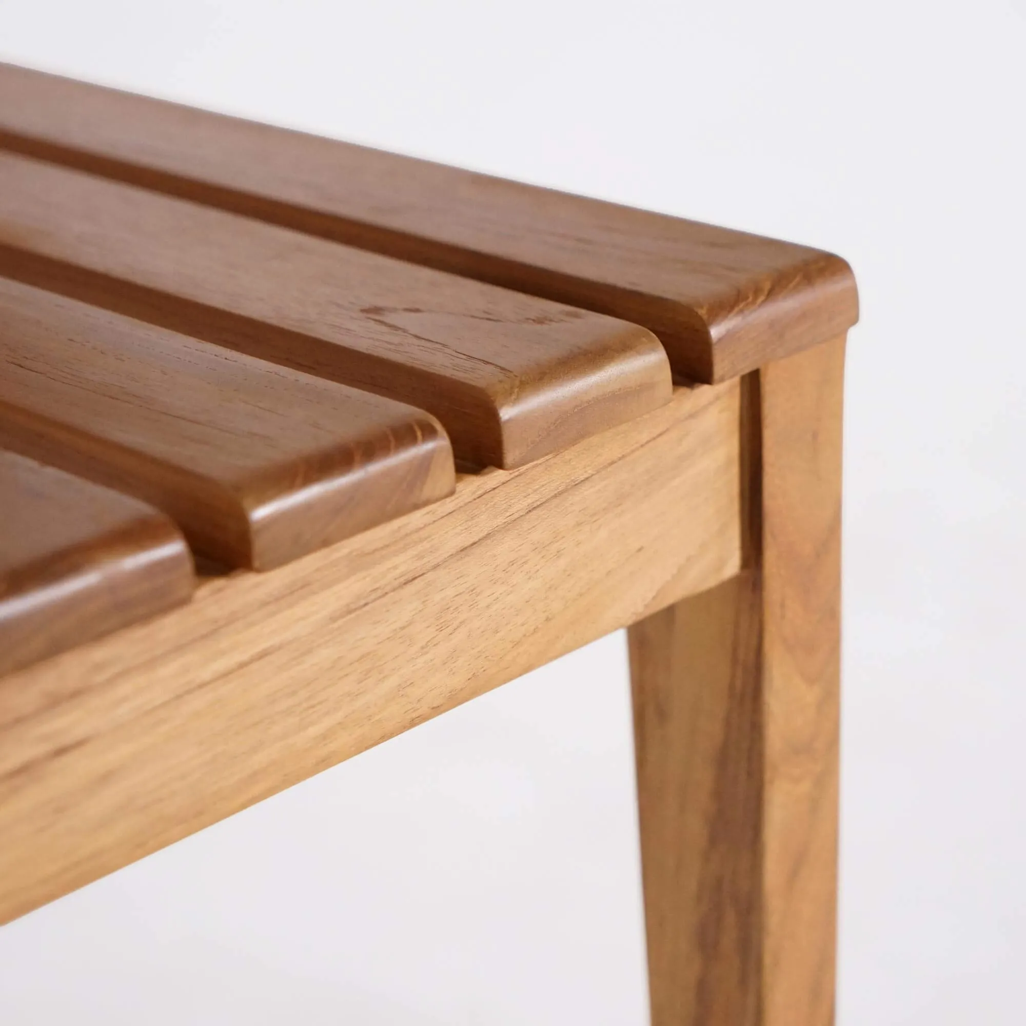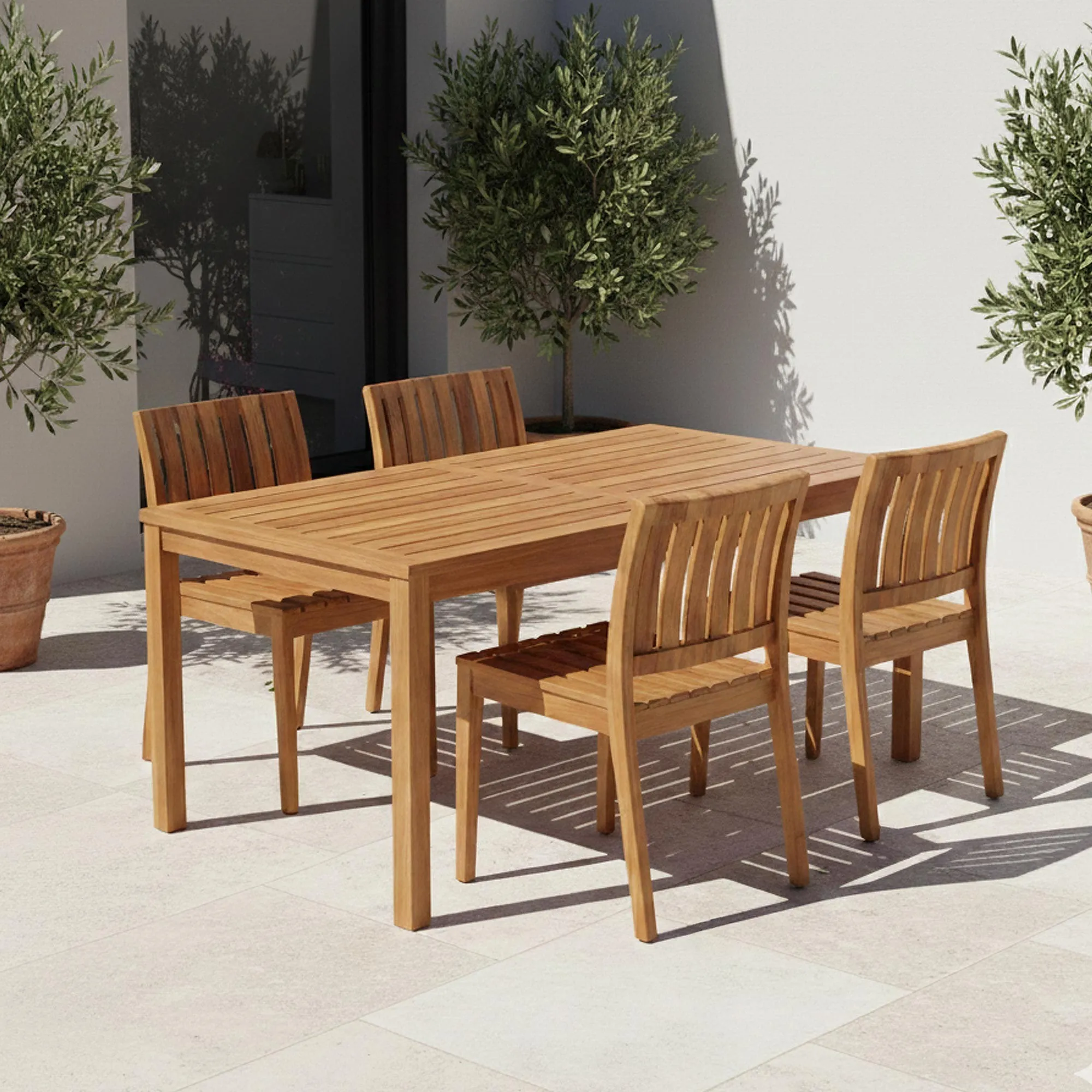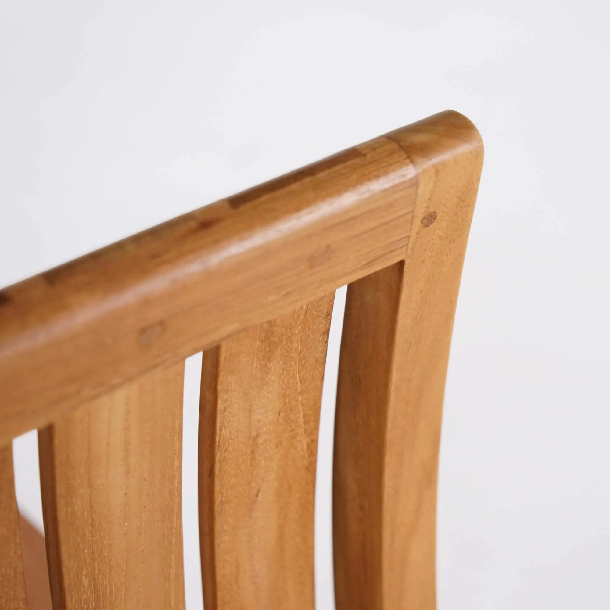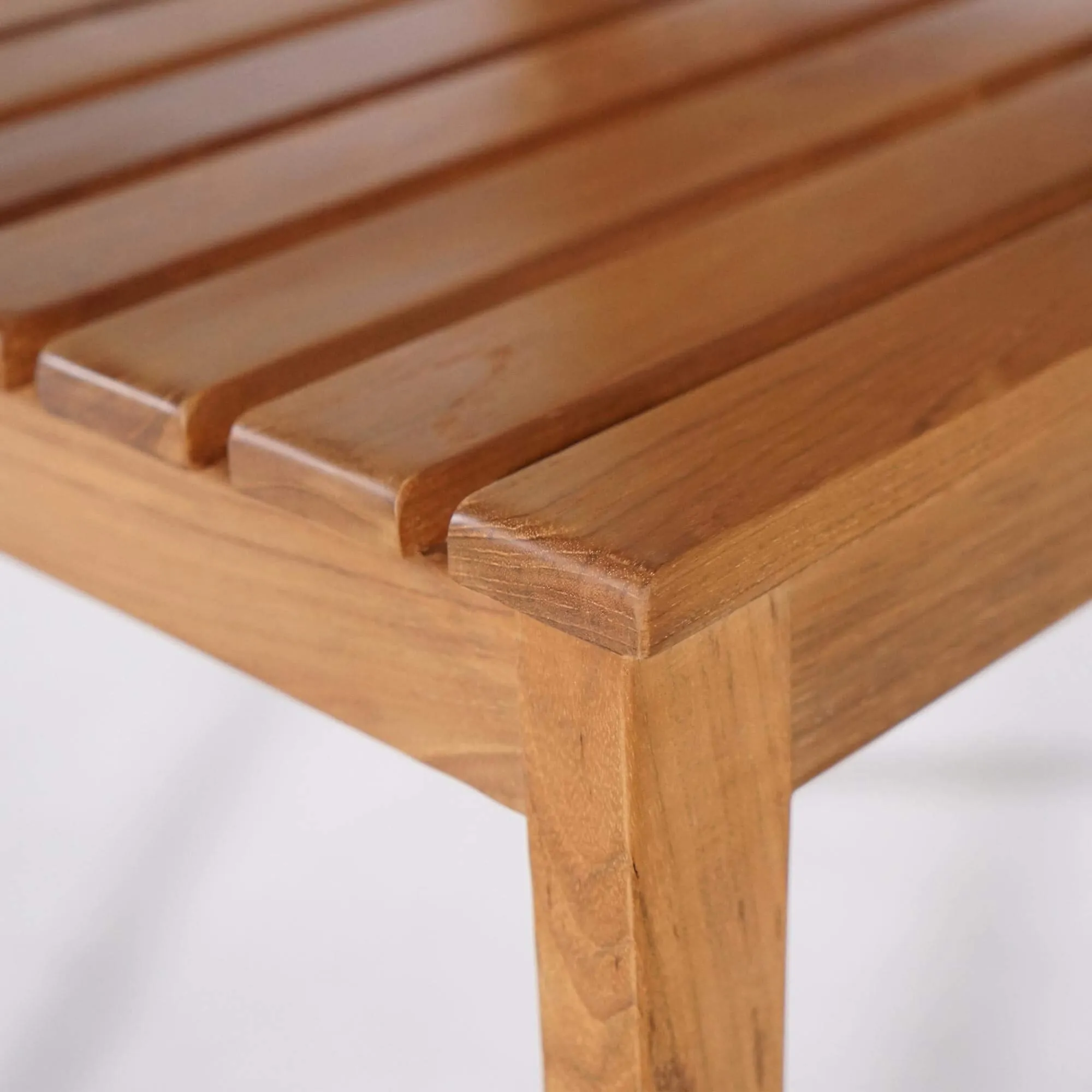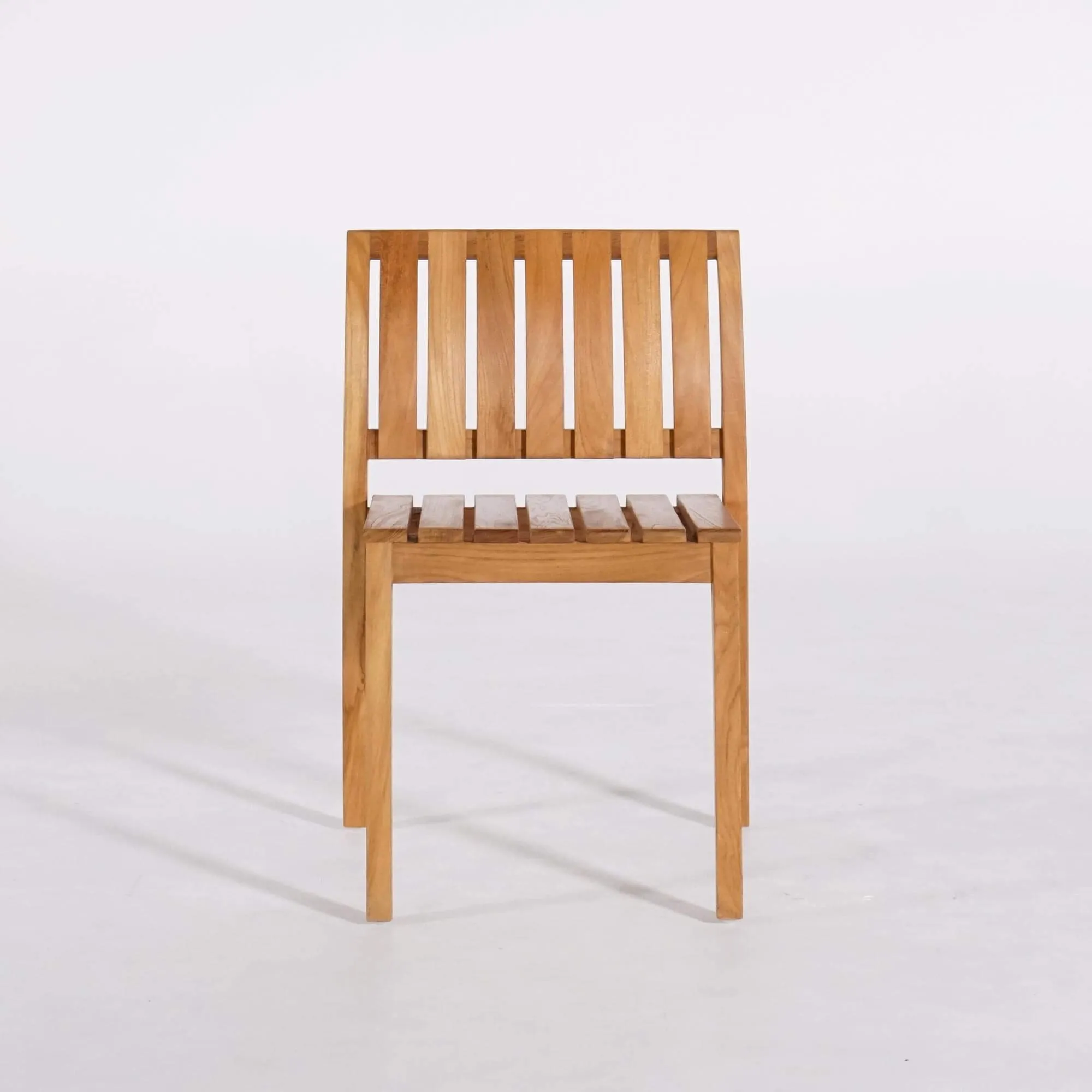L’assise de cette chaise de jardin en bois, composée de lattes de teck légèrement espacées, favorise la circulation de l’air et assure un confort agréable lors des repas ou des moments de détente en extérieur autour d'une table à manger. Avec une largeur d’assise d’environ 41 cm, la chaise offre un espace confortable tout en conservant une silhouette légère et facile à déplacer. Le dossier de cette chaise de jardin en bois de teck, formé de lattes verticales délicatement cintrées, accompagne naturellement la courbe du dos et renforce la sensation de maintien. Cette ergonomie discrète est le résultat d’un travail minutieux sur les proportions et les angles de la structure.