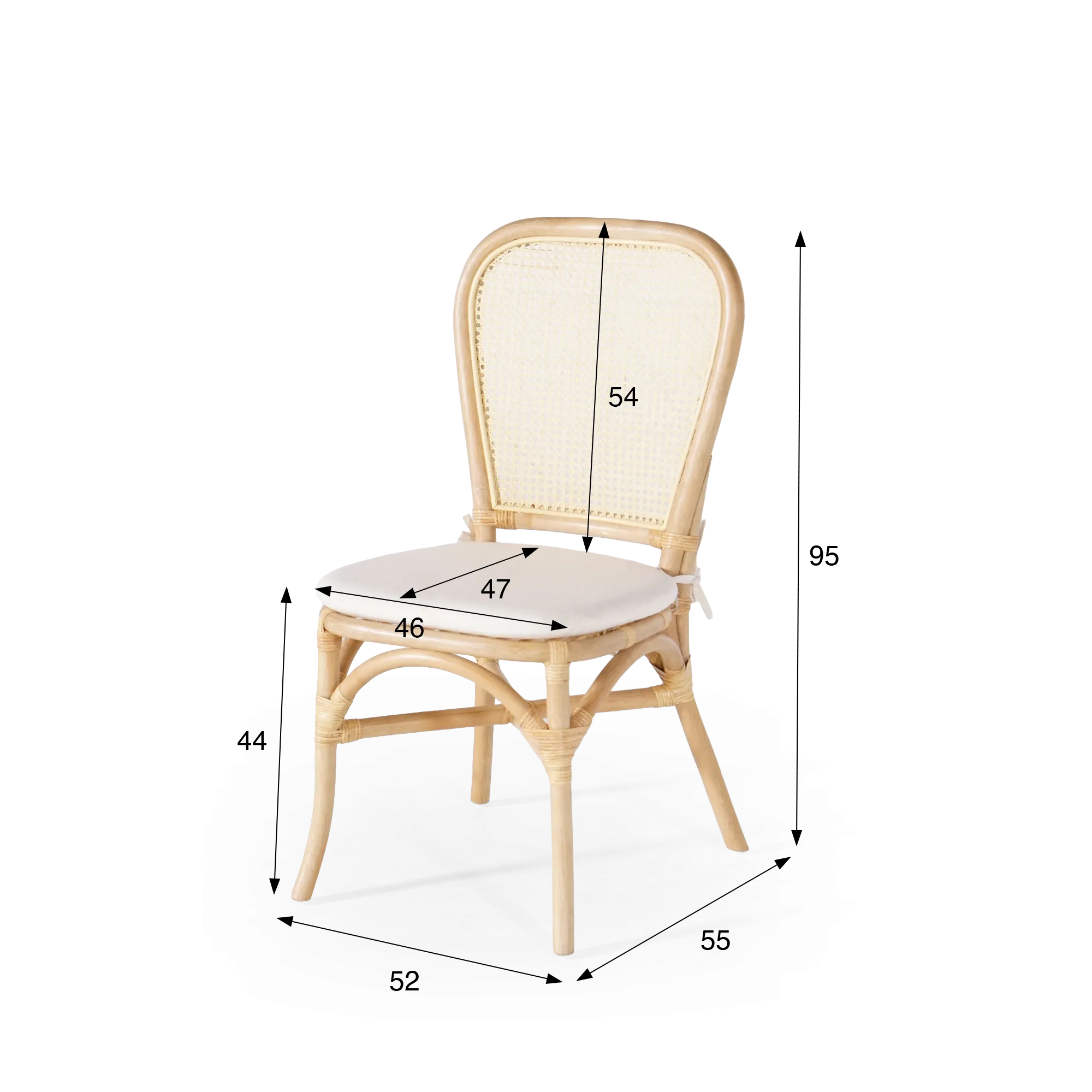 Le dossier de la chaise en rotin naturel et coussin beige Louna, haut d’environ 54 cm, accompagne naturellement le dos et offre un soutien agréable lors des repas ou des moments de convivialité. L’assise, positionnée à environ 44 cm du sol, propose une largeur d’environ 46 cm et une profondeur d’environ 47 cm, des proportions que nous avons soigneusement étudiées afin de trouver l’équilibre entre confort et légèreté visuelle. Le coussin beige, discret et moelleux, apporte une touche de douceur supplémentaire et souligne la teinte claire du rotin.