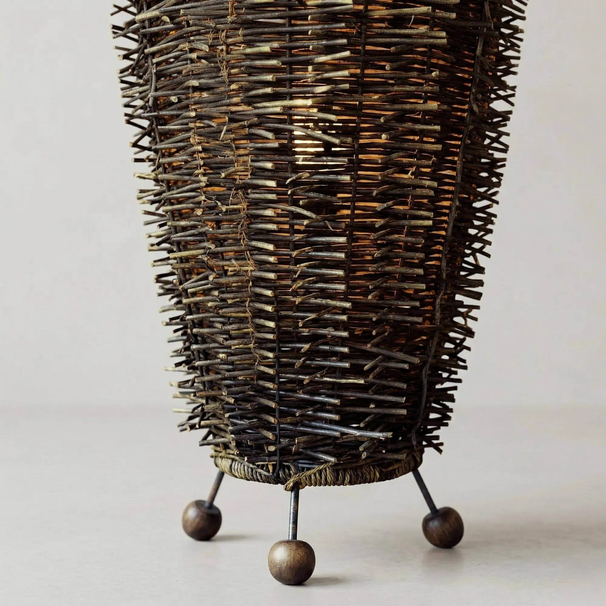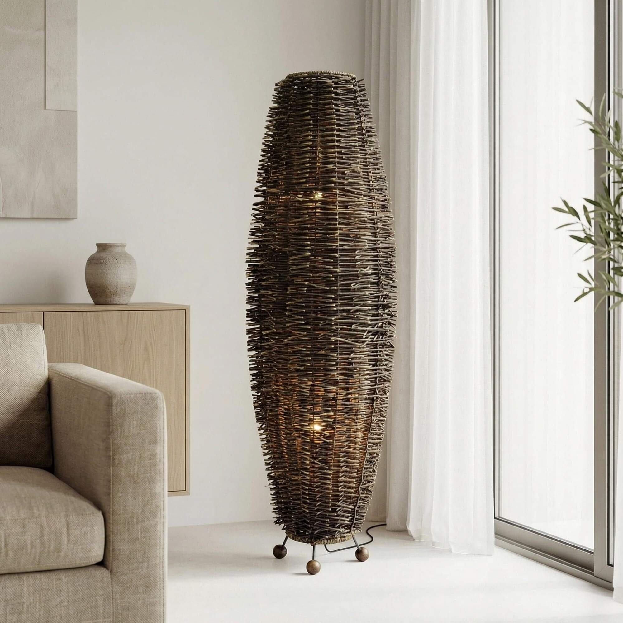 Pour concevoir la lampe sur pied en rotin Aiko, nous avons souhaité traduire la beauté des matières naturelles à travers un objet lumineux à la présence douce mais affirmée. Son tressage en osier révèle un travail patient et précis, où chaque fibre est positionnée de manière à créer une texture riche, irrégulière et vivante. Cette composition artisanale laisse subtilement filtrer la lumière, diffusant un éclairage chaleureux qui enveloppe l’espace d’une atmosphère apaisante.