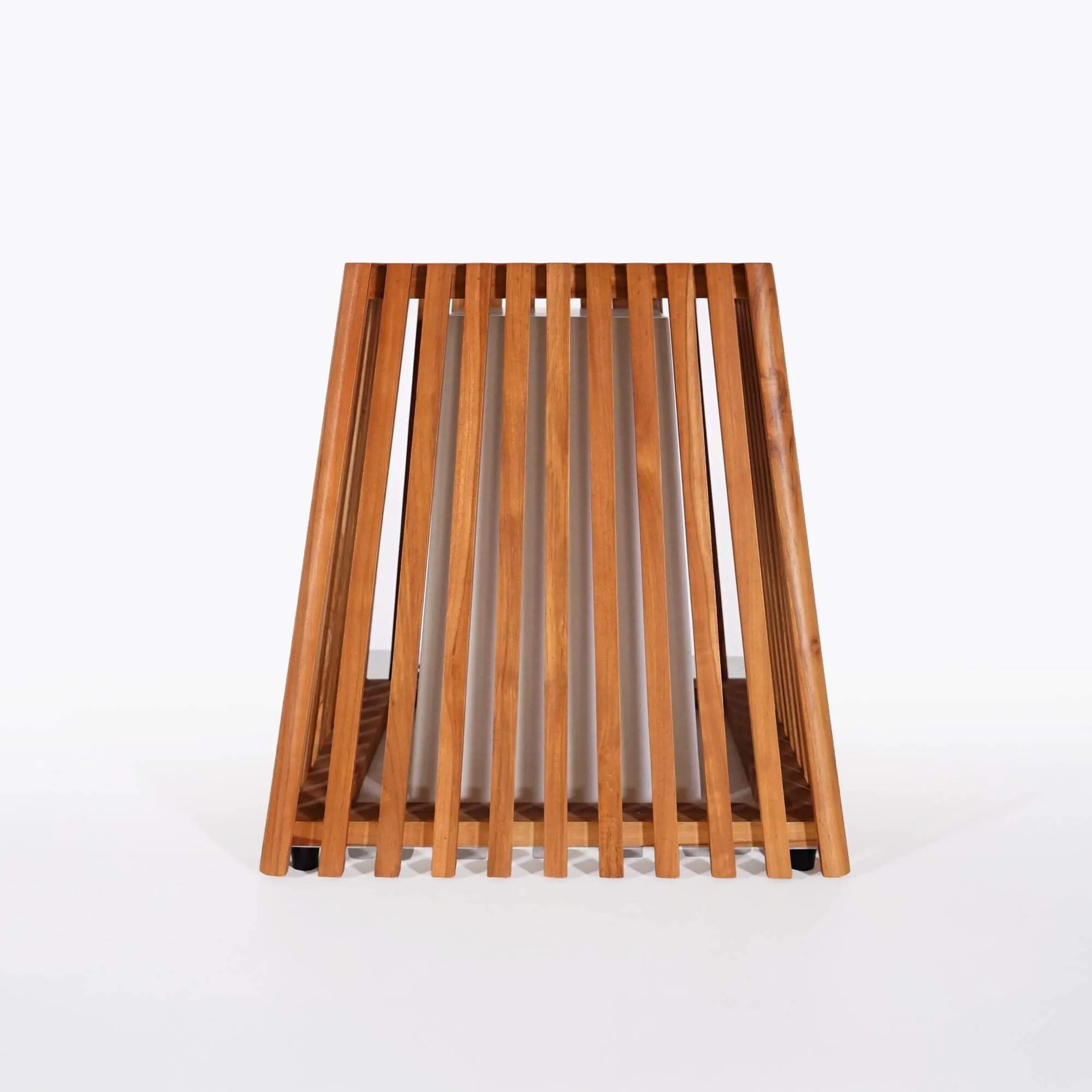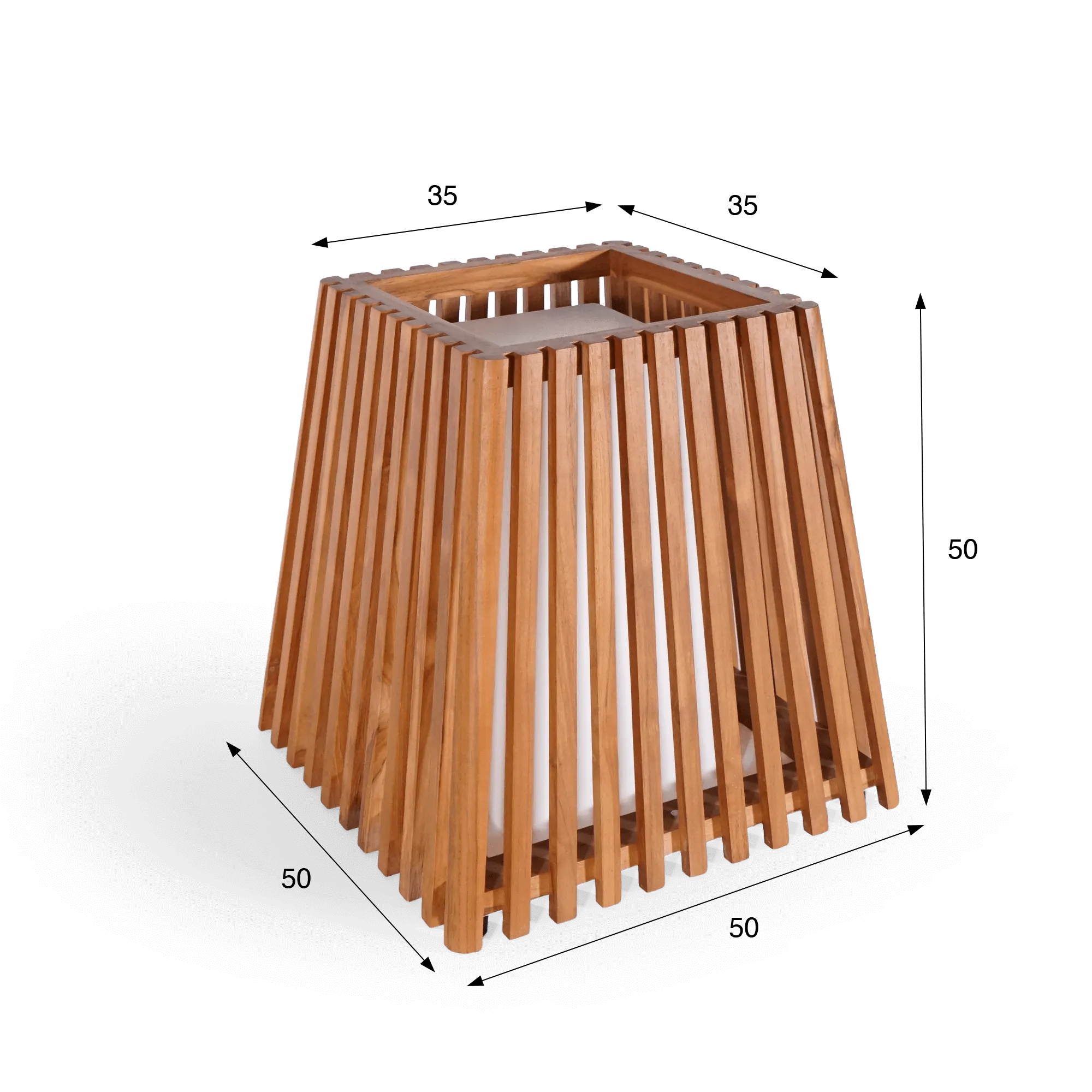 Lorsque nous avons imaginé la lampe d’extérieur en bois de teck Nori, nous voulions créer un luminaire capable d’apporter une présence douce et graphique aux espaces extérieurs, tout en mettant en valeur la beauté naturelle du bois massif. Nous avons travaillé autour d’une forme basse et équilibrée d’environ 50 cm de hauteur, pensée pour se poser naturellement sur une terrasse, près d’un salon de jardin ou le long d’une allée. Sa silhouette légèrement évasée crée une assise visuelle stable tout en apportant un caractère chaleureux à l’ensemble.