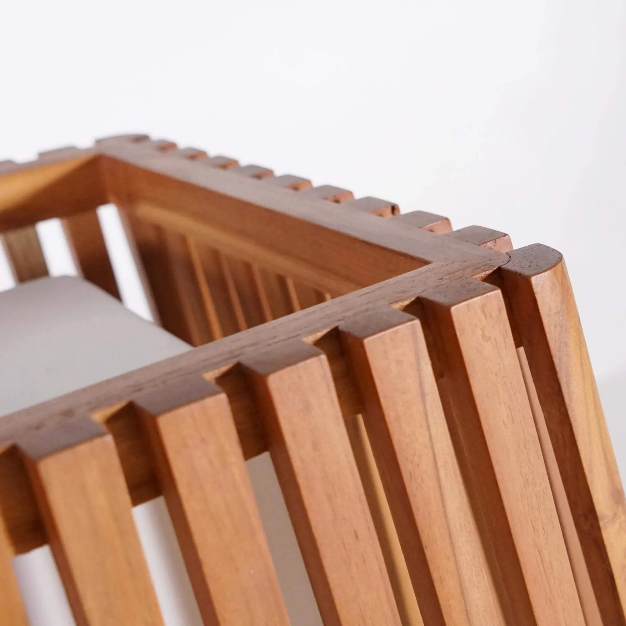 La structure de cette lampe d’extérieur en bois est réalisée en teck massif, une essence que nous sélectionnons pour sa résistance exceptionnelle aux conditions extérieures. Ce bois dense et naturellement riche en huiles protège la lampe de l’humidité et des variations climatiques, tout en conservant au fil du temps sa patine chaleureuse. Les lattes verticales qui composent la structure ont été soigneusement assemblées afin de créer un rythme visuel régulier. Cette construction met en lumière les nuances naturelles du teck, dont les veinages subtils et les variations de teinte révèlent toute l’authenticité du matériau.