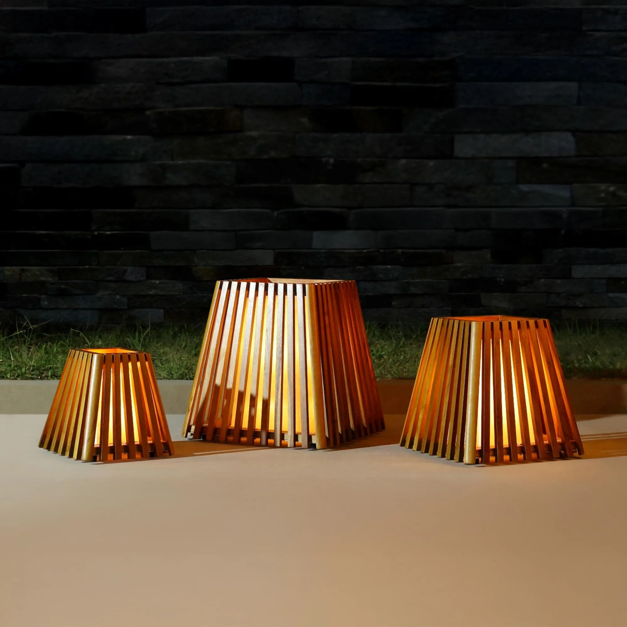 Avec ses proportions compactes d’environ 30 cm de hauteur, cette lampe sur pied en bois de teck trouve facilement sa place près d'une table basse, sur une terrasse ou le long d’une allée. Sa base carrée d’environ 30 x 30 cm lui apporte une présence discrète mais affirmée, tandis que l’ouverture supérieure plus resserrée structure visuellement l’ensemble. Ce jeu de proportions nous a permis de concevoir un luminaire qui diffuse la lumière avec douceur tout en apportant un véritable élément décoratif à l’espace.