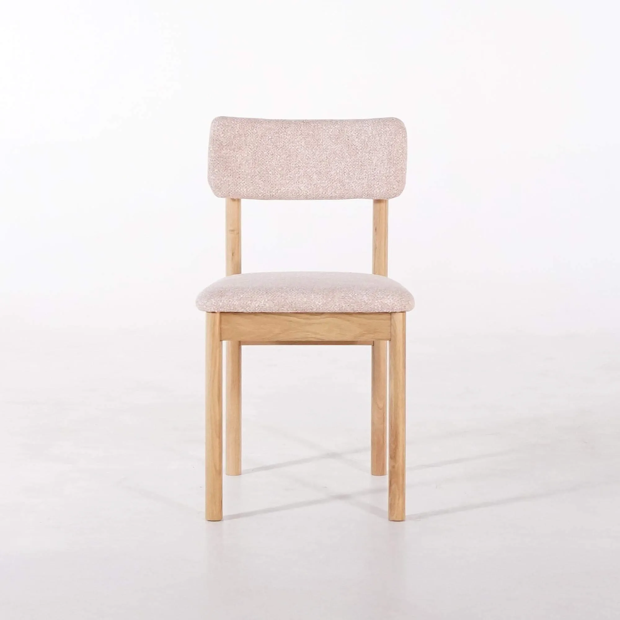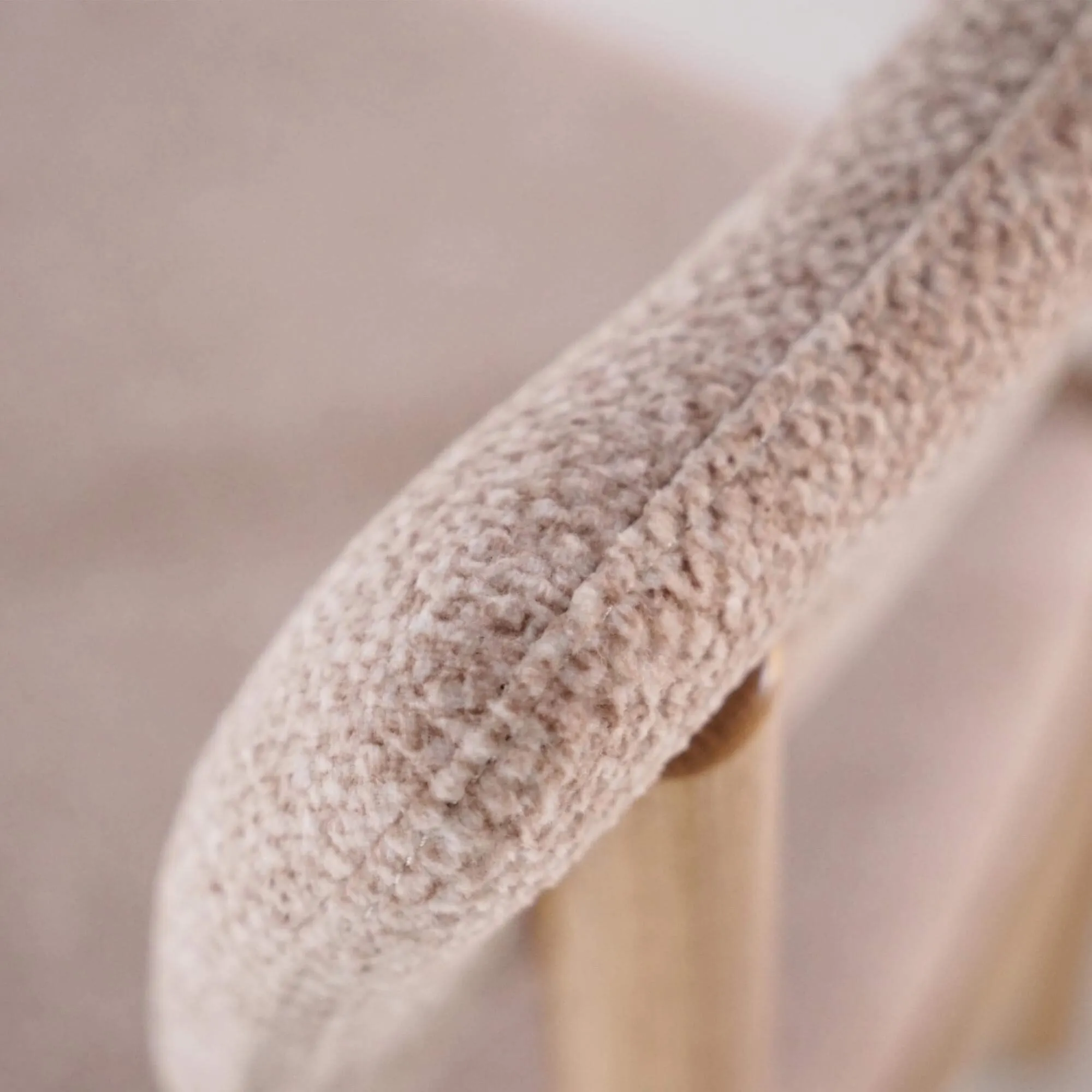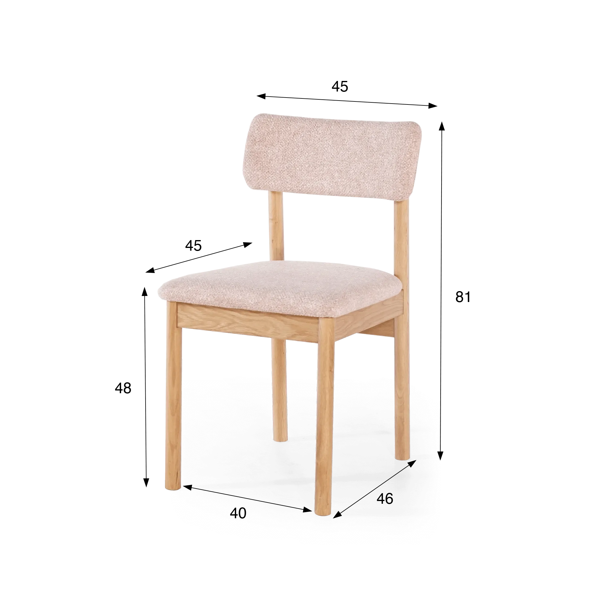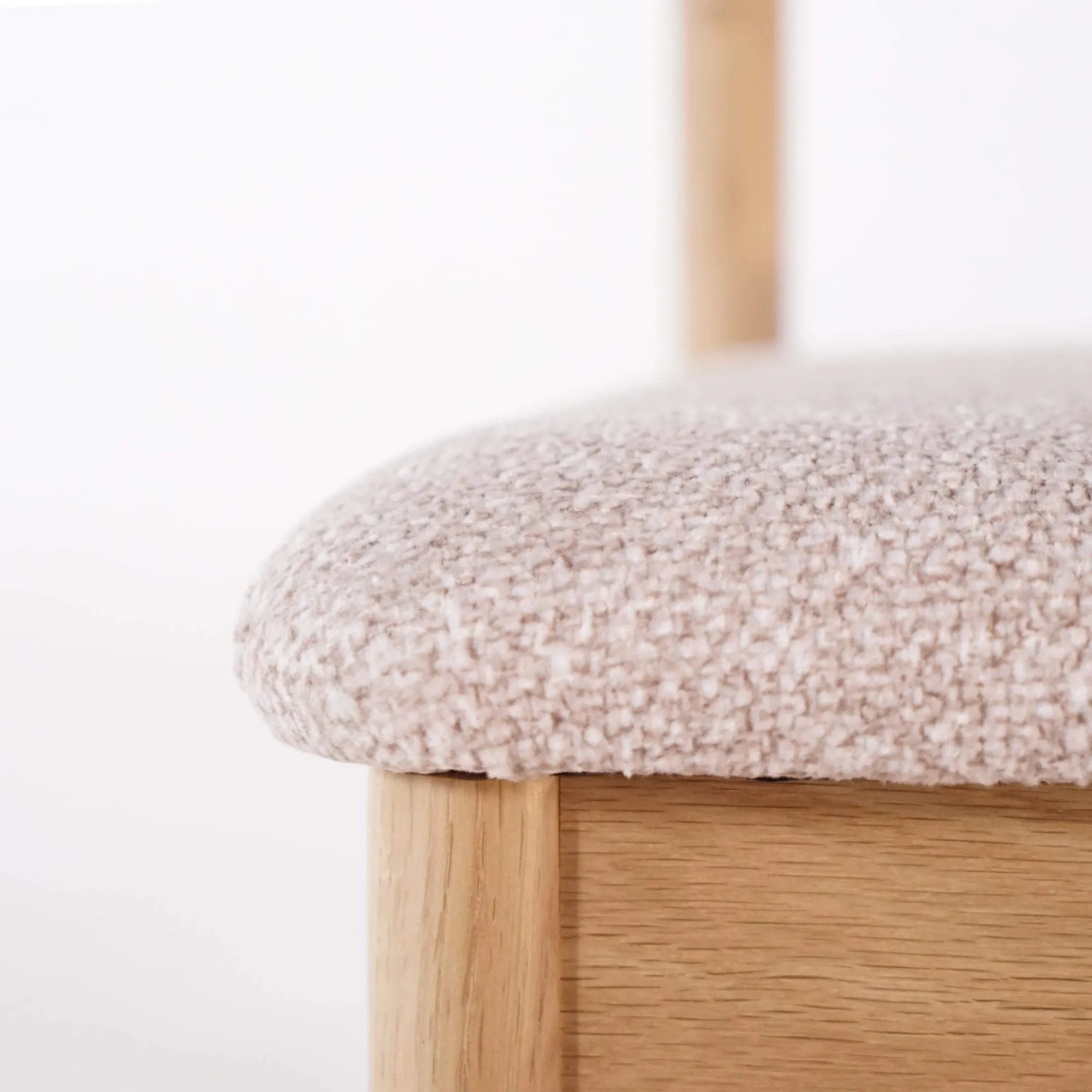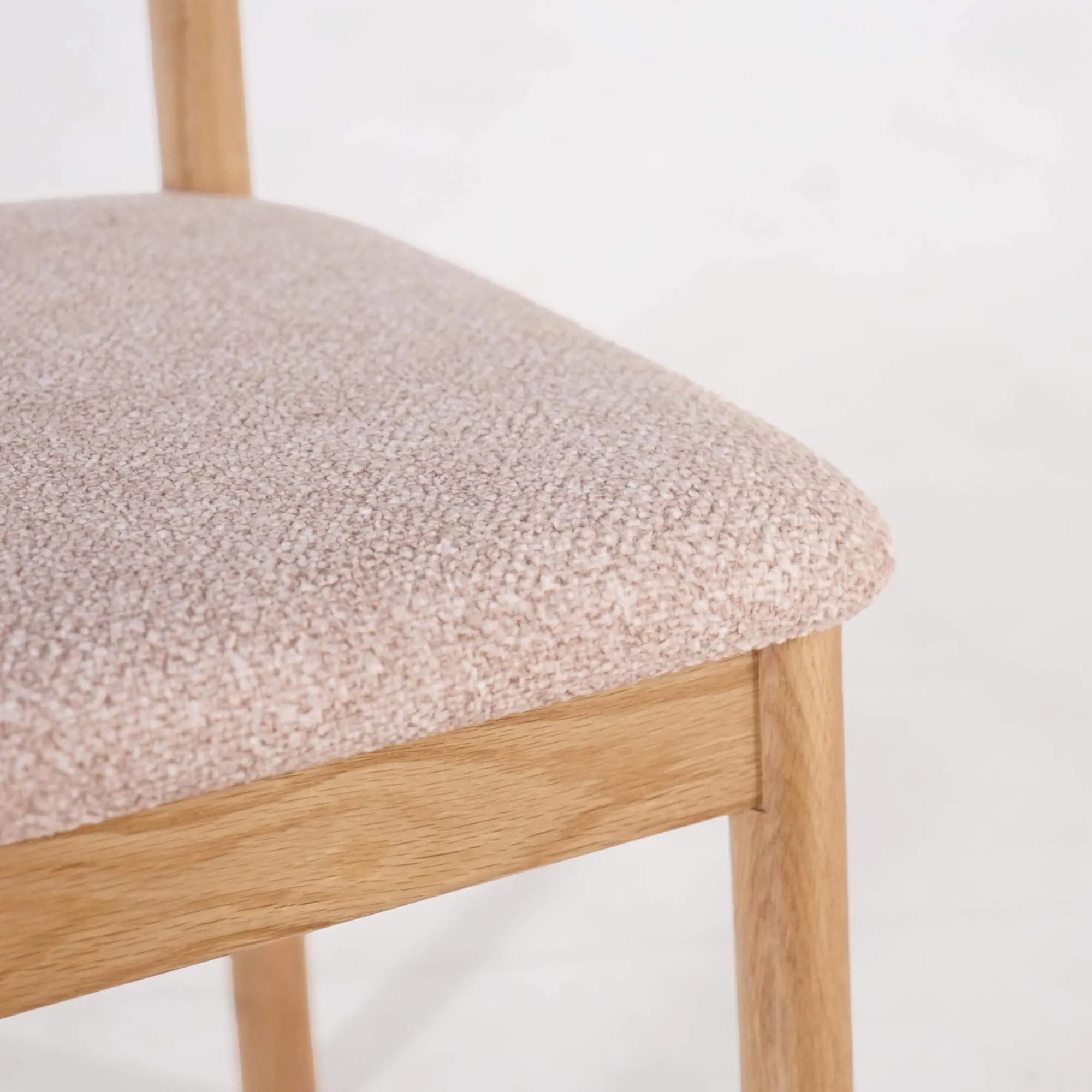 Fabriquée en bois massif, cette chaise de salle à manger en chêne et tissu exprime la beauté naturelle du bois à travers un piètement droit et solide, mis en valeur par une finition claire et satinée qui laisse respirer la matière. La structure révèle le grain délicat du chêne et souligne le travail artisanal précis de chaque assemblage. L’assise et le dossier sont recouverts d’un tissu bouclé doux et chaleureux, dont la teinte subtilement rosée apporte une note lumineuse et contemporaine à l’ensemble.