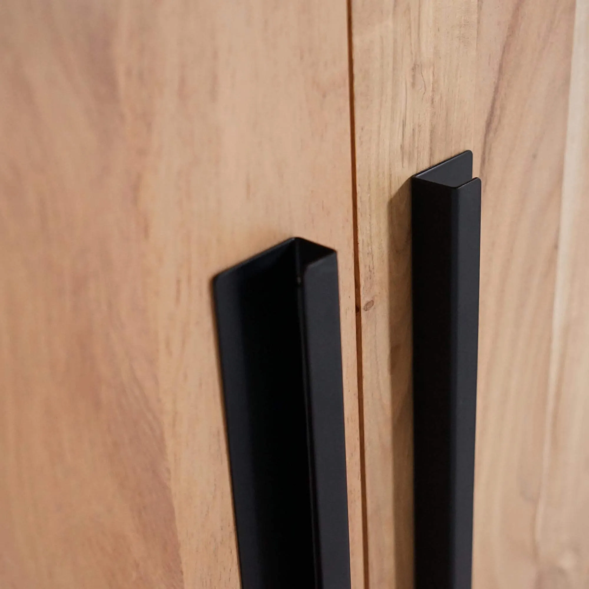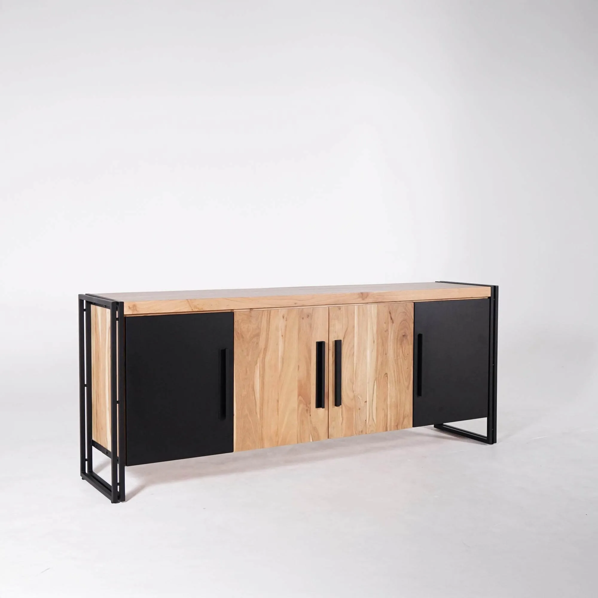 Nous avons sélectionné le bois massif d'acacia pour sa résistance et pour la richesse de son veinage. Chaque façade révèle des nuances chaleureuses, parfois traversées de nœuds et de mouvements naturels qui rendent chaque pièce singulière. Le contraste avec les portes latérales en métal noir mat souligne son caractère urbain, tandis que les poignées élancées prolongent cette écriture graphique. Nous sommes particulièrement fiers de cet équilibre entre force et chaleur, entre rigueur industrielle et matière vivante.