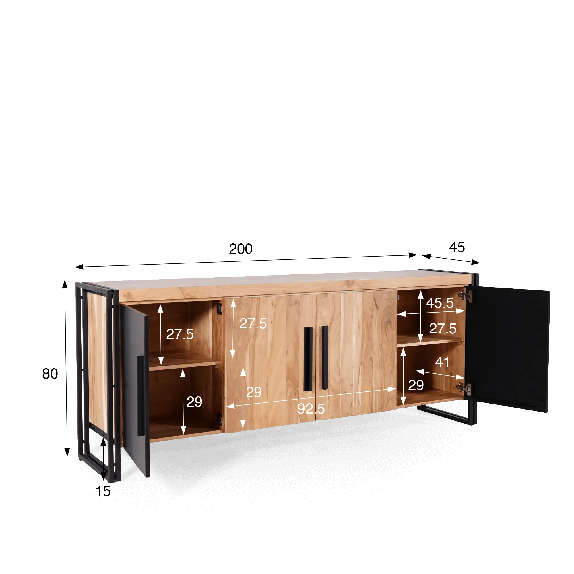 Derrière ses quatre portes battantes de ce bahut en bois massif style industriel, l’organisation intérieure a été pensée pour le quotidien. Les compartiments centraux offrent une largeur utile d’environ 92,5 cm, idéale pour la vaisselle ou le linge de maison, avec une hauteur intérieure de 27,5 cm sur la tablette supérieure et 29 cm en partie basse. Les espaces latéraux, profonds de 41 cm, accueillent aisément livres de recette, paniers ou objets plus volumineux. Cette générosité de rangement se fait discrète, intégrée dans une façade sobre et structurée.