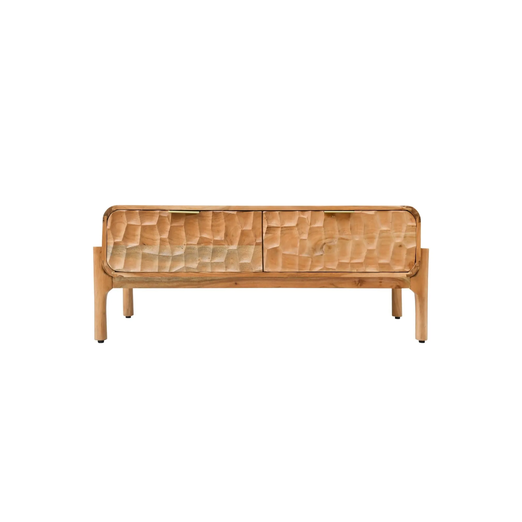 Réalisée en bois massif d’acacia, cette table basse design révèle toute la richesse d’une matière vivante dont les nuances chaleureuses apportent profondeur et authenticité. Nous avons porté une attention particulière au travail artisanal des façades, sculptées en relief pour capter la lumière et créer un jeu de textures délicat. Ce travail minutieux confère au meuble un caractère affirmé tout en conservant une grande douceur visuelle, fidèle à l’esprit naturel de la collection Naoki.
