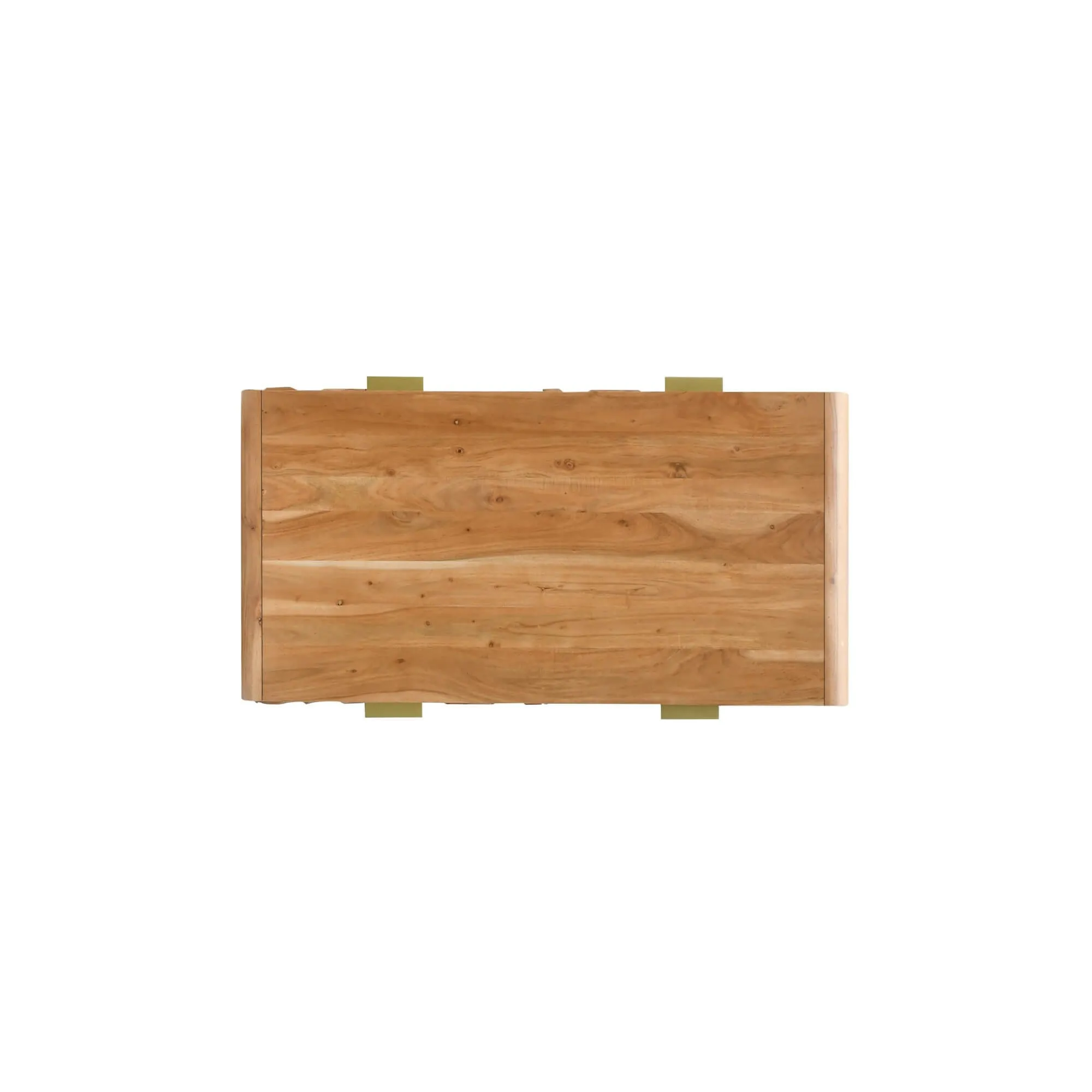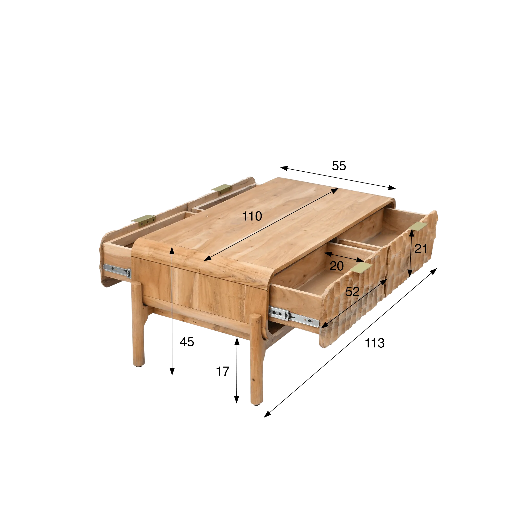 Pensée pour accompagner le quotidien, la table basse design en bois massif d'acacia Naoki dispose de quatre tiroirs intégrés, discrètement dissimulés dans son design. Chaque espace de rangement, d’environ 52 cm de largeur pour 20 cm de profondeur et 21 cm de hauteur, permet d’organiser télécommandes, livres ou objets personnels tout en préservant l’harmonie de la pièce. Les poignées en finition dorée apportent une touche de sophistication, soulignent la sobriété de l’ensemble et facilitent une utilisation intuitive.