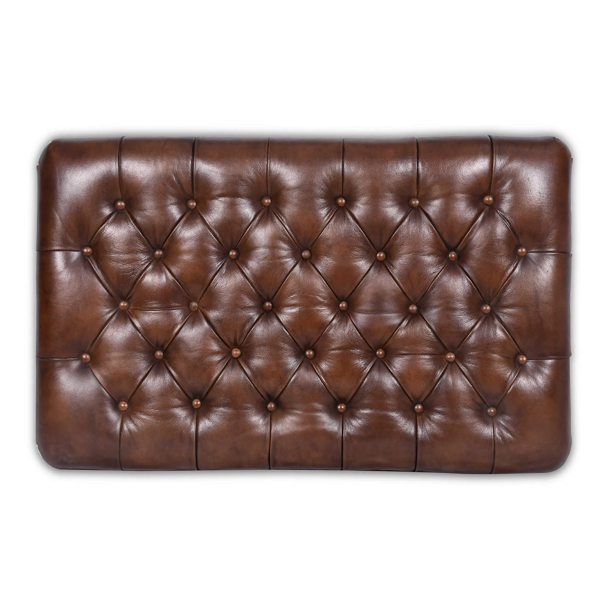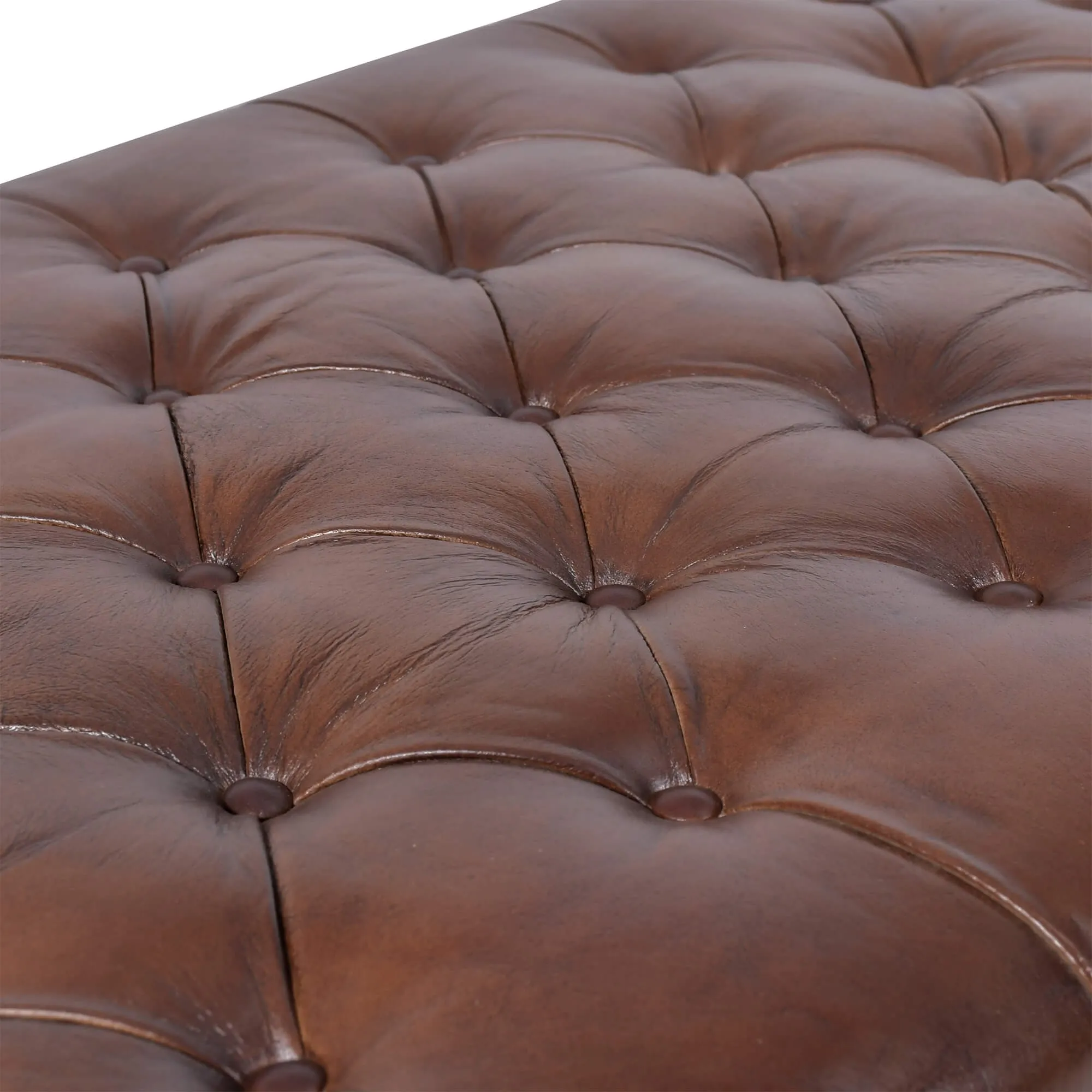 Le cuir de buffle pleine fleur s’est imposé comme une évidence. Sa texture souple, presque satinée par endroits, révèle des nuances de marron profond qui évoluent selon la lumière. En travaillant le capitonnage de ce repose-pieds Chesterfield en cuir véritable, nos artisans ont cherché un équilibre précis : des creux marqués, mais jamais rigides, pour offrir un confort qui se ressent dès le premier contact. Chaque bouton, chaque tension du cuir participe à ce relief généreux, pensé pour durer.