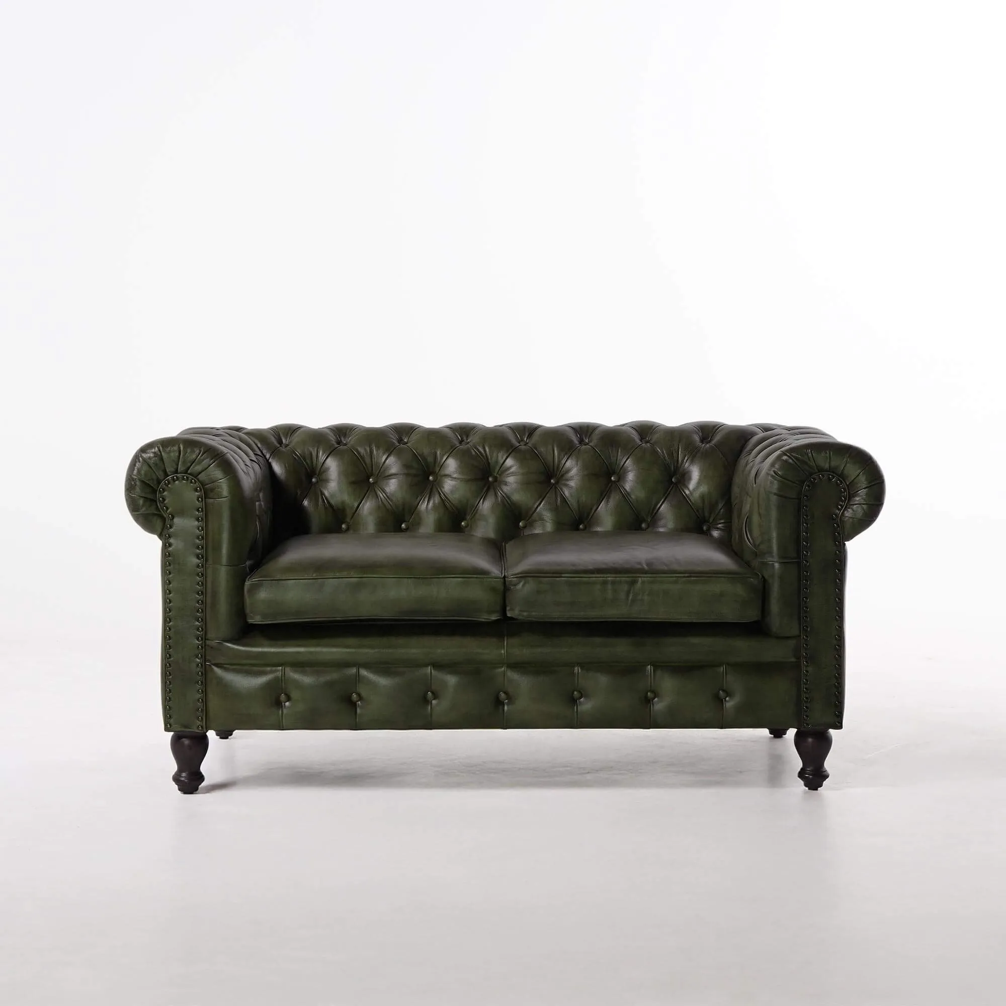 Avec le canapé Chesterfield en cuir véritable vert 2 places Edward, nous avons souhaité revisiter un grand classique en lui insufflant une présence plus contemporaine, sans trahir son héritage. Ce canapé Chesterfield 2 places reprend les codes emblématiques du Chesterfield – capitonnage profond, accoudoirs enroulés, lignes généreuses – tout en proposant des proportions pensées pour les intérieurs d’aujourd’hui.