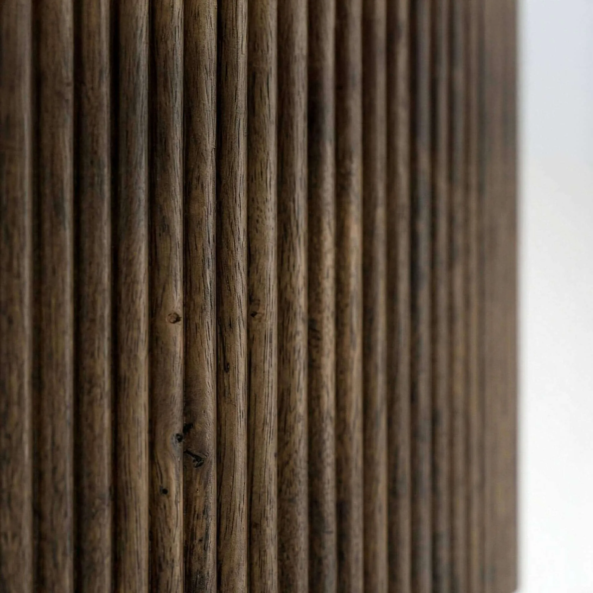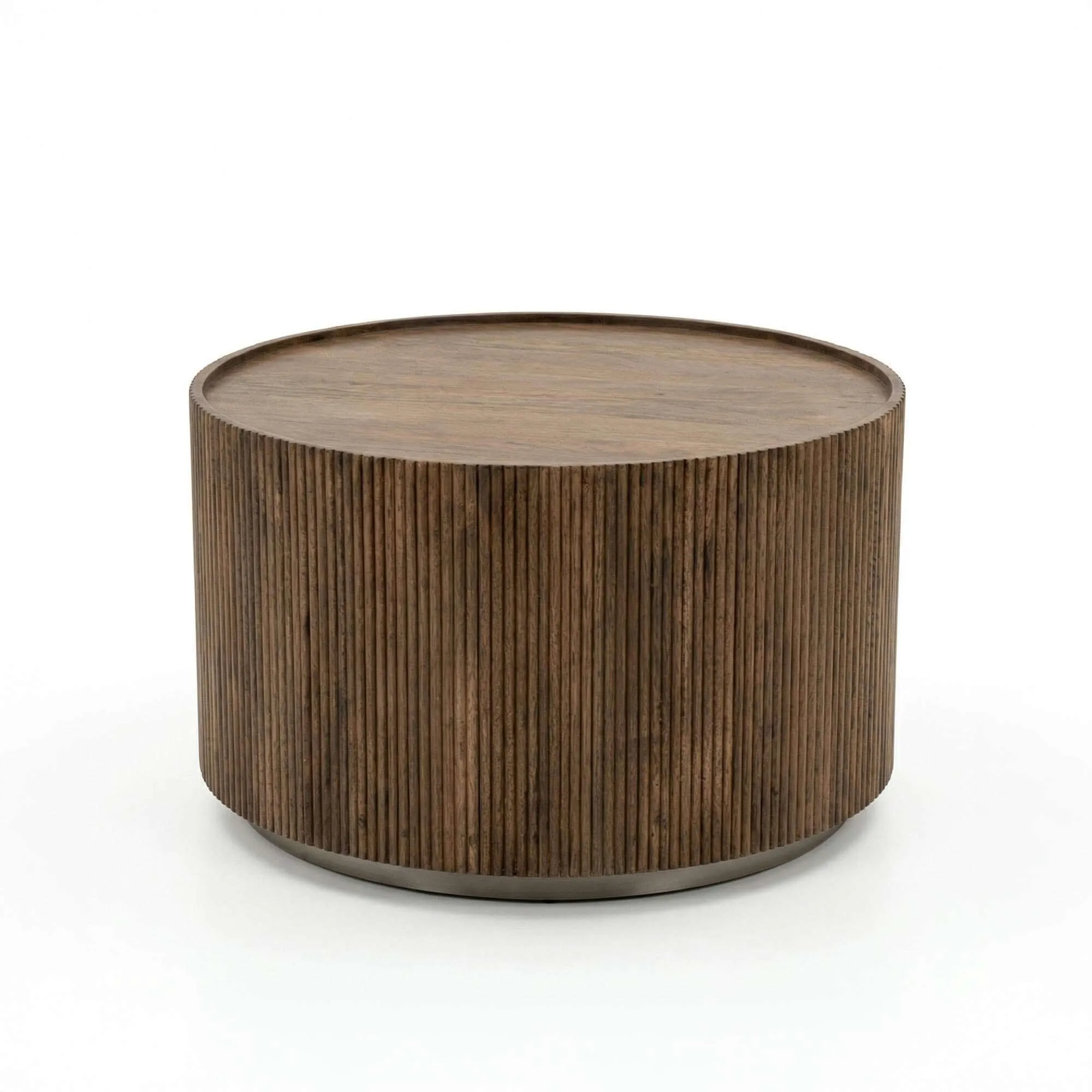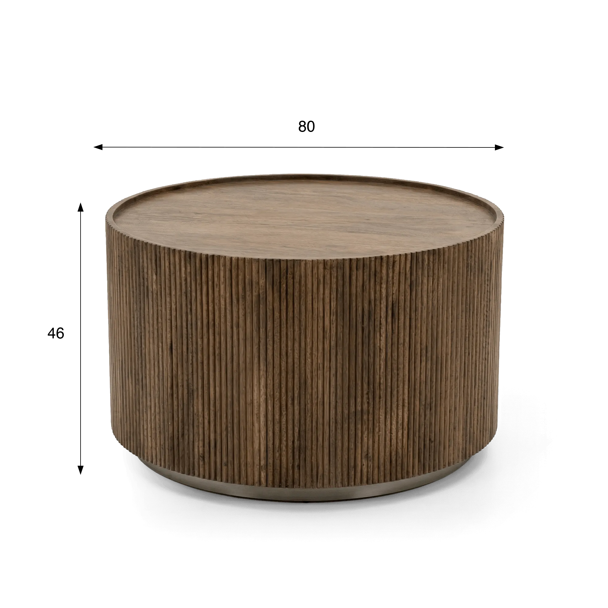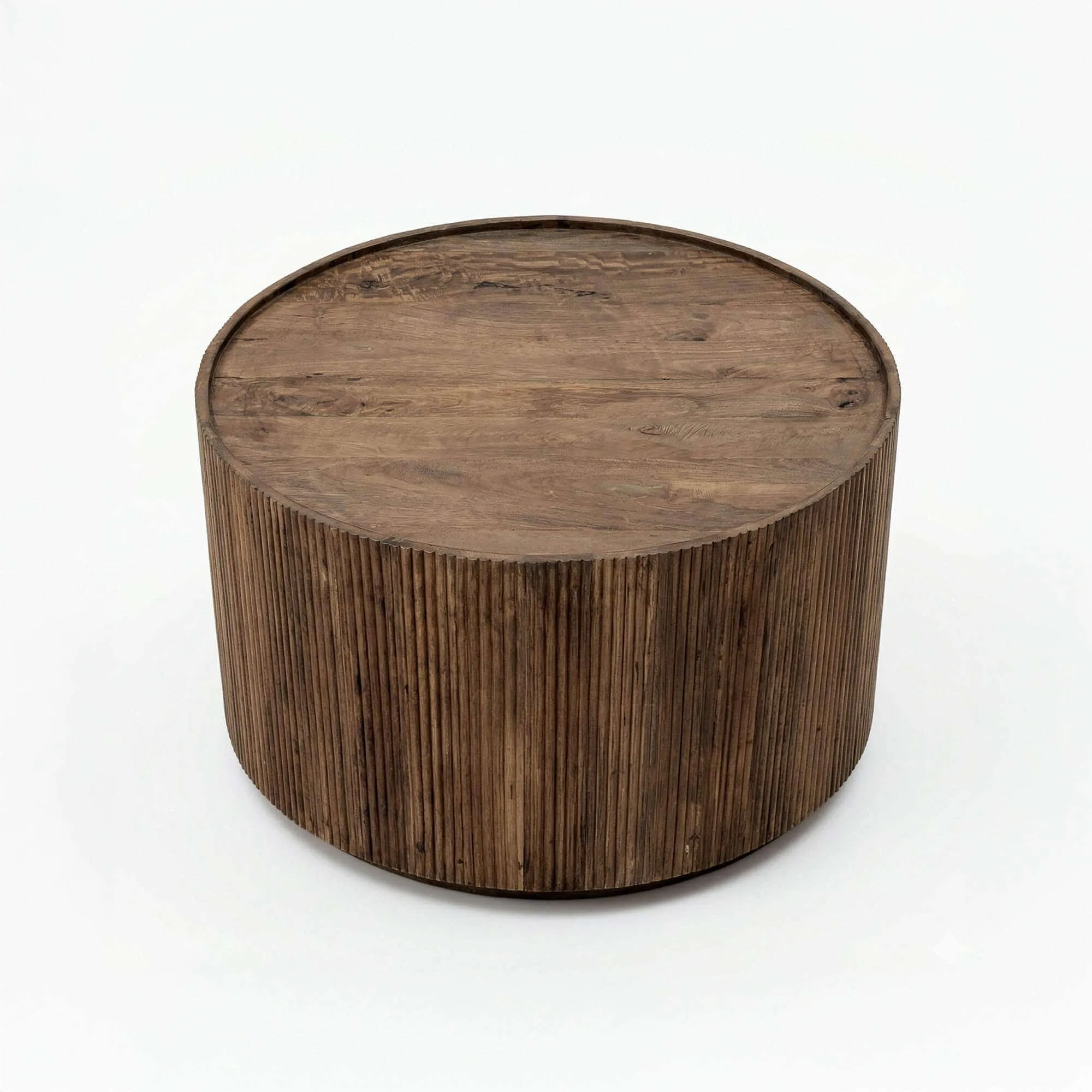 Le choix du bois massif de manguier s’est imposé pour son authenticité et la richesse de son veinage. Chaque nuance présente dans cette table basse ronde en bois massif révèle une matière vivante, travaillée avec précision pour conserver toute la profondeur de son aspect naturel. Nos designers ont imaginé une façade cannelée rythmée par de fines lignes verticales qui apportent du relief à l’ensemble. Ce travail délicat met en valeur la texture du bois et capte subtilement la lumière, donnant au meuble une présence affirmée sans alourdir l’espace.