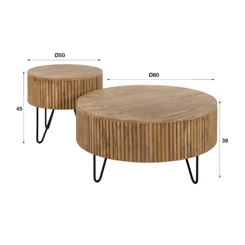 Le plateau circulaire de cette table de salon ronde en bois massif de manguier, généreux et parfaitement lisse, met en valeur le veinage du manguier et offre une surface accueillante pour un vase, quelques livres ou un service à café. Son diamètre de 80 cm pour la grande version et de 50 cm pour la petite assure un bel équilibre entre praticité et esthétique, tout en facilitant une circulation fluide autour du canapé. Avec leurs hauteurs respectives de 38 et 45 cm, ces deux tables s’associent visuellement de manière naturelle et permettent de créer des compositions modulaires selon les besoins du quotidien.