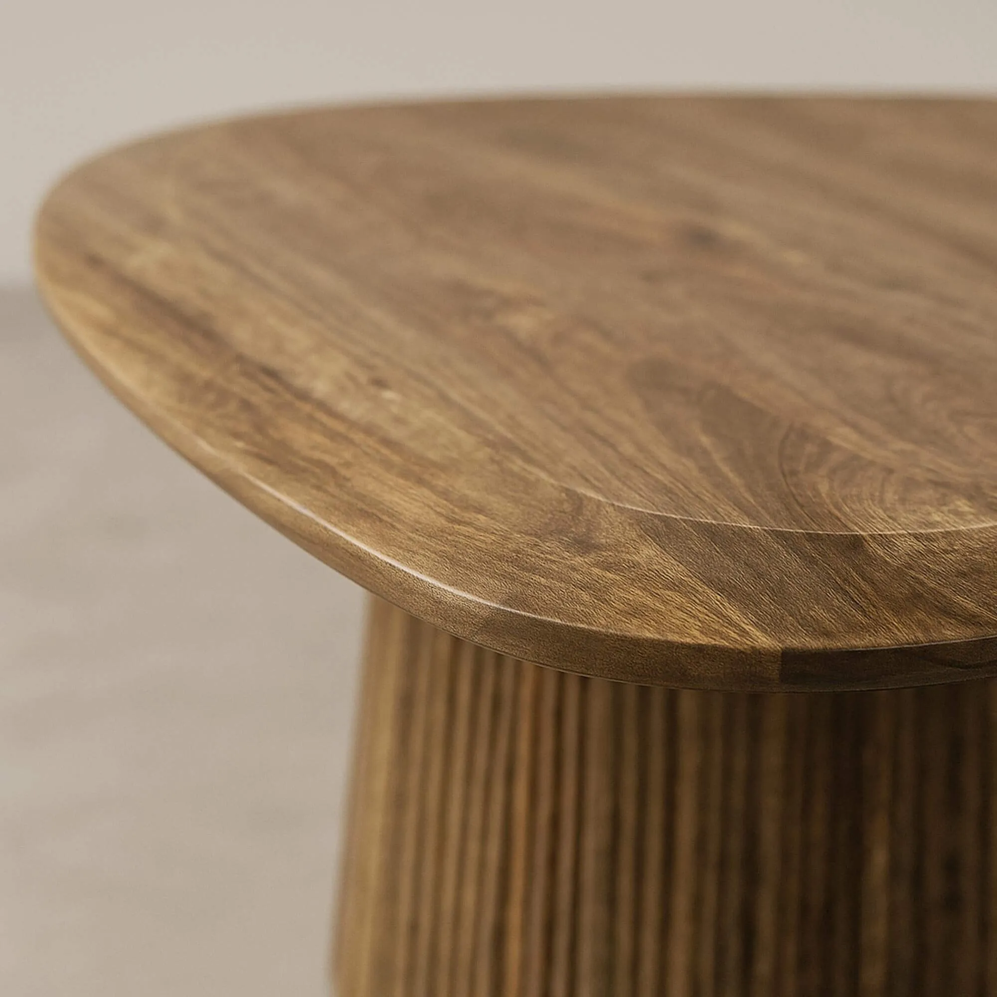 Le contraste entre la surface lisse du plateau et la base striée de cette table de salon en bois massif de manguier, composée d’un cylindre aux reliefs délicatement rythmé, structure la silhouette sans la brusquer. Nous avons volontairement conservé une lecture simple du design, afin que les veines du bois restent les véritables protagonistes. Selon la lumière de la pièce, elles se teintent de reflets dorés ou plus miel, apportant une présence douce mais marquée au centre du séjour.