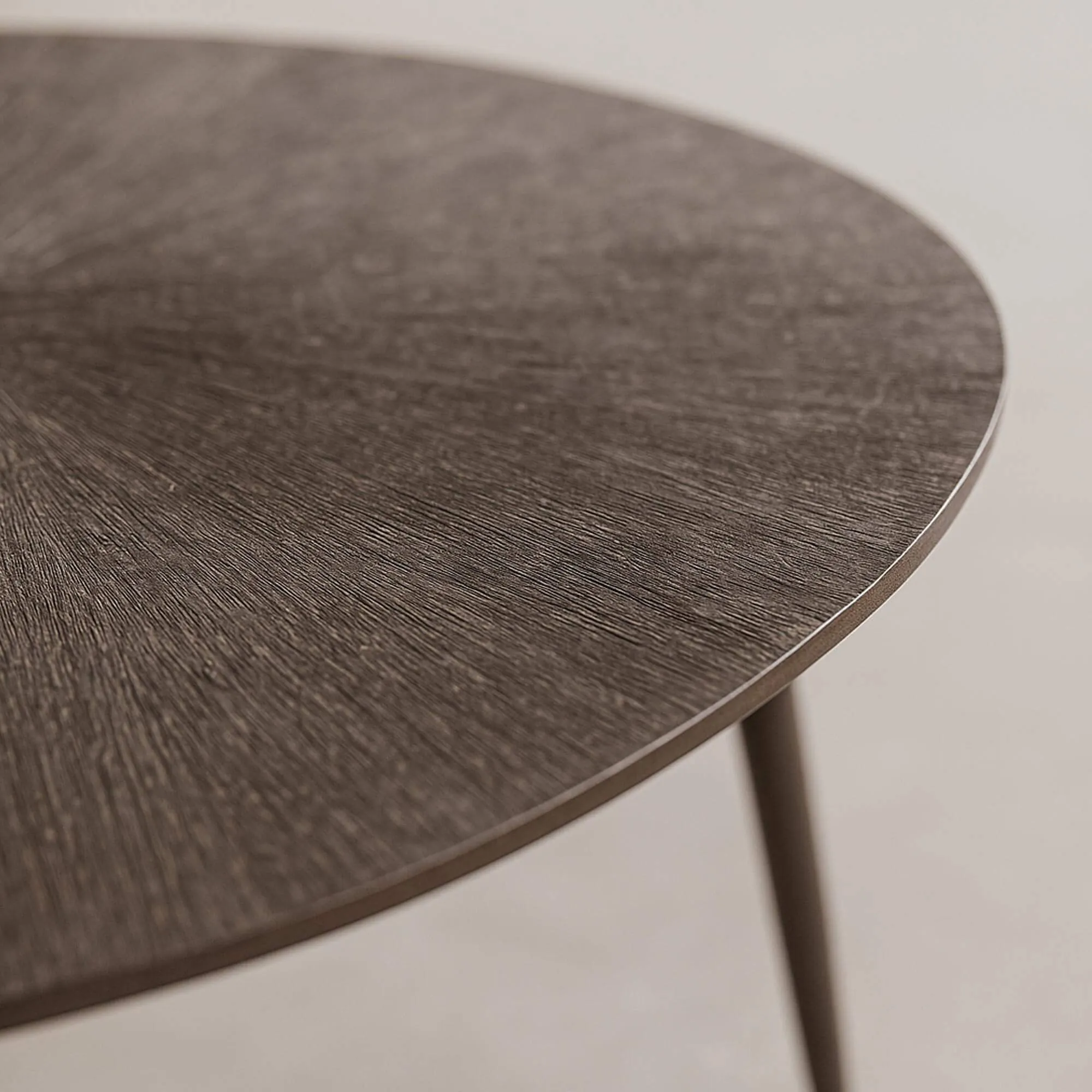 La finition bronze choisie pour cette table basse en métal couleur bronze, obtenue par une texture finement rayonnée, donne à chaque plateau une vibration singulière. Au toucher, la surface révèle un relief discret, presque minéral, qui fait écho au rayonnement central. Cette matière n’est pas là pour séduire seulement au premier regard : elle vieillira bien, résistera au quotidien, et continuera de jouer avec la lumière naturelle au fil des heures.