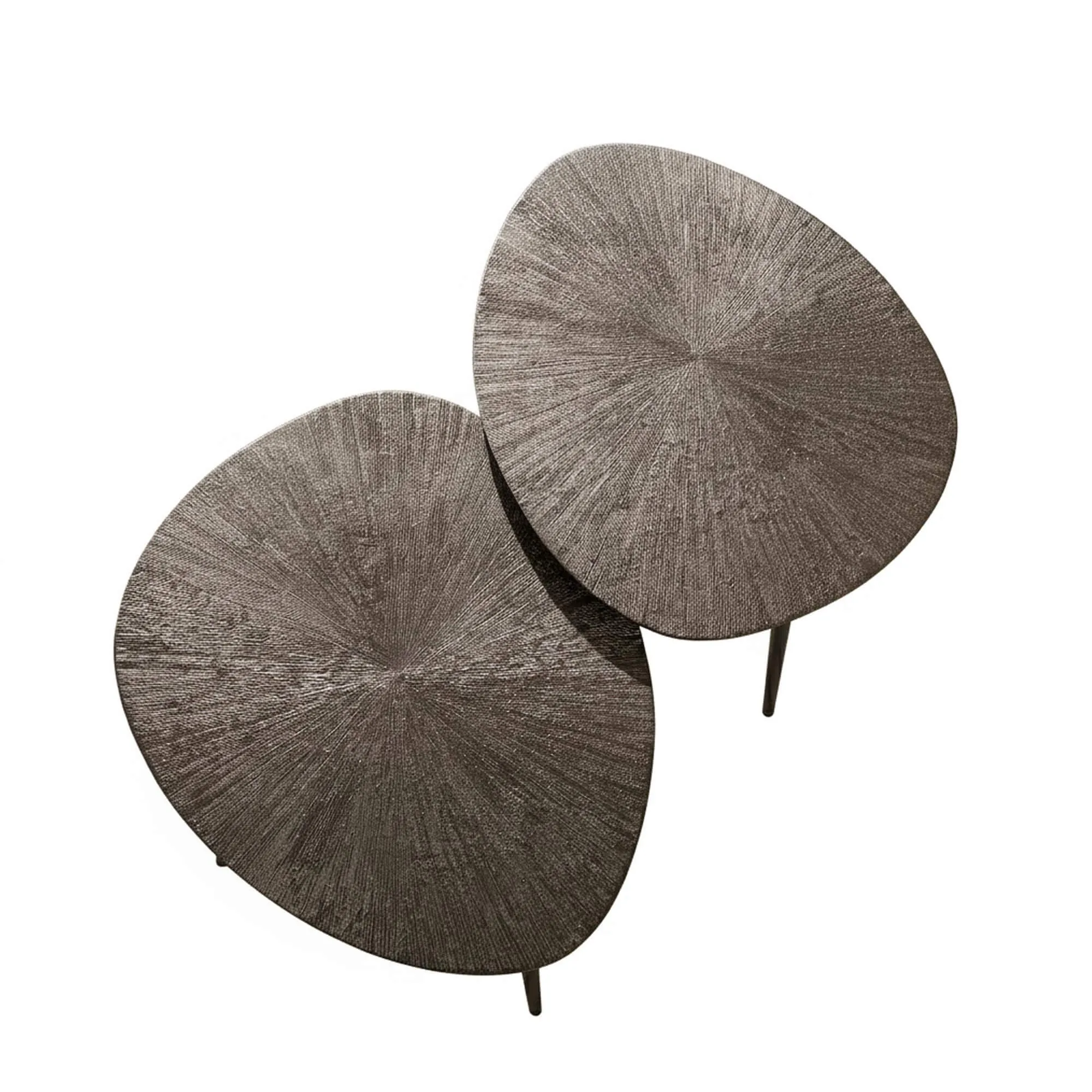 Nos designers ont imaginé la table basse en métal couleur bronze Nesso en lot de deux comme une pièce qui capte la lumière et redéfinit l’espace sans jamais l’alourdir. Au fil des prototypes, nous avons travaillé la rondeur de ses plateaux pour évoquer les formes douces de la nature, tout en conservant une allure contemporaine qui s’intègre aussi bien dans un intérieur épuré que dans un salon plus chaleureux.