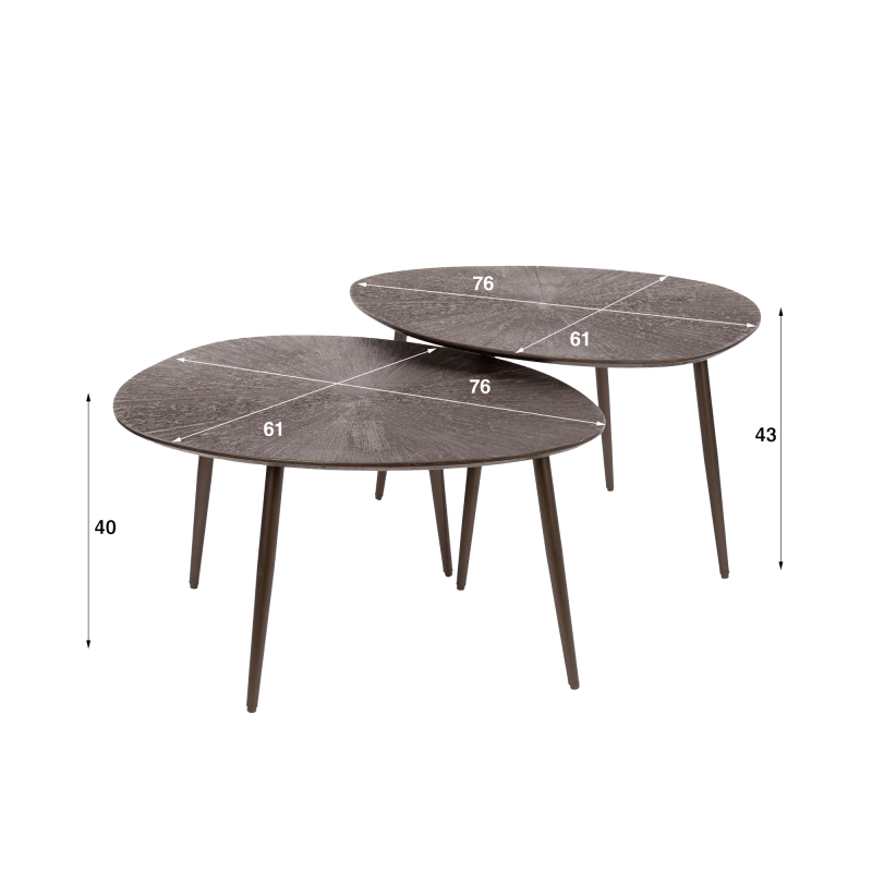 Notre table basse en métal couleur bronze Nesso se compose d’une grande table de 76 × 61 cm et d’une plus basse de 76 × 61 cm également, respectivement positionnées à 43 cm et 40 cm de hauteur, ce qui crée un jeu de niveaux très plaisant dans un salon. L’ensemble reste léger visuellement grâce aux pieds en métal noir élancés, que nous avons souhaité fins mais stables, faciles à fixer en quelques minutes.