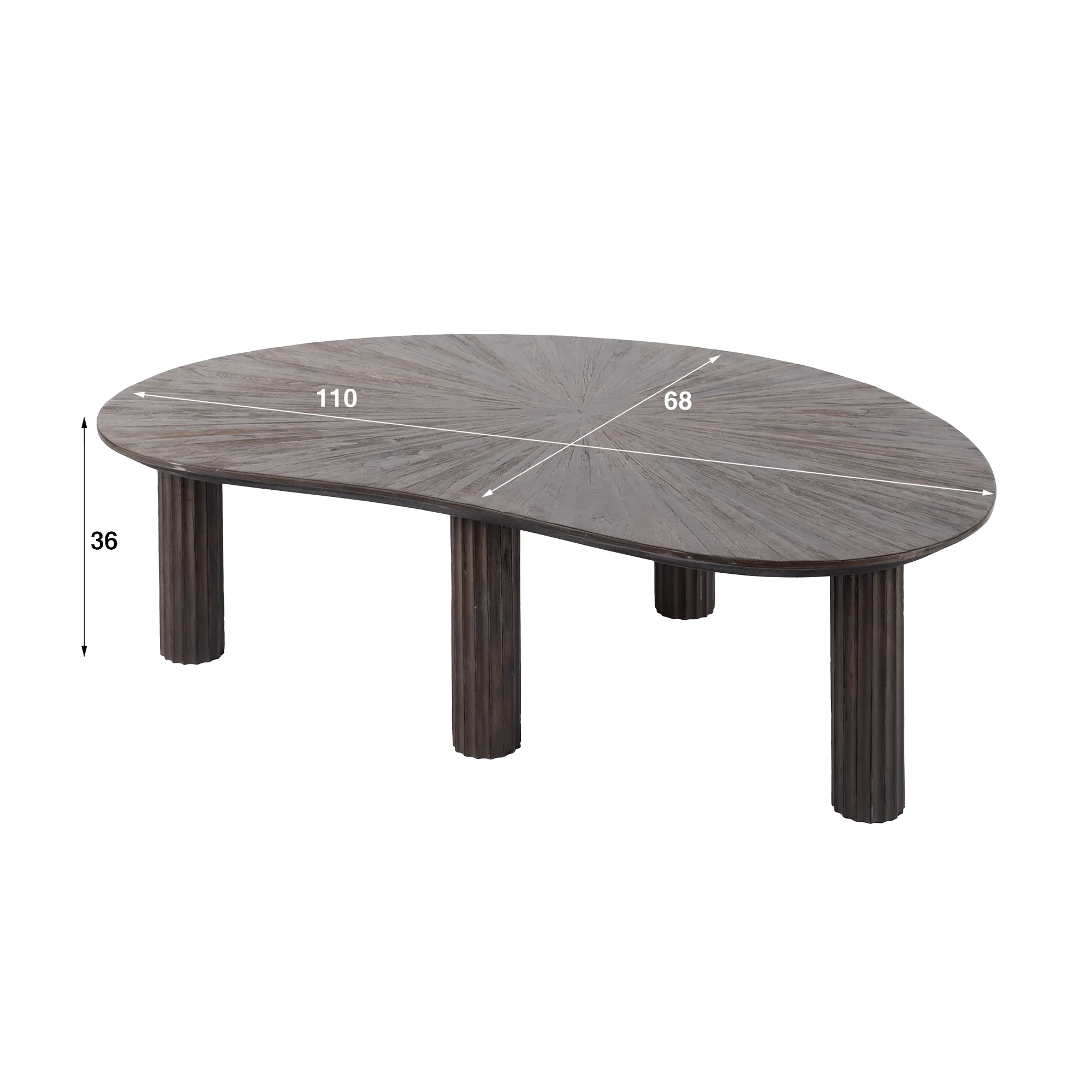 Le format généreux de notre table basse en bois de teck forme organique couleur marron de la gamme Ovo — environ 110 cm dans sa longueur maximale pour 68 cm dans sa partie la plus large — en fait un véritable point d’ancrage dans la pièce. Nous avons volontairement choisi une hauteur discrète de 36 cm afin qu’elle s’intègre naturellement devant un canapé, sans alourdir l’espace. Ses pieds ronds, eux aussi en teck, reprennent un motif cannelé que nous avons développé pour apporter de la verticalité et une impression de stabilité. Ils se fixent en quelques minutes, rendant l’installation simple et intuitive.