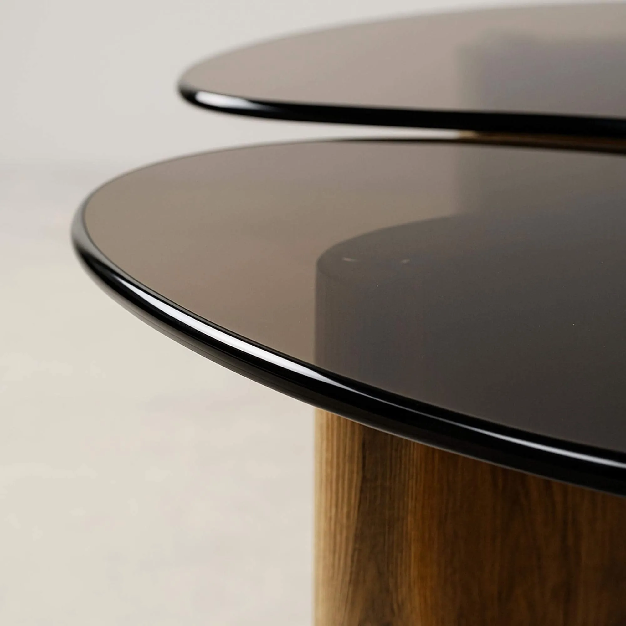 Dans la gamme Tinto, nous avons souhaité explorer une autre manière d’aborder la table basse : plus légère visuellement, plus délicate, tout en préservant la profondeur et la chaleur du bois. Cette table de salon forme organique avec plateau en verre en deux modules joue sur la transparence du verre teinté et la rondeur de pieds en bois courbé, créant un ensemble à la fois aérien et affirmé. Dès les premiers croquis, nos designers voulaient offrir une pièce où la lumière circule librement, sans jamais sacrifier la stabilité ni la présence du meuble.