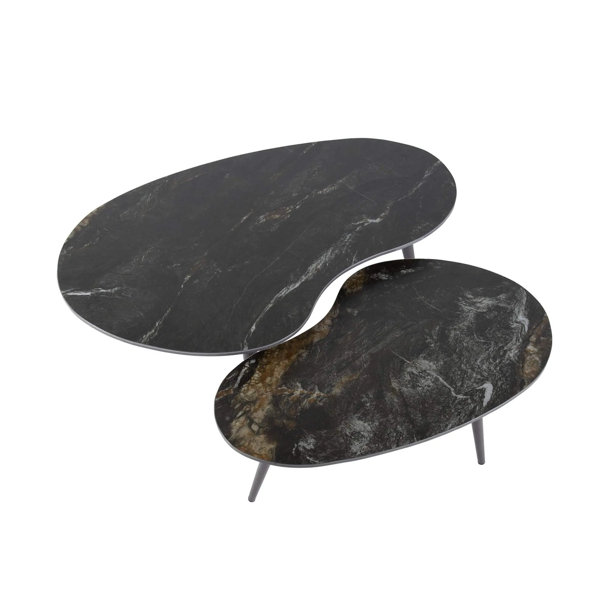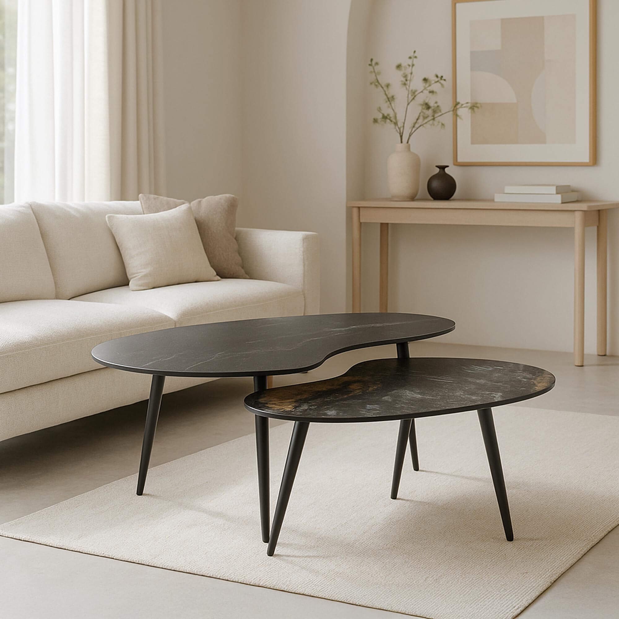 Nos designers ont imaginé ce set de 2 tables basses de forme organique en céramique comme un duo harmonieux, pensé pour apporter de la profondeur et une présence subtile au cœur du salon. Nous voulions créer deux pièces qui dialoguent entre elles, non seulement par leur forme organique inspirée des galets polis, mais aussi par le contraste délicat entre leurs nuances minérales. Chaque plateau révèle un dessin de céramique aux reflets sombres, traversé de veines fines et de zones plus chaleureuses, qui varient selon la lumière du jour et qui rappellent les lignes caractéristiques du marbre.