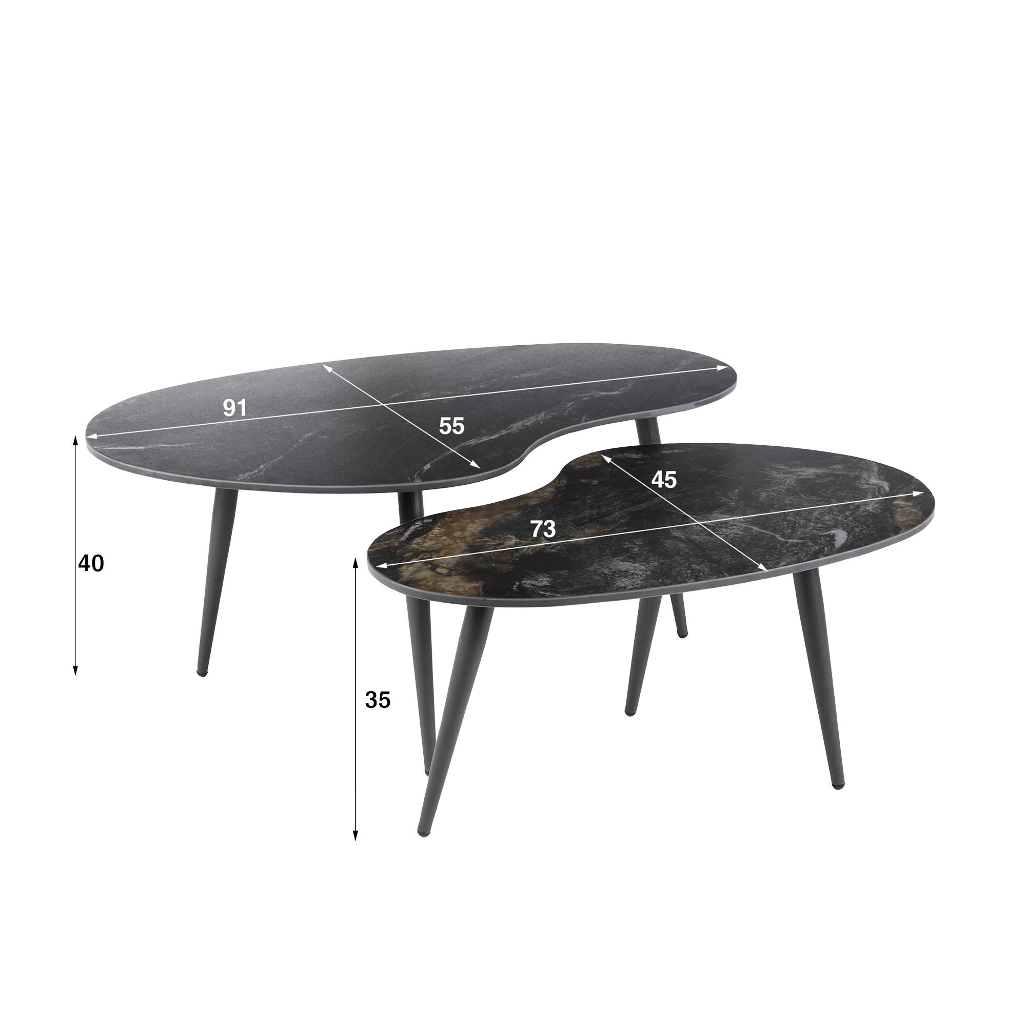 La table principale de ce set de 2 tables basses de forme organique en céramique, longue de 91 cm, se déploie avec une ligne douce et légèrement asymétrique. À ses côtés, la seconde, plus compacte avec ses 73 cm, s’insère naturellement sous la première grâce à une différence de hauteur de 5 cm (40 cm et 35 cm). Cette superposition crée un jeu visuel fluide, presque mouvant, tout en offrant un espace généreux pour poser livres, objets décoratifs ou un plateau lors d’un moment convivial.