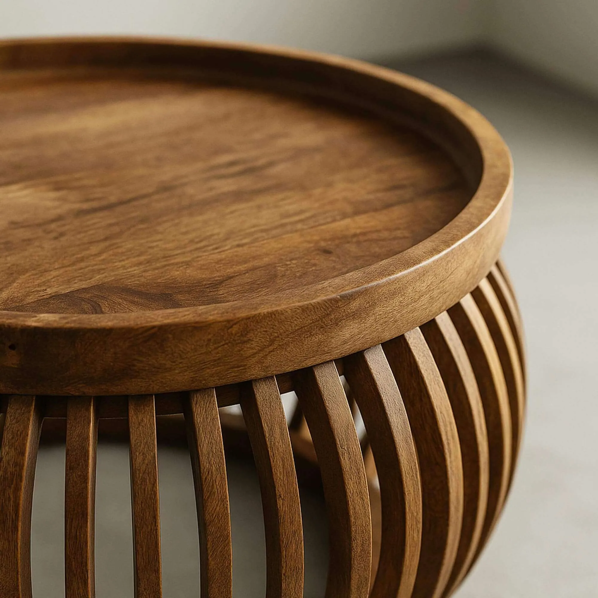 Le piètement ajouré de ce lot de 2 tables basses rondes en bois de manguier massif offre une grande stabilité doublée d'une légèreté visuelle. Ses courbures accentuent la sensation d’ouverture et apportent une touche sculpturale à l’espace. Nous avons souhaité que chaque latte révèle la main de l’artisan, à travers des finitions impeccables et une précision d’assemblage qui valorise le savoir-faire traditionnel.