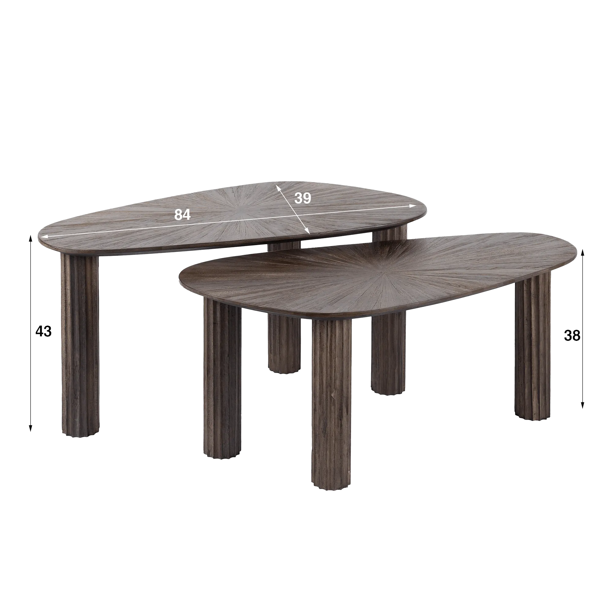 Chaque plateau de ce lot de 2 tables de salon rondes en bois de teck révèle un délicat effet de rayonnement sculpté dans le teck, obtenu grâce à un travail artisanal précis. La texture du bois se dévoile différemment selon la lumière, créant des variations subtiles qui enrichissent l’ambiance d’une pièce sans jamais la surcharger. Les deux plateaux atteignent 84 cm de largeur pour 39 cm de profondeur, tandis que la table inférieure s'installe à une hauteur légèrement plus basse de 5 cm par rapport à l'autre élément qui culmine à 43 cm de hauteur. Ce jeu de hauteurs permet de jouer sur les niveaux, de les superposer partiellement ou de les installer séparément selon l’organisation de l’espace.