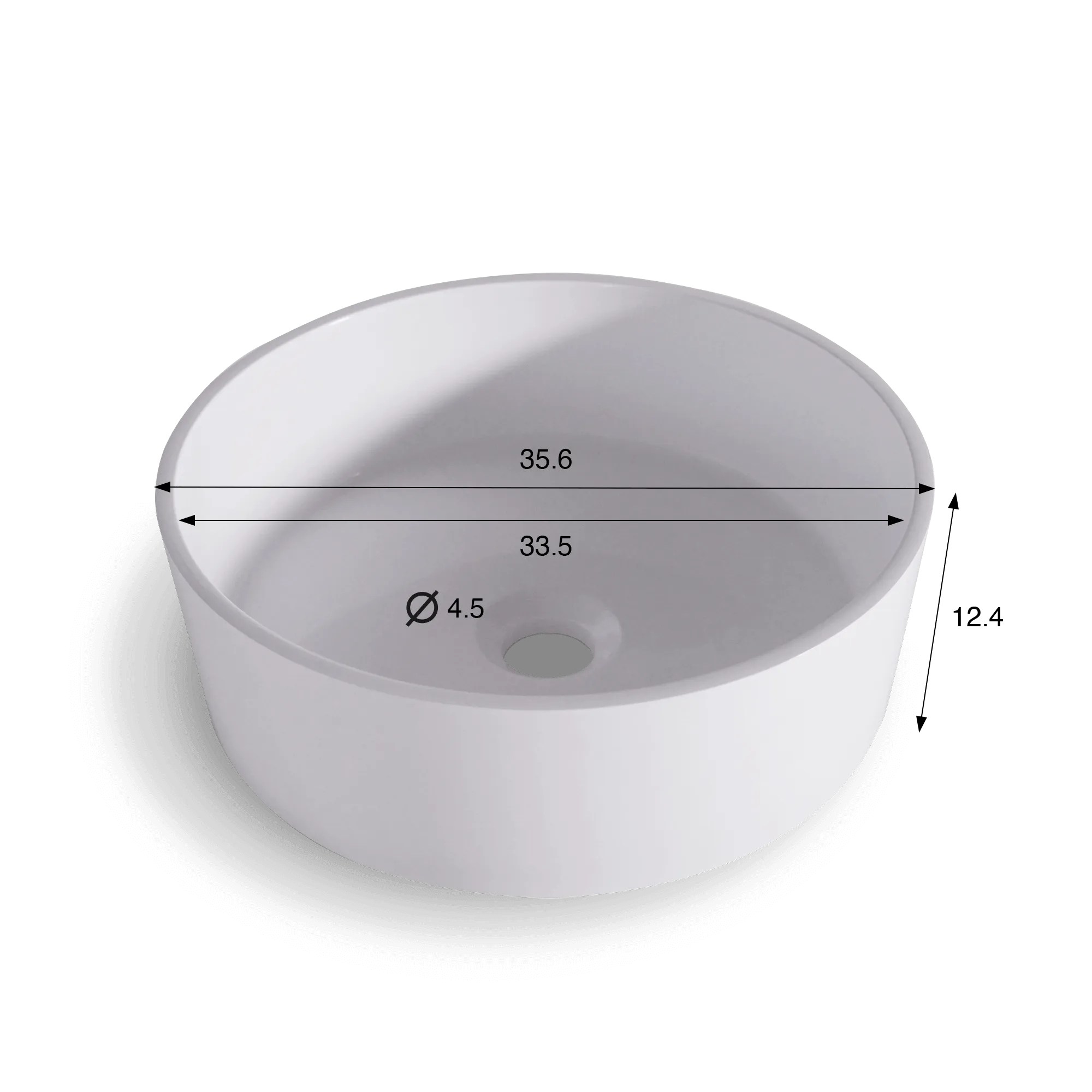 Les lignes circulaires de cette vasque ronde en céramique, blanc mat, ont été pensées pour offrir une ergonomie naturelle. Avec un diamètre extérieur d’environ 35,6 cm et une cuve intérieure de 33,5 cm, la vasque propose un espace confortable pour les gestes quotidiens, tandis que sa hauteur de 12,4 cm permet une installation élégante sur un meuble sous vasque ou un plan en bois massif. Le perçage central, au diamètre standard de 4,5 cm, s’intègre discrètement au dessin général et garantit une évacuation fluide.