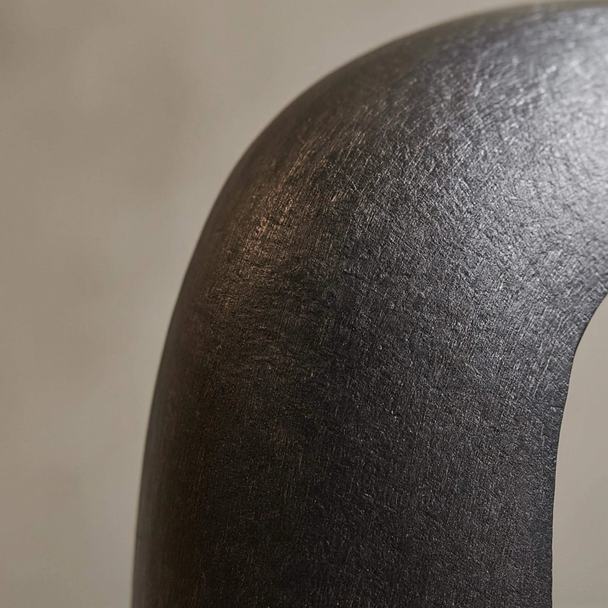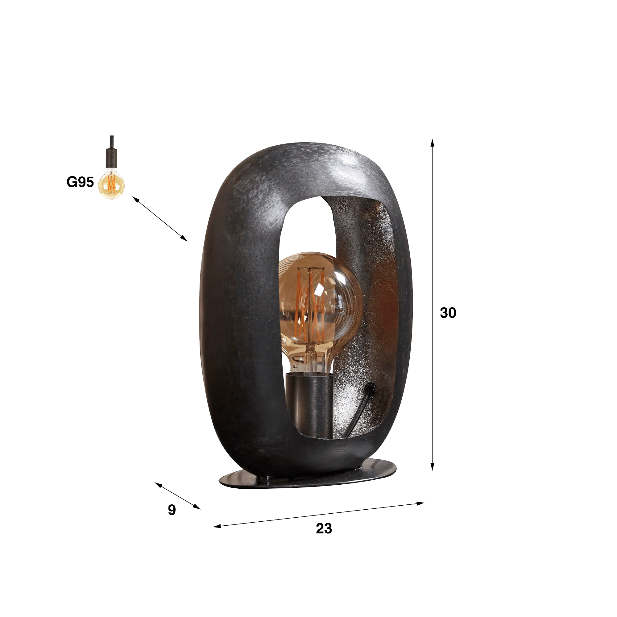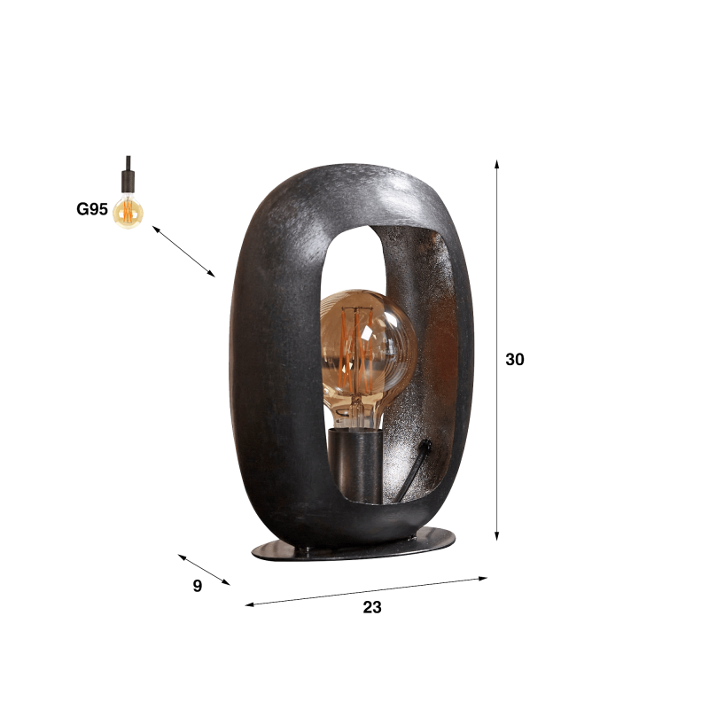 Nous avons imaginé cette lampe à poser style industriel comme un cadre ouvert qui laisserait la lumière respirer. La structure ovale — 30 cm de hauteur pour 23 cm de largeur — enveloppe l’ampoule sans l’enfermer, créant un jeu d’ombres doux lorsqu’elle s’allume. Le fond légèrement cuivré, laissé volontairement brut, diffuse une lueur chaude qui contraste avec l’extérieur noir charbon, donnant à l’ensemble une allure moderne et affirmée.