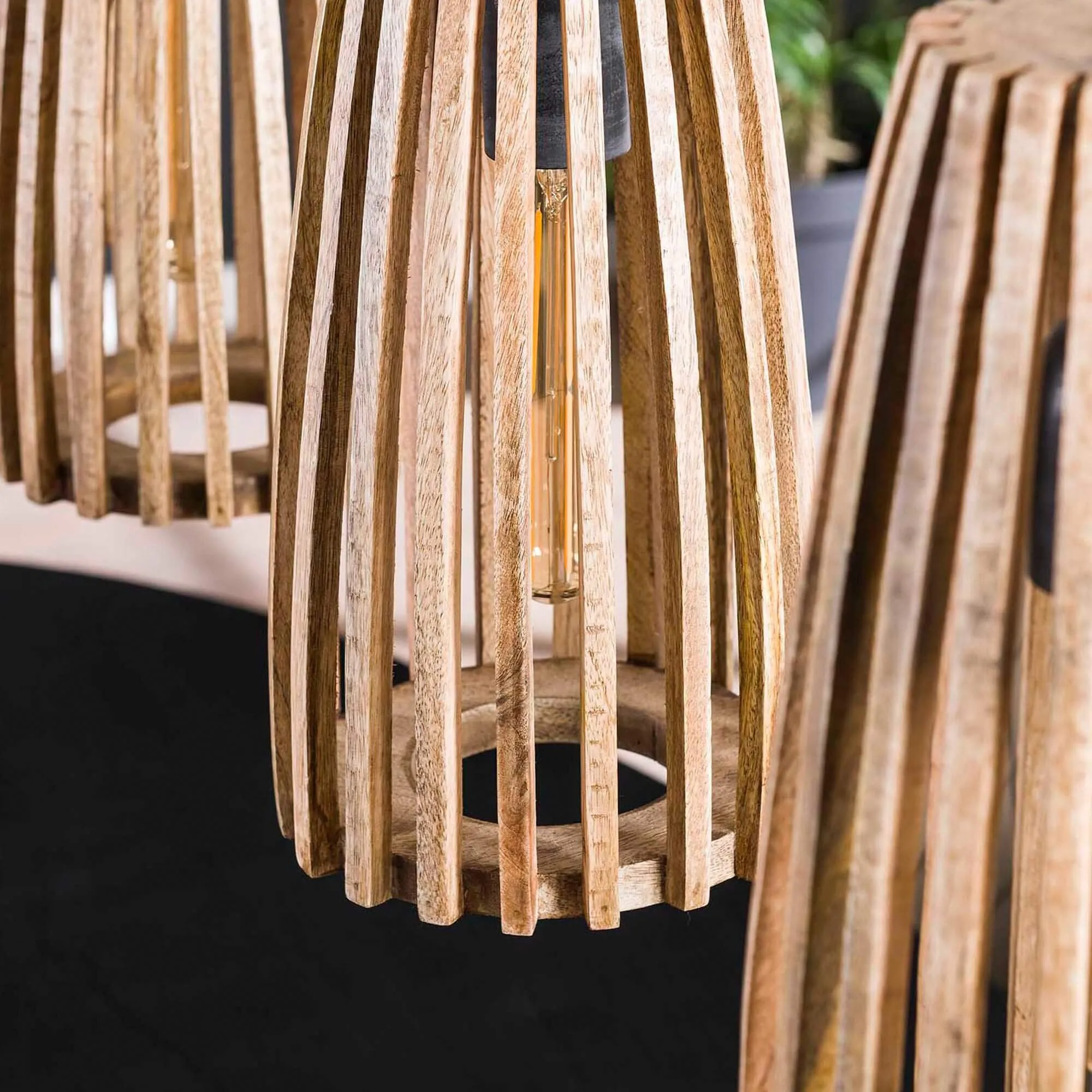 Lors de la conception de ce luminaire suspendu en bois de manguier massif, nous avons longuement travaillé l’espacement des abat-jour afin d’obtenir un ensemble harmonieux, à la fois graphique et doux. Le luminaire, déjà monté, est prêt à être installé : il suffit de régler la hauteur des câbles, qui peuvent atteindre 150 cm, pour l’adapter parfaitement à la pièce.