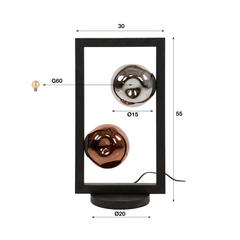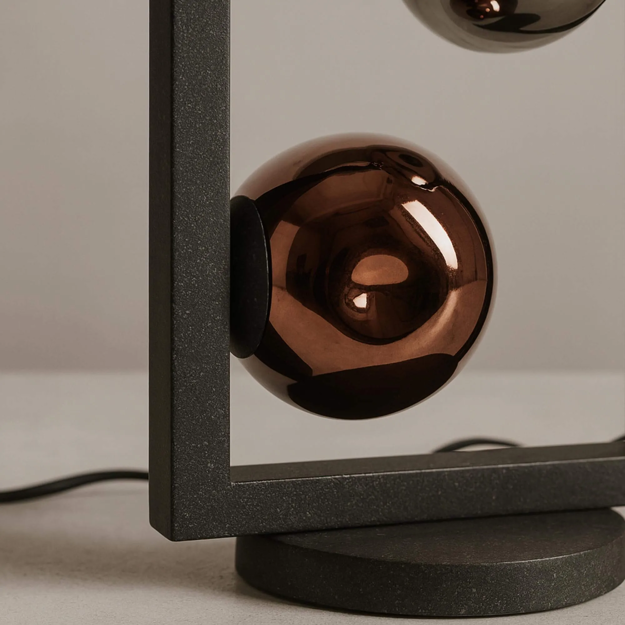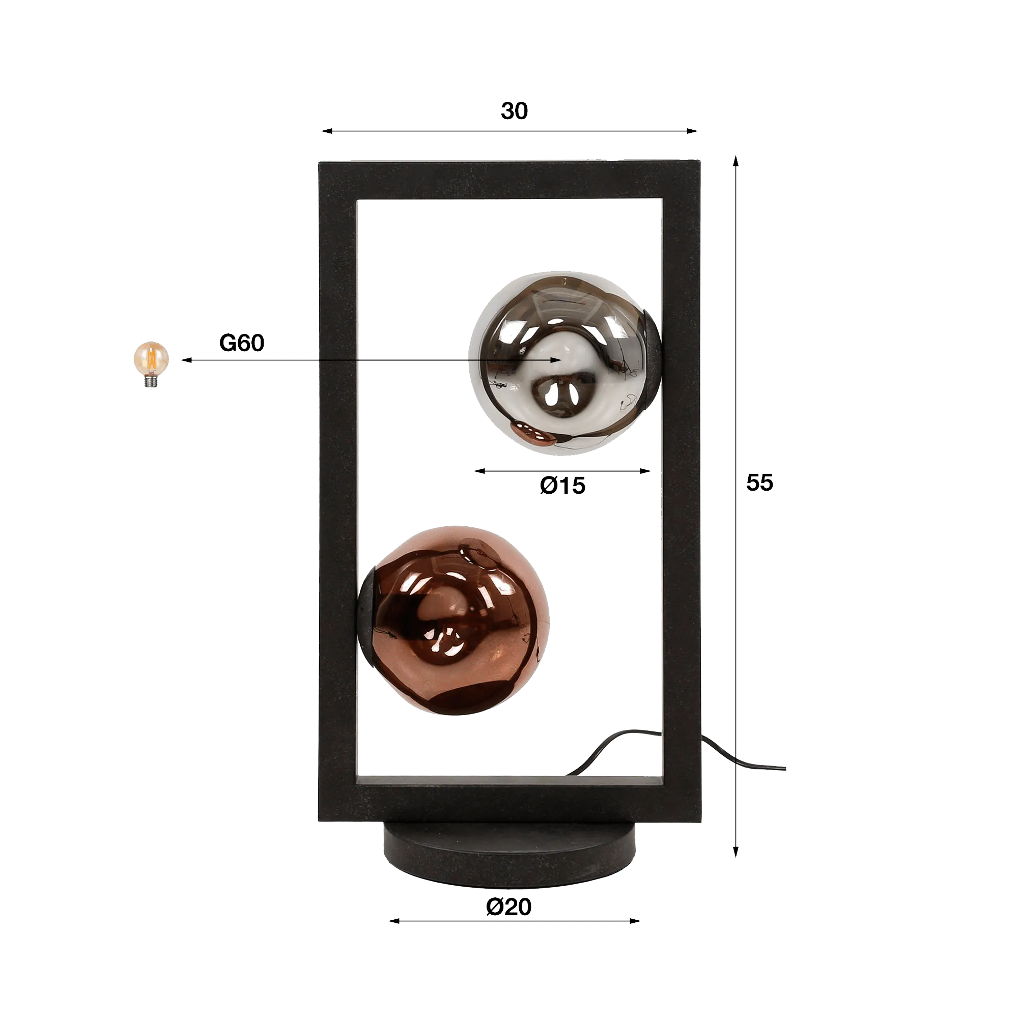 Avec la lampe à poser style industriel en métal avec abat-jours en verre Caleo, nous avons souhaité proposer un objet lumineux qui évoque la poésie des astres tout en assumant pleinement son caractère industriel. Nos designers se sont inspirés de la trajectoire des planètes : deux sphères en verre viennent flotter dans un cadre métallique noir, comme suspendues dans un instant silencieux. Cette structure géométrique contraste avec la douceur des globes, créant un équilibre qui habille l’espace sans l’alourdir.