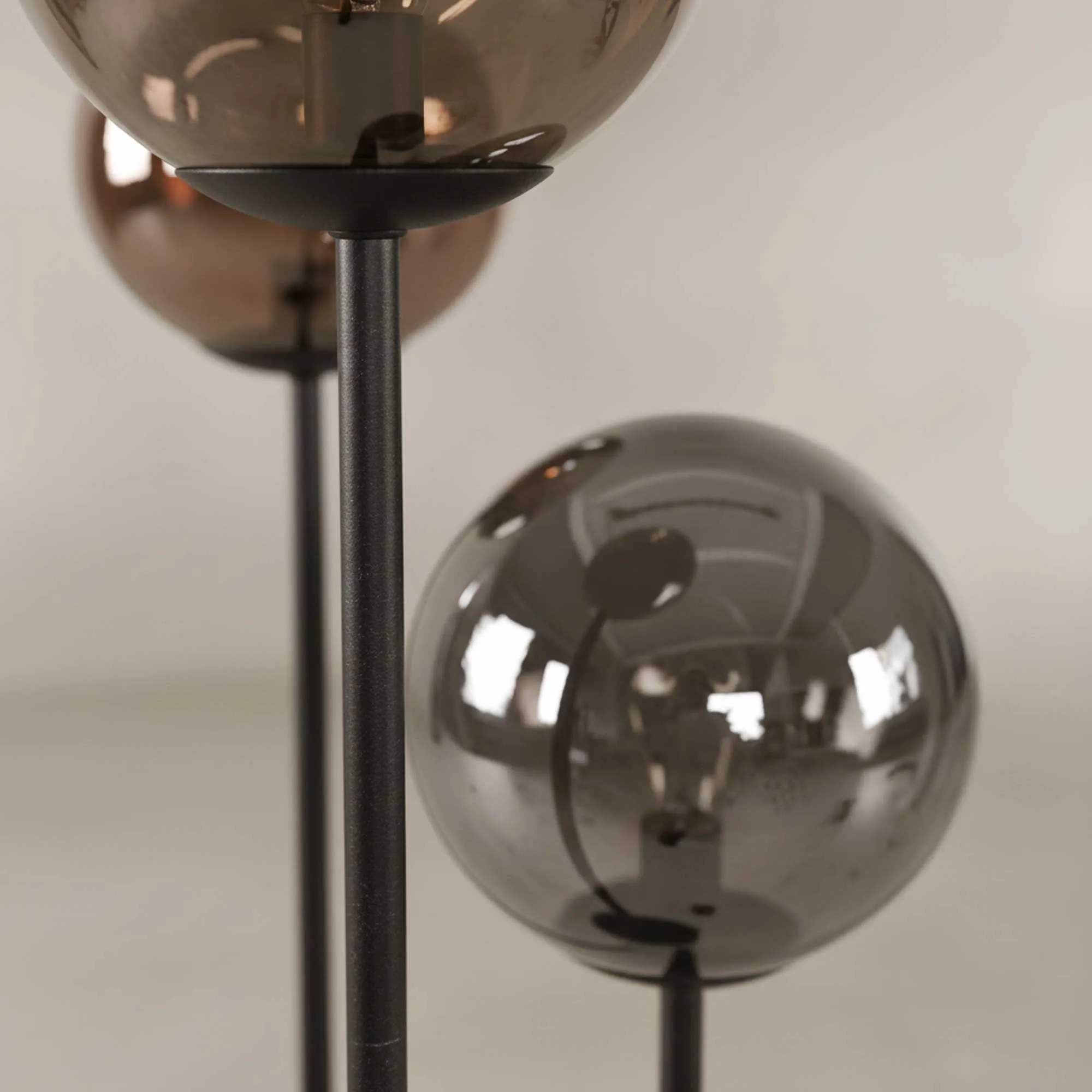 Avec le lampadaire de salon style industriel en métal avec abat-jours en verre Caleo, nous avons voulu imaginer une pièce lumineuse capable d’apporter une atmosphère chaleureuse dès qu’elle trouve sa place dans un intérieur. Nos designers se sont inspirés des astres qui gravitent autour de nous pour créer ces trois globes en verre soufflé, chacun révélant une teinte subtilement différente. Leur silhouette arrondie, tantôt ambrée, tantôt cuivrée ou fumée, diffuse une lumière douce et enveloppante qui transforme instantanément l’ambiance d’une pièce.