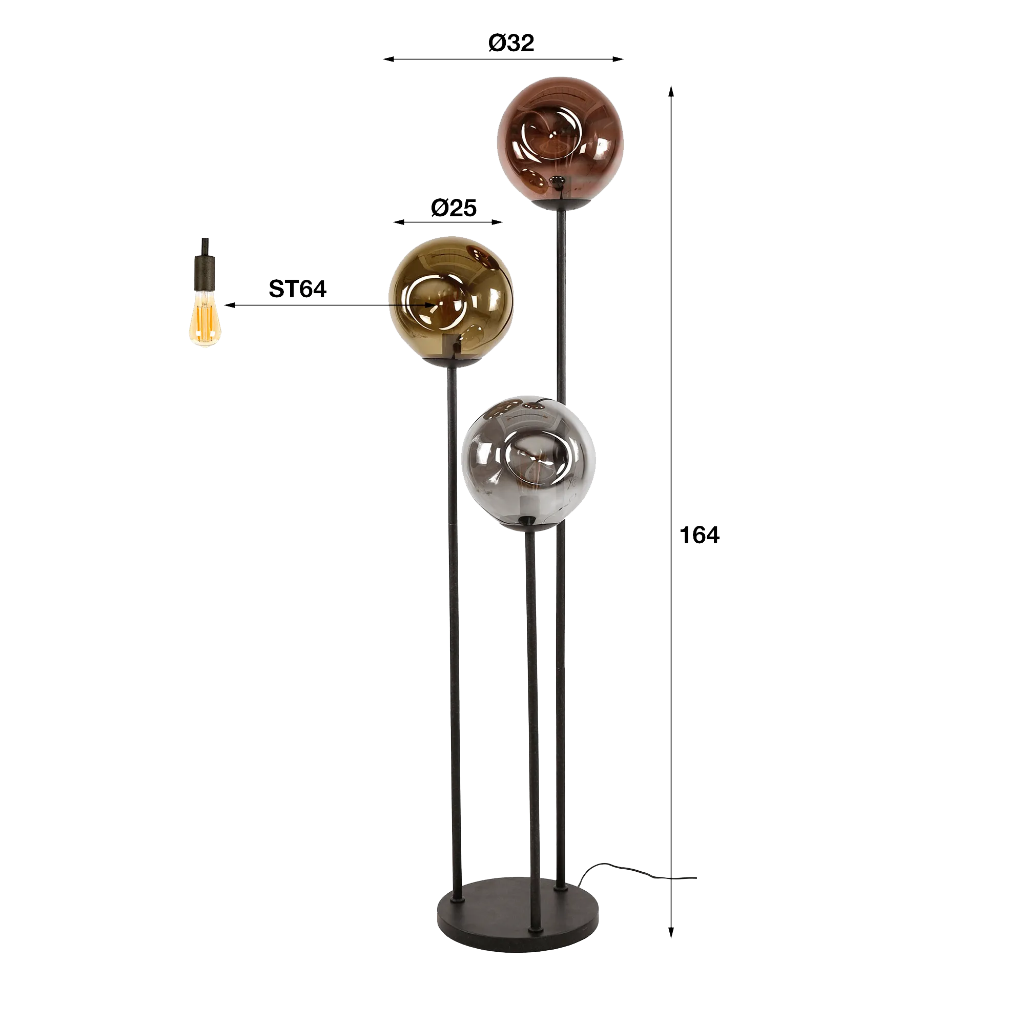 Portés par trois tiges en métal élancées, les abat-jours de ce lampadaire de salon style industriel en métal avec abat-jours en verre se positionnent à différentes hauteurs, jusqu’à environ 164 cm, créant un mouvement vertical léger qui attire naturellement le regard. Nous avons volontairement travaillé un contraste marqué entre la finesse du verre et la structure métallique, afin d’obtenir une présence équilibrée, à la fois affirmée et délicate. Chaque globe, avec son diamètre respectif de 25 cm, diffuse une luminosité chaleureuse lorsqu’il est associé à une ampoule adaptée, comme la ST64 (non incluse) que nous avons choisie, particulièrement harmonieuse avec ce type de verre teinté.