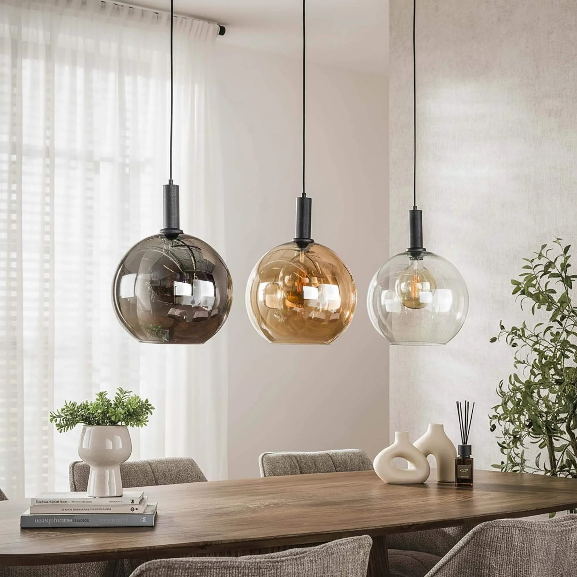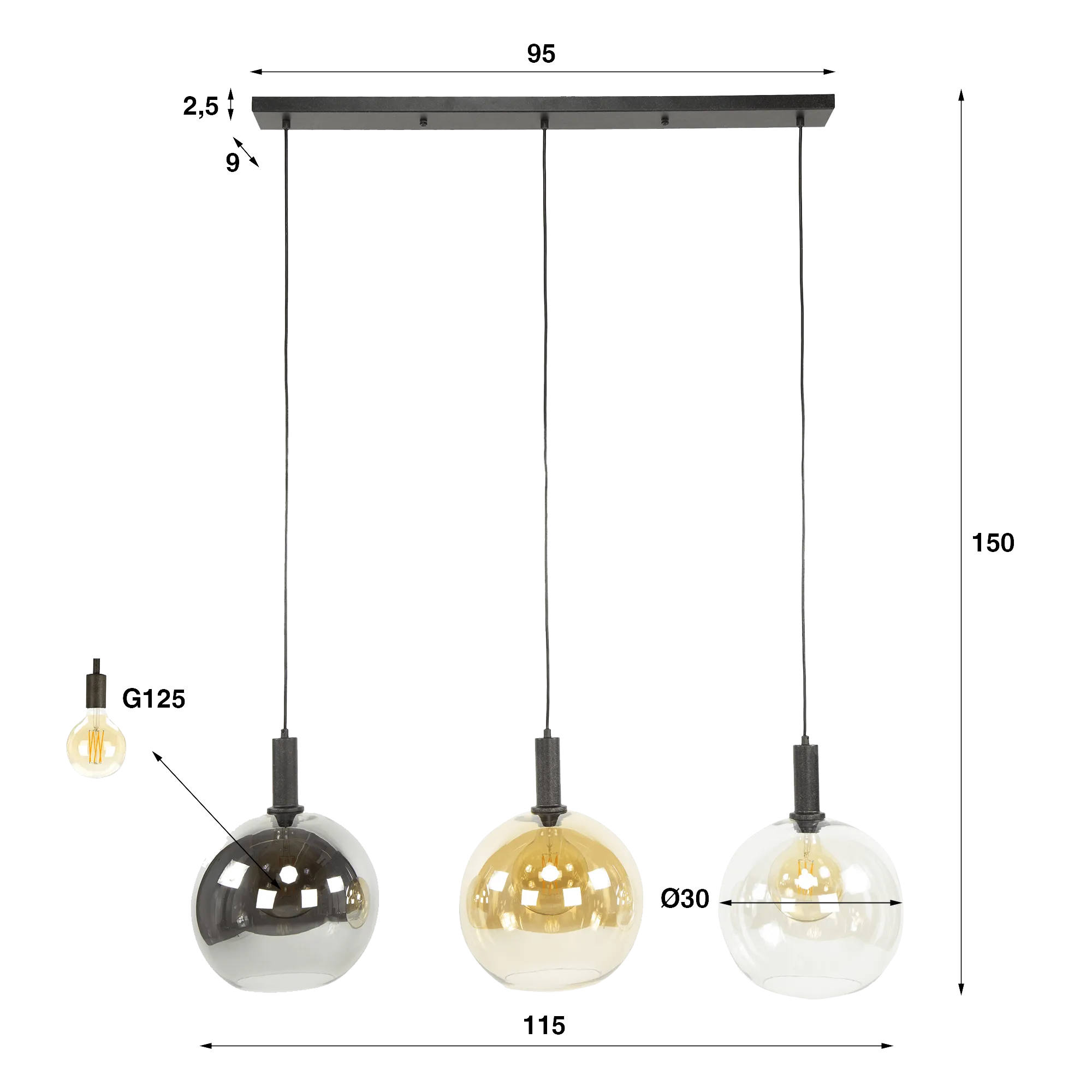 Avec le luminaire en suspension avec abat-jour sphériques en verre tricolore Sfera, nous avons souhaité créer un luminaire où la lumière devient un véritable paysage visuel. Nos designers ont imaginé trois abat-jour sphériques en verre soufflé, chacun doté d’une teinte différente — fumé, ambré et transparent — afin d’offrir un jeu de profondeurs et de reflets qui évolue au fil de la journée. Dotées d'une ampoule à filament LED G125 (non incluse) et suspendues à une barre de 95 cm, ces sphères d’un diamètre généreux d’environ 30 cm instaurent une présence douce et contemporaine sans jamais dominer l’espace.