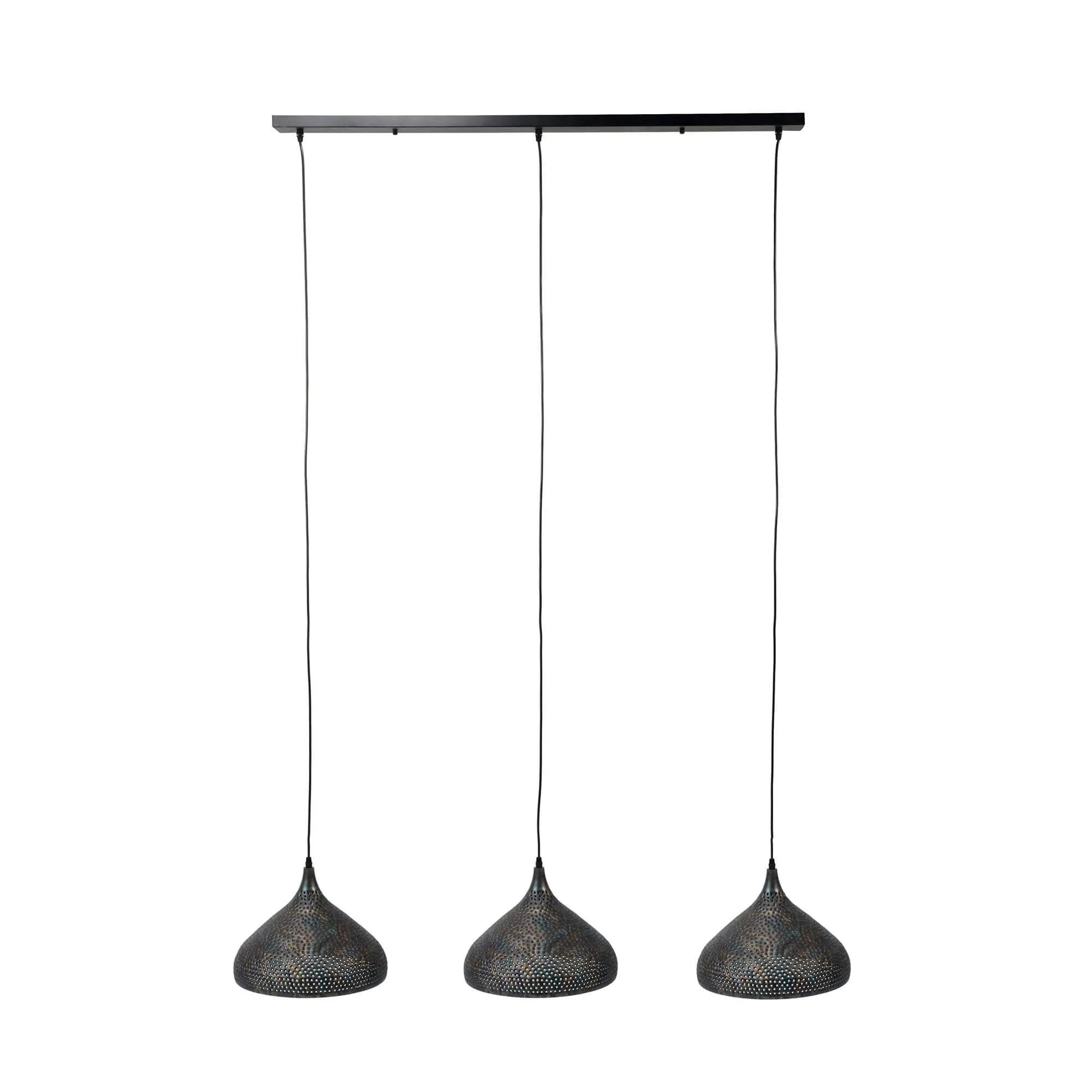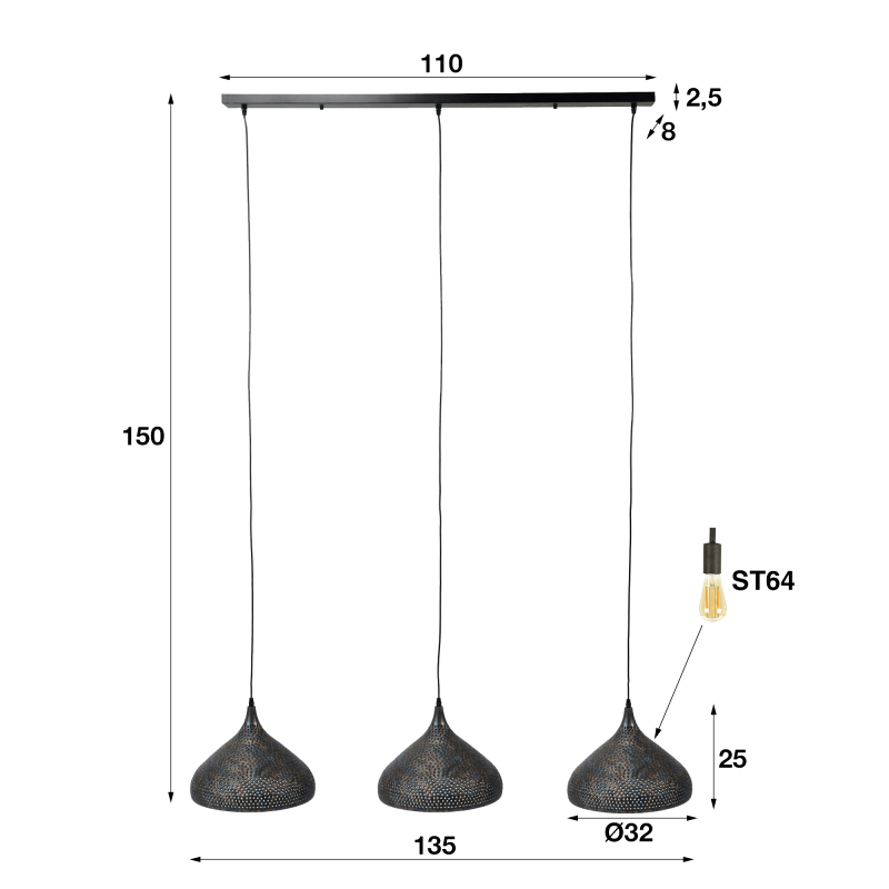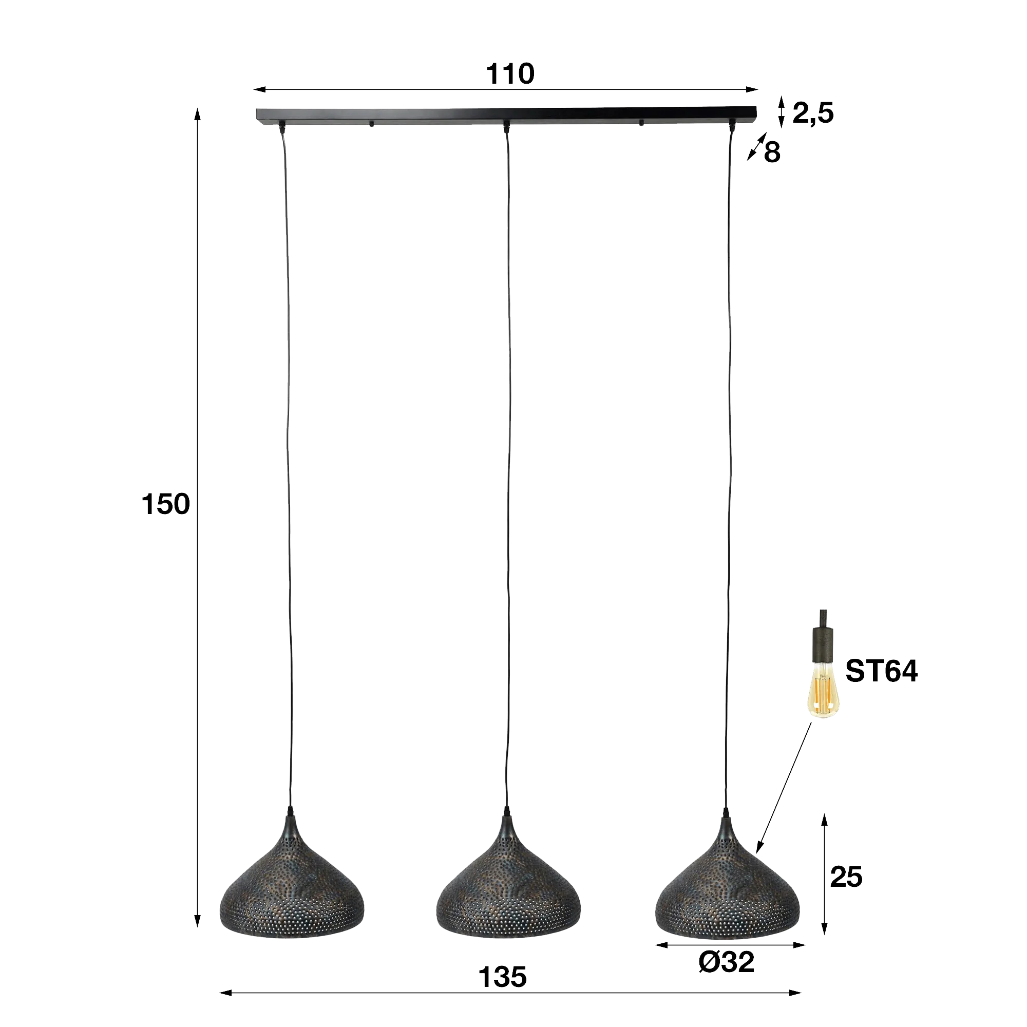 Nous avons souhaité proposer un luminaire industriel à suspendre en métal qui ne soit pas seulement décoratif, mais qui accompagne réellement le quotidien. Les trois abat-jour, d’un diamètre d’environ 32 cm et d’une hauteur de 25 cm chacun, sont suspendus sur une barre discrète de 110 cm. Cette composition apporte une présence affirmée au-dessus d’une table, tout en conservant une grande légèreté visuelle. La hauteur réglable jusqu’à 150 cm permet de trouver facilement l’équilibre idéal en fonction de l’espace.