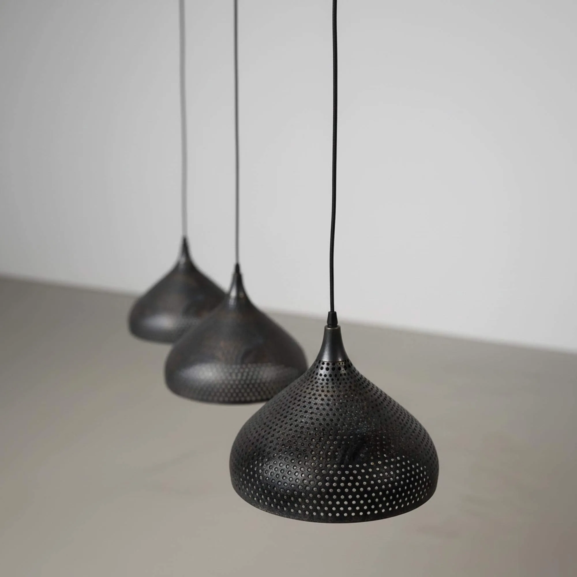 Le métal, matériau central de notre gamme Forma, a été patiné à la main pour obtenir une texture subtile, légèrement bronze, qui gagne encore en profondeur lorsqu’elle capture la lumière générée par l'ampoule ST64 (non incluse) que nous avons sélectionnée. Nous tenions à ce que chaque pièce reflète un savoir-faire authentique : la fabrication artisanale rend chaque perforation unique, et c’est précisément cette irrégularité maîtrisée qui donne au luminaire son caractère.