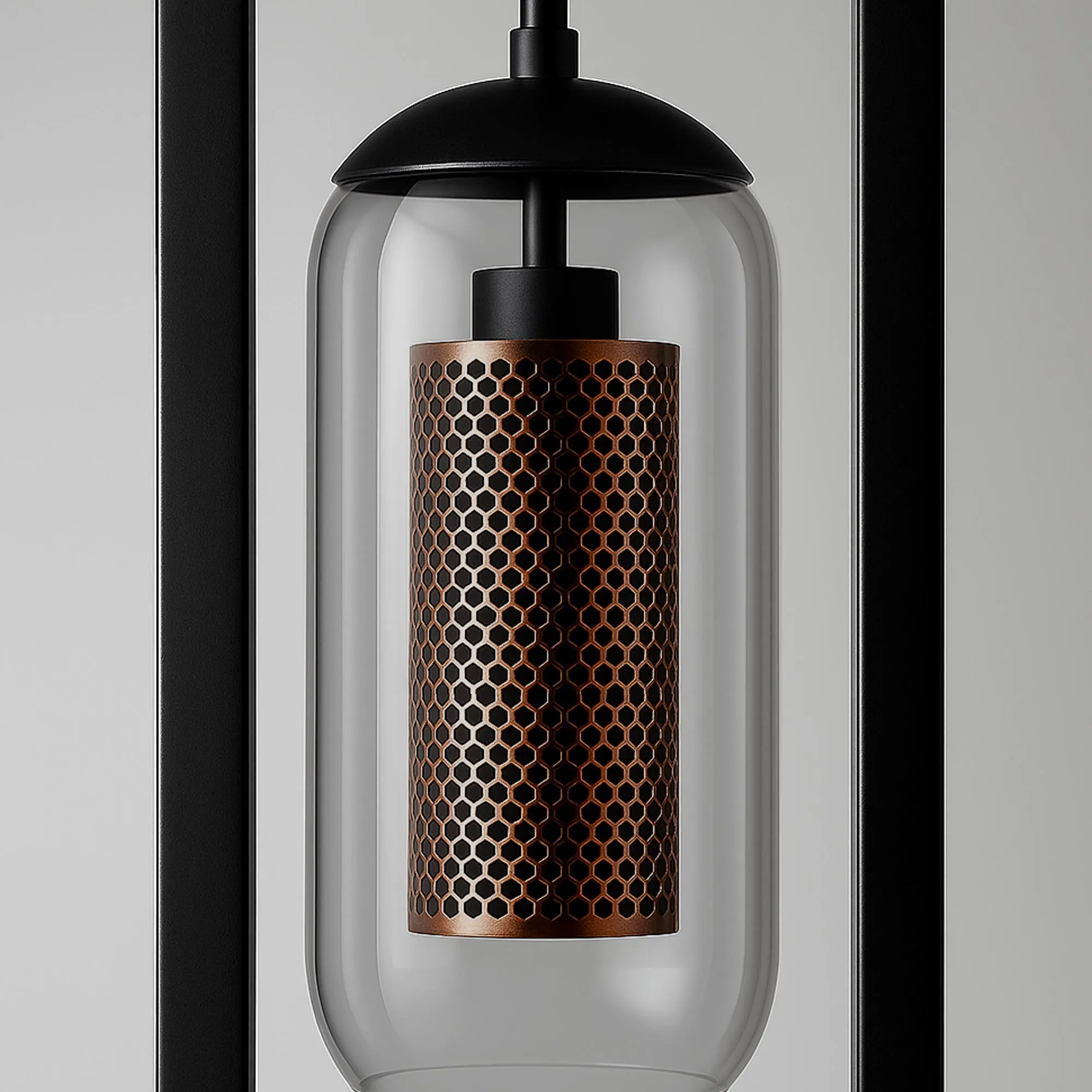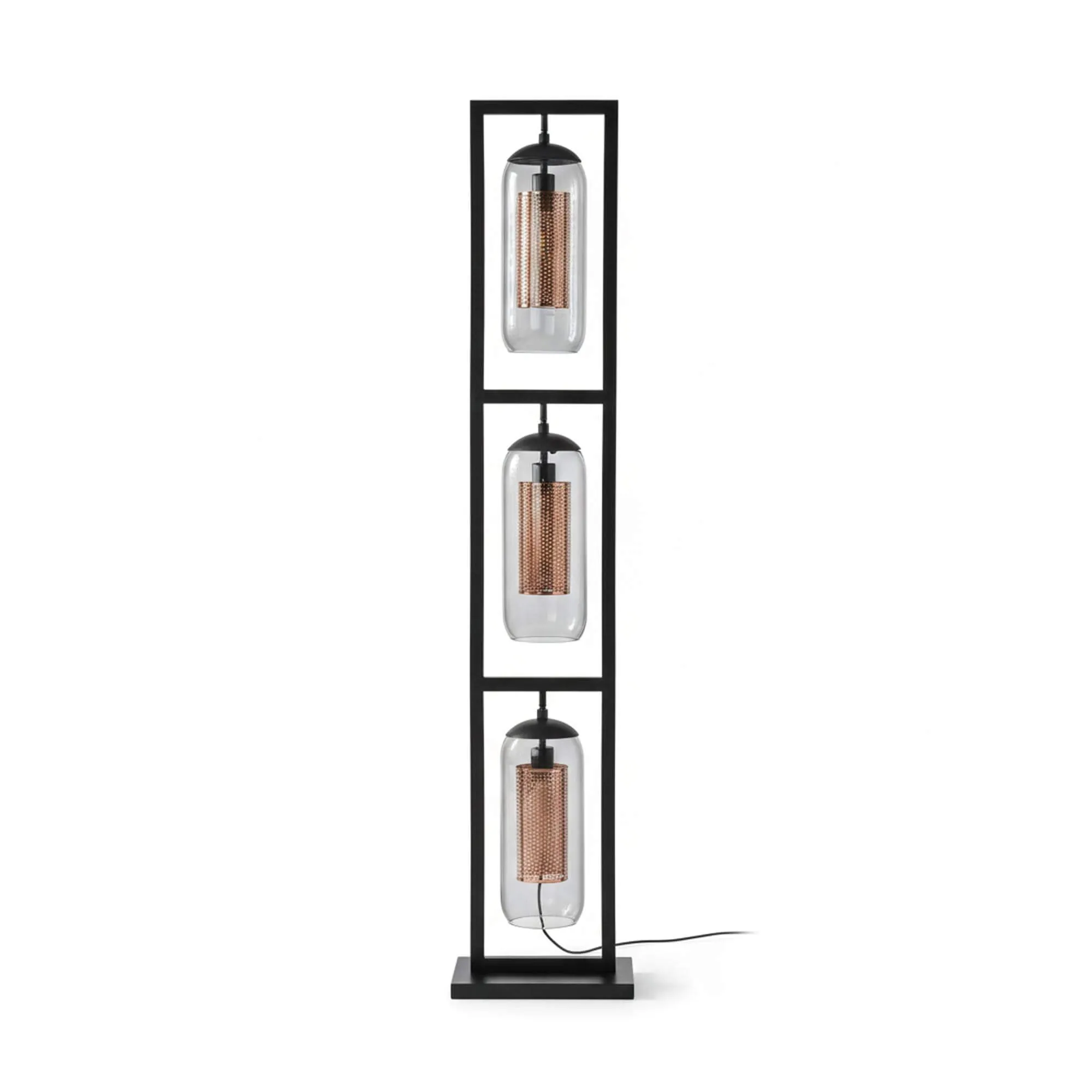 Chaque cylindre de ce lampadaire de saleon avec abat-jours en verre fumé soufflé accueille une grille métallique cuivrée, que nous avons travaillée avec une trame hexagonale pour obtenir un jeu de reflets singulier. Ce contraste entre la transparence du verre et la profondeur du métal patiné est au cœur de l’identité de la collection Brila. Avec ses 158 cm de hauteur et sa base de 32 × 23 cm, le lampadaire de saleon avec abat-jours en verre fumé soufflé reste stable tout en conservant une silhouette élancée, facile à intégrer dans un coin lecture ou près d’un canapé.