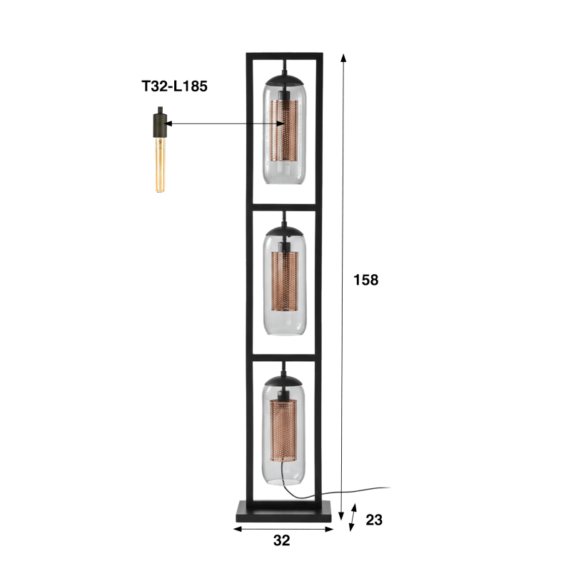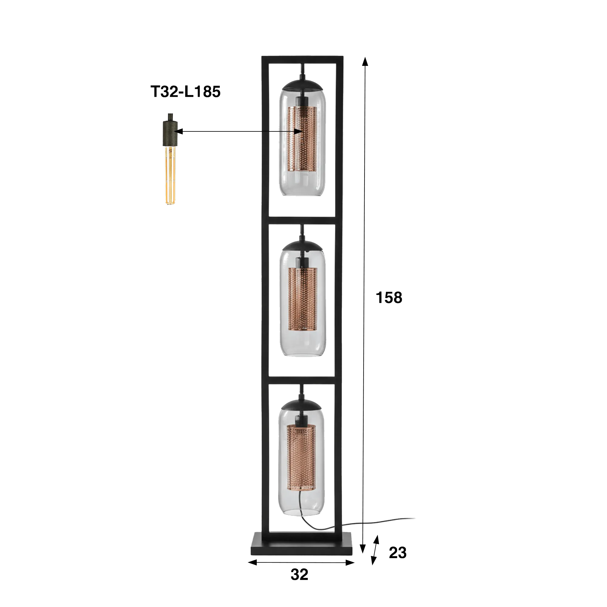 Nos designers ont longuement ajusté les proportions des trois modules lumineux pour créer un rythme visuel harmonieux. Les abat-jours sont alignés dans une structure qui laisse circuler la lumière, et la hauteur des différents éléments permet de diffuser un éclairage enveloppant sans éblouir. L’installation de ce lampadaire de saleon avec abat-jours en verre fumé soufflé est simple : Il suffit d'assembler les composants de chaque lampe et de venir les poser sur la structure. Nous avons choisi de travailler avec des ampoules T32-L185 (non incluses), que nous avons sélectionnées pour leur intensité et de la teinte chaleureuse.