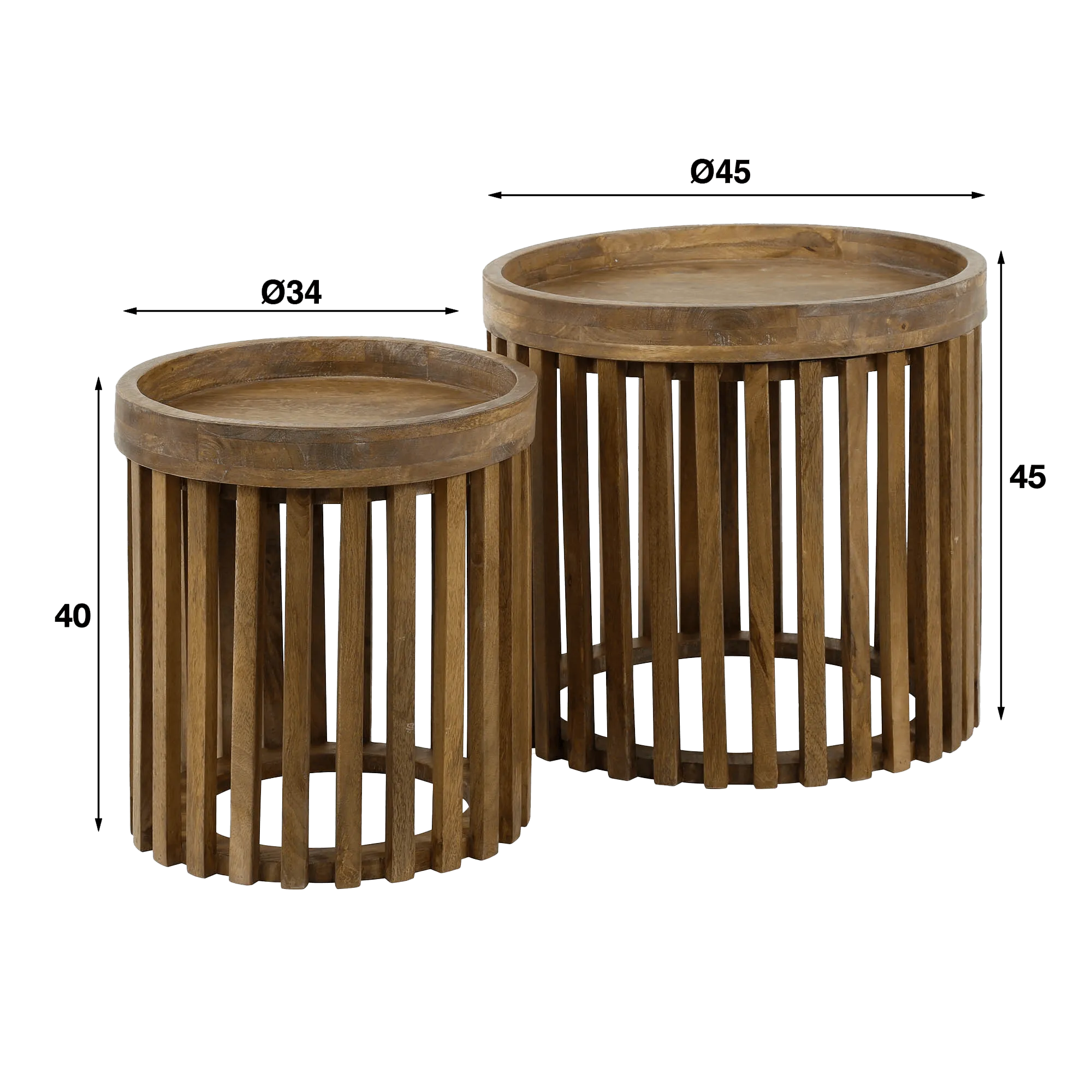 La conception de cette table d'appoint en bois de manguier massif en deux formats complémentaires permet une grande liberté d’usage. La table la plus basse, de 40 cm de hauteur pour un diamètre de 34 cm, se glisse naturellement près d’un canapé ou d’un fauteuil. La seconde, plus élancée, atteint environ 45 cm de haut avec un plateau de 45 cm de diamètre, idéale pour accueillir une tasse, un livre ou un objet décoratif. Leur structure ajourée, rythmée par des lattes verticales, allège visuellement l’ensemble tout en assurant une excellente stabilité.